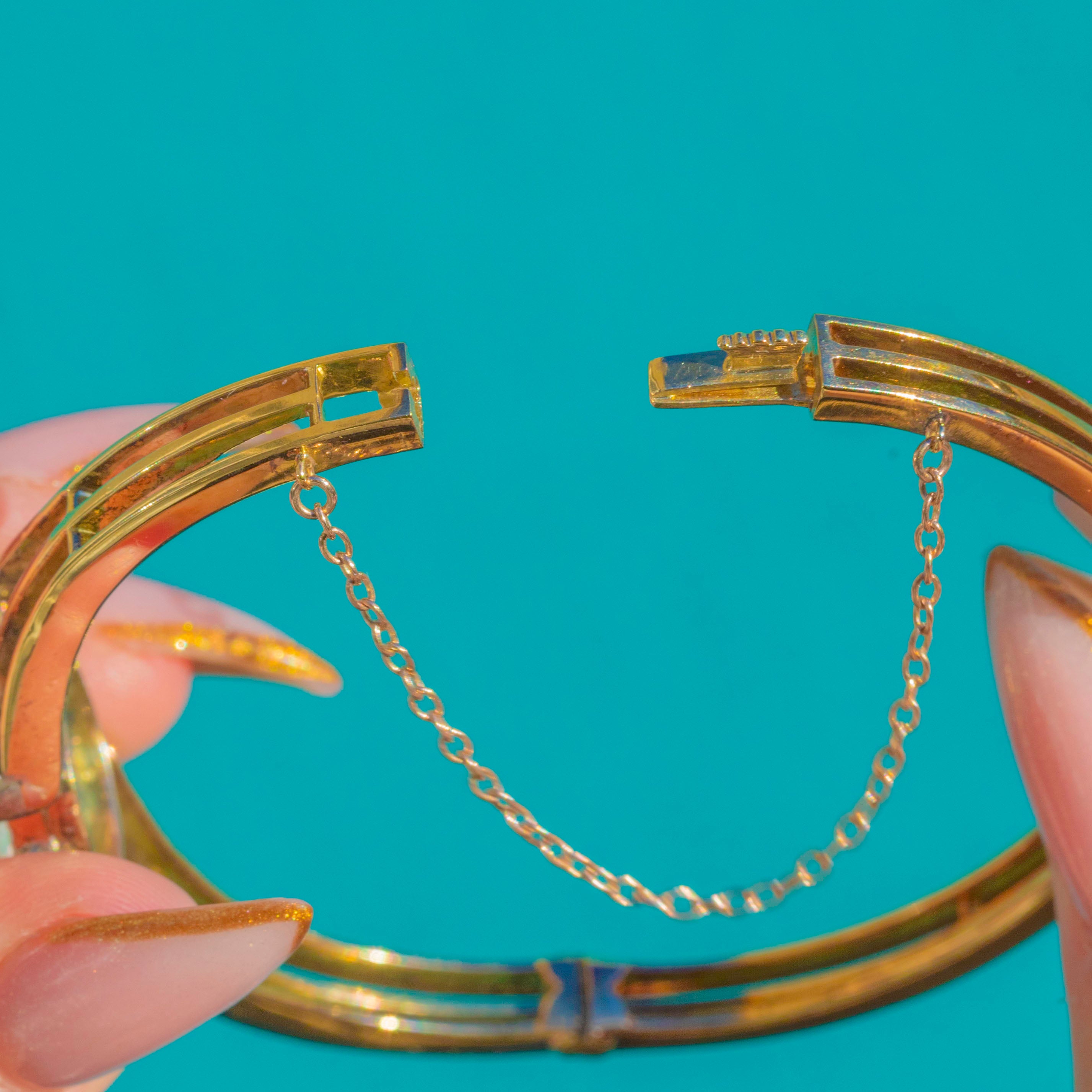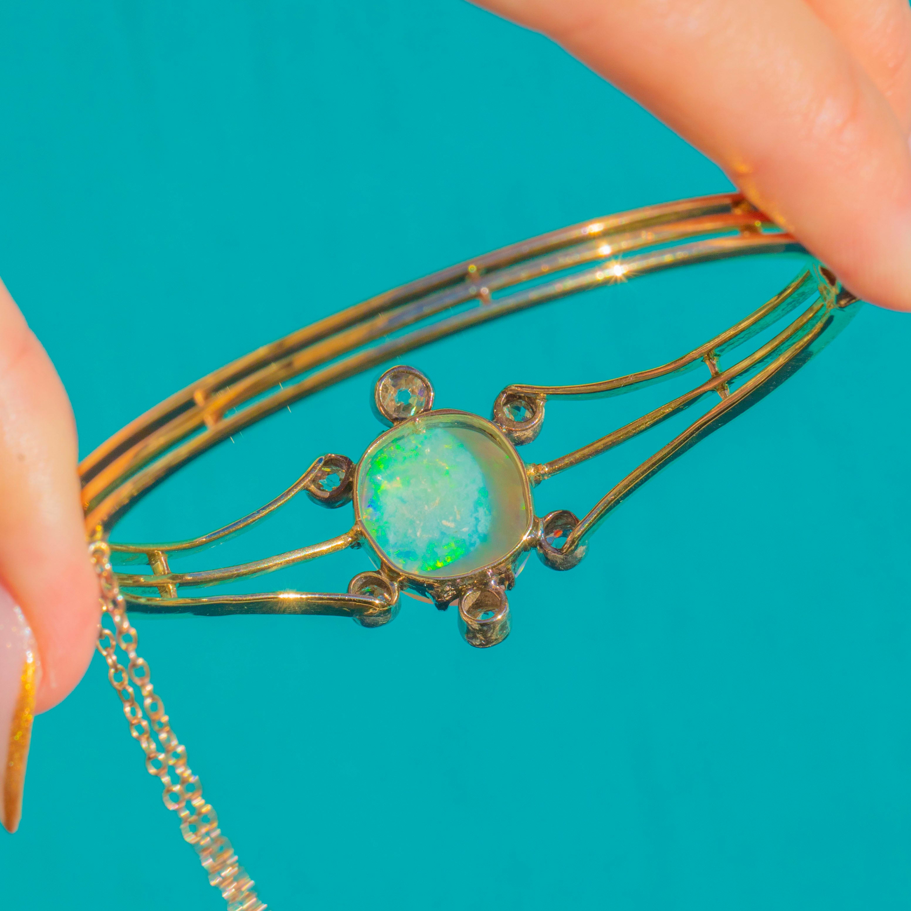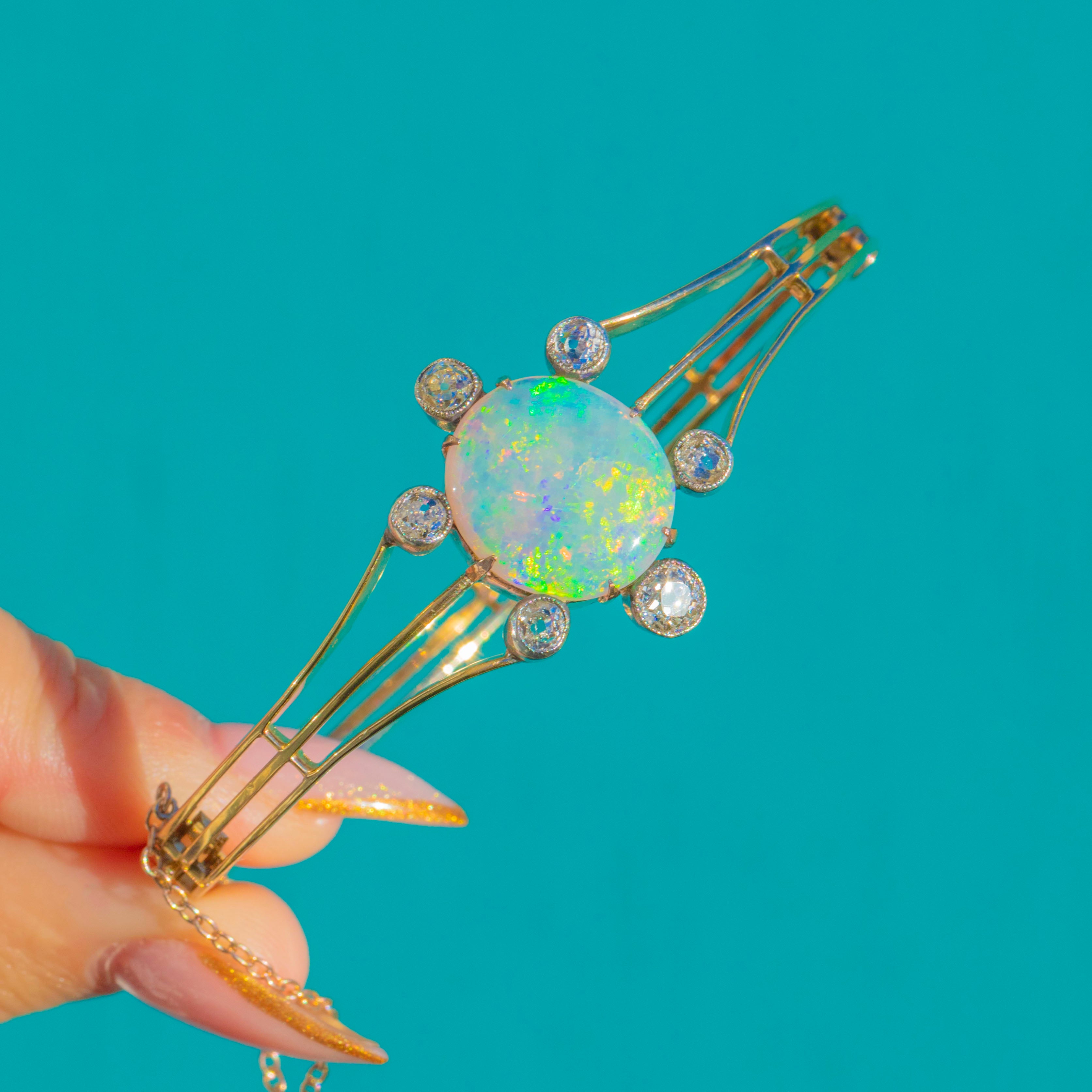 EXCELLENT: The Opal is luminous with no chips or abrasions, and the Diamonds are bright and lively. The Gold is buttery and robust with only minimal antique wear. The safety chain is intact and the clasp secure, allowing you to enjoy wearing this Edwardian Opal bangle with utmost confidence.