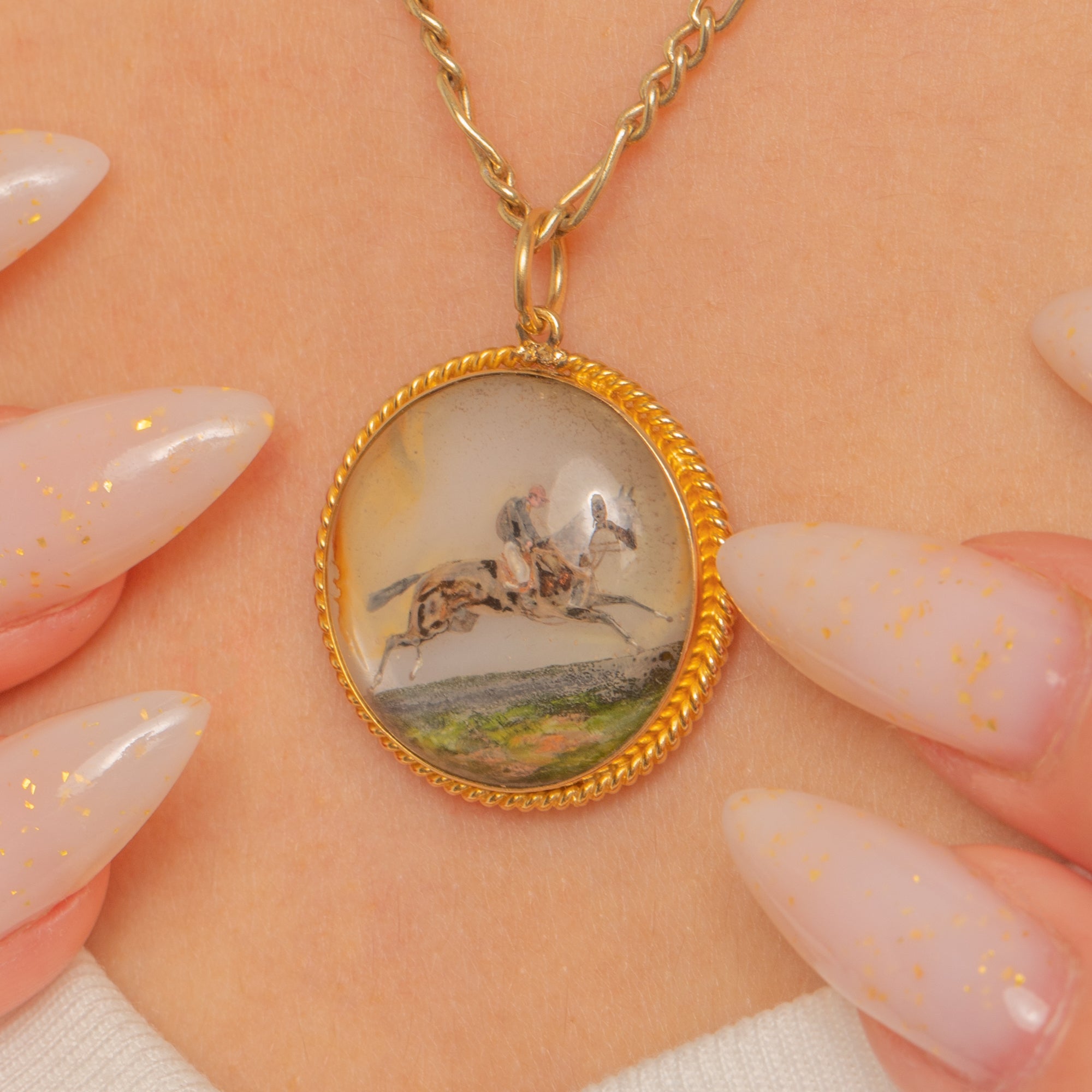 A charming Victorian equestrian Essex Crystal pendant, finely carved in reverse intaglio to depict a jockey mid-gallop. The miniature comes alive beneath the domed crystal, its depth enhanced by a luminous Mother of Pearl backing that adds a soft iridescence and a sense of motion to the scene.