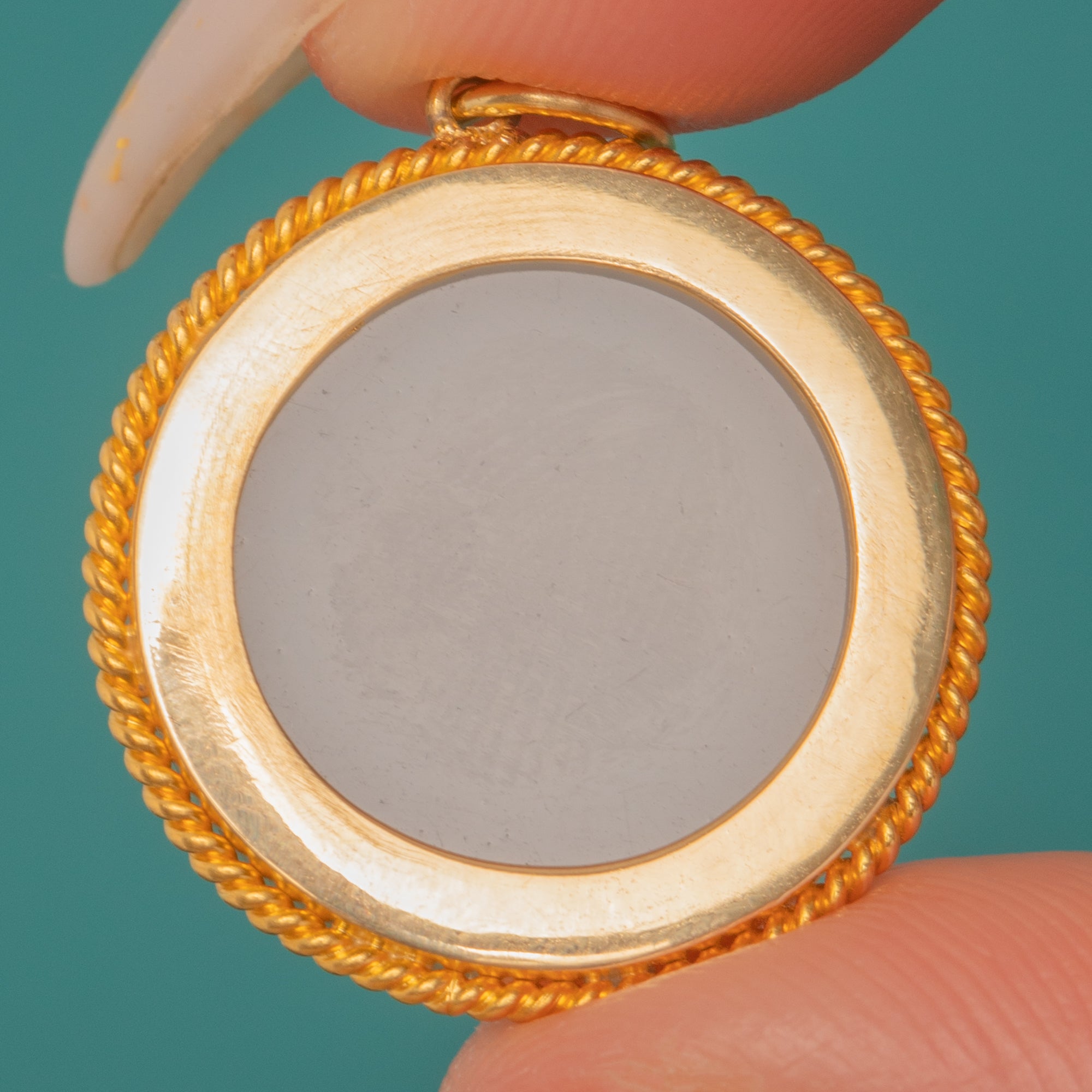 EXCELLENT: The reverse intaglio Essex Crystal is crisp with only light surface marks under magnification; the Mother of Pearl backing is intact with minimal, age-related speckling. The 18ct Gold rope bezel and soldered bail are secure and well preserved, with a neat area of solder visible at the bail. Overall, the pendant has been well cared for with gentle wear commensurate with age.