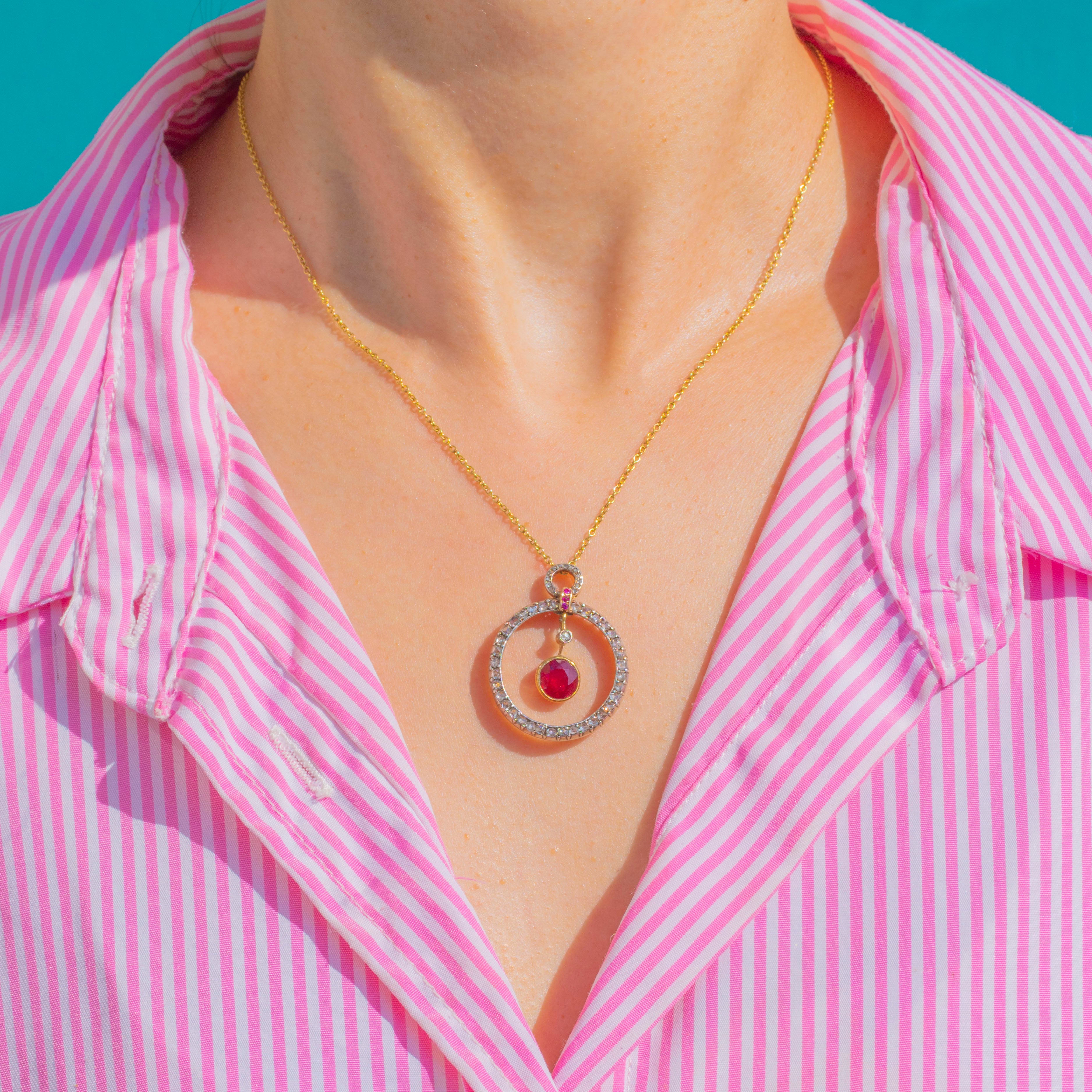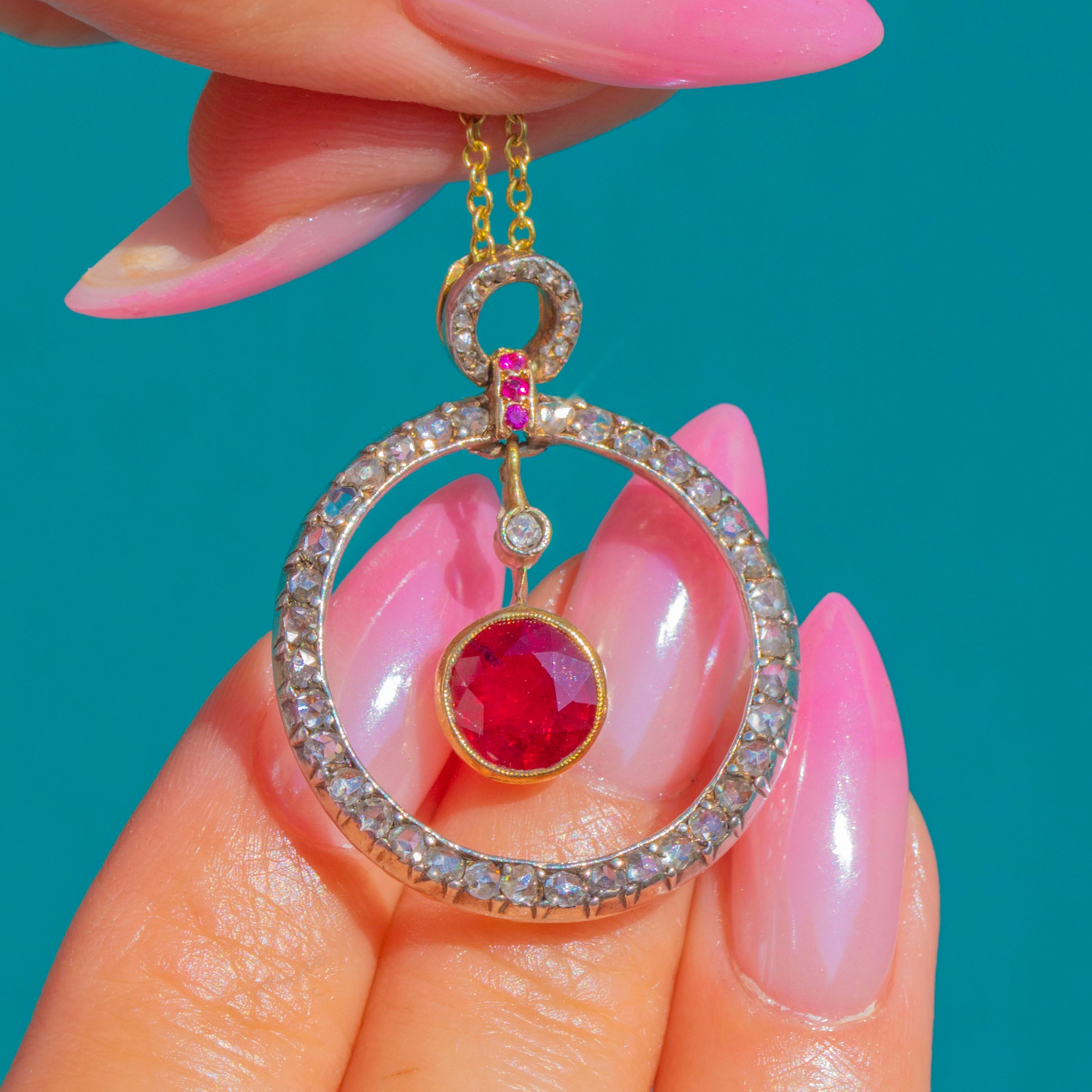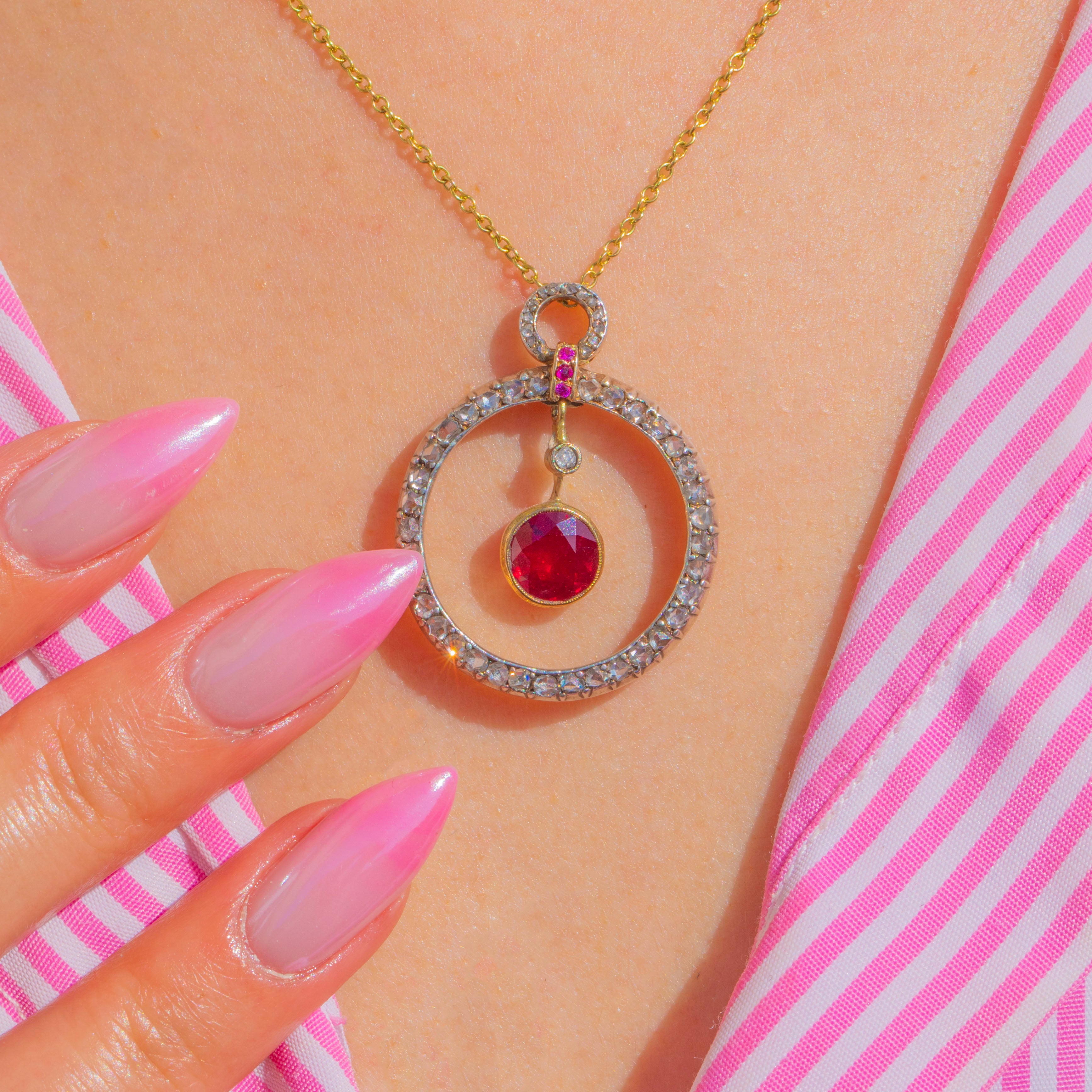 A luminous Belle Époque treasure, this articulated pendant is crafted in 18ct Gold and set with a sumptuous Natural Ruby of approximately 2.00ct. Framed by a halo of glittering Diamonds and finished with dainty Ruby accents at the bail, the design dances with light thanks to its multi-part construction and graceful inner drop. It’s an elegant, romantic jewel with that delectable turn-of-the-century poise.