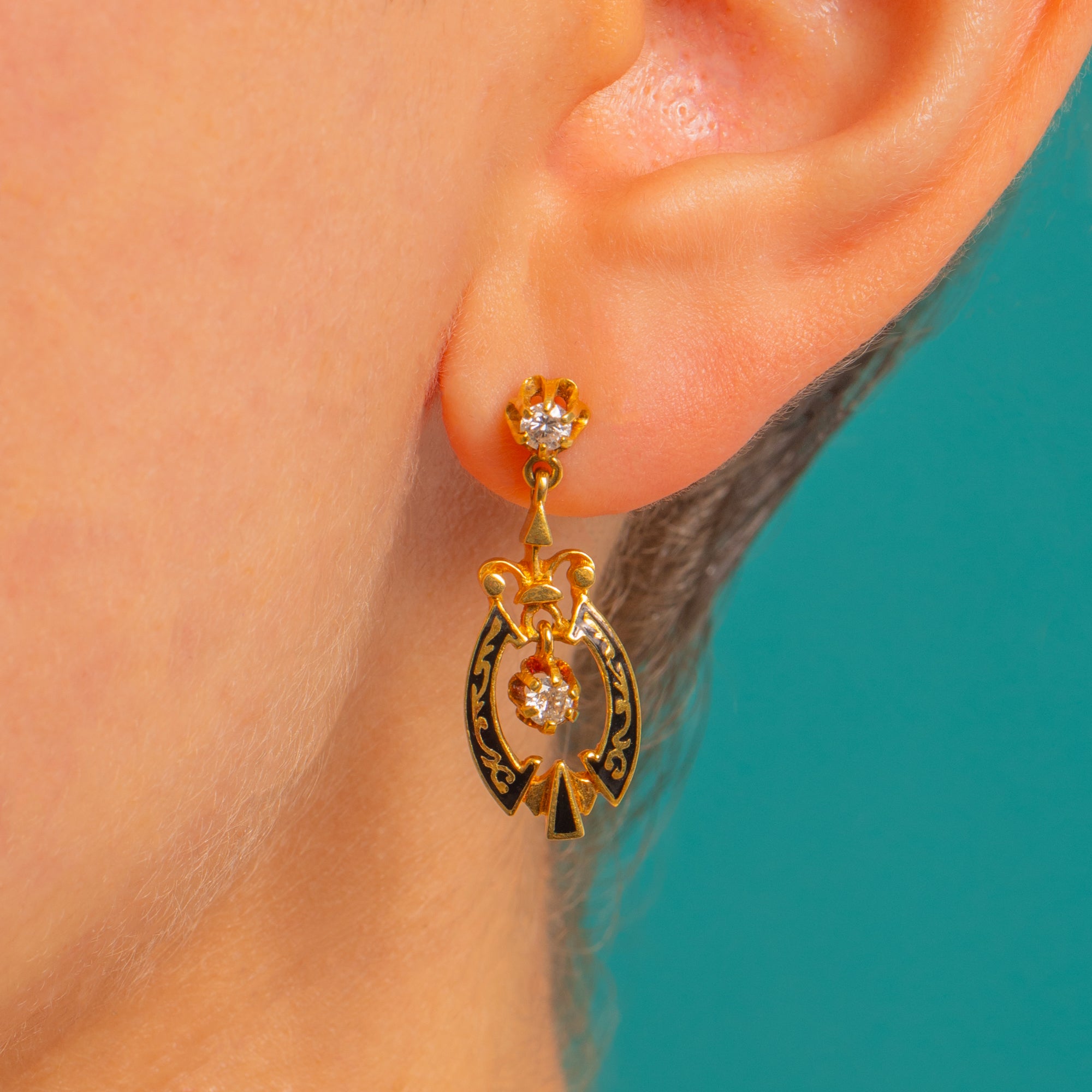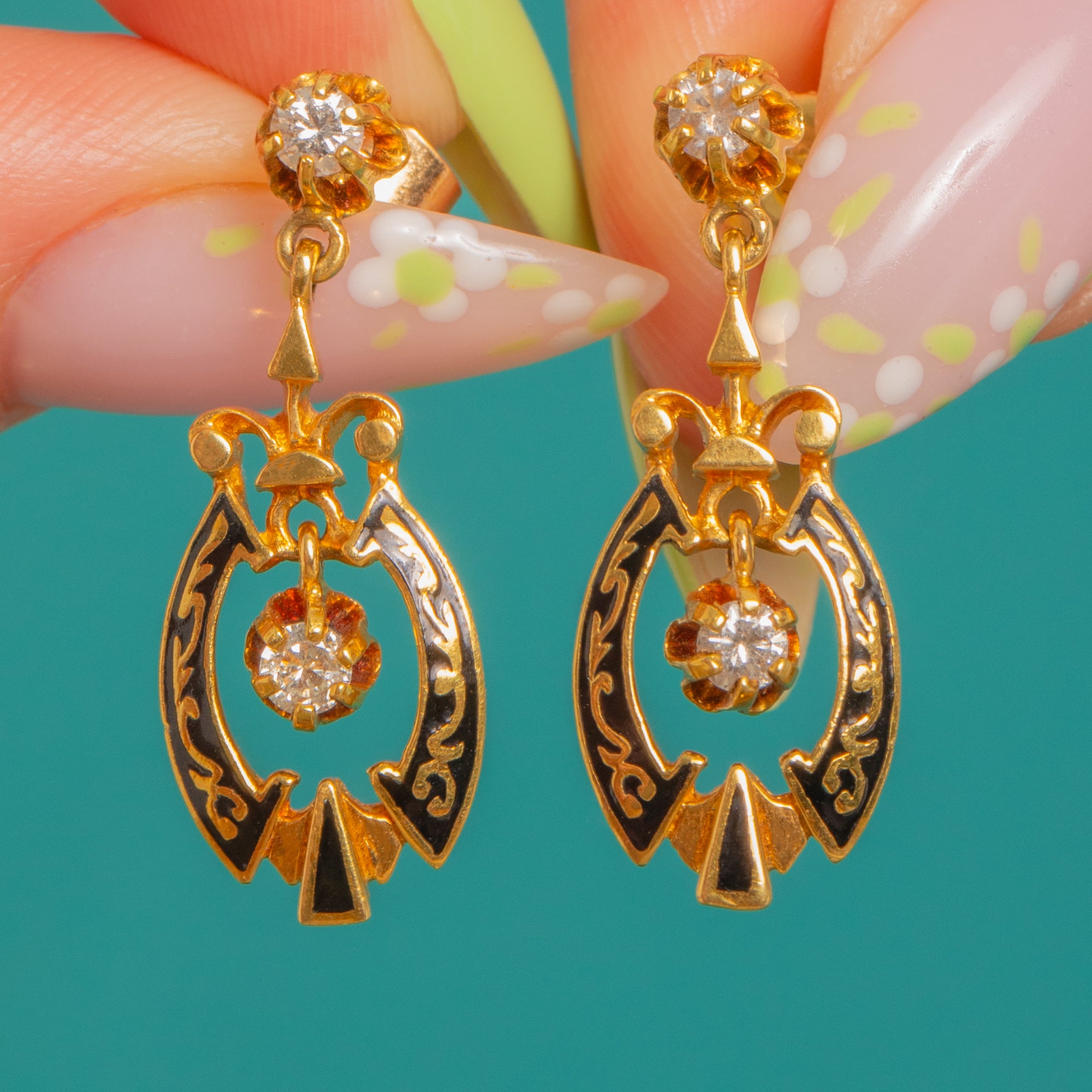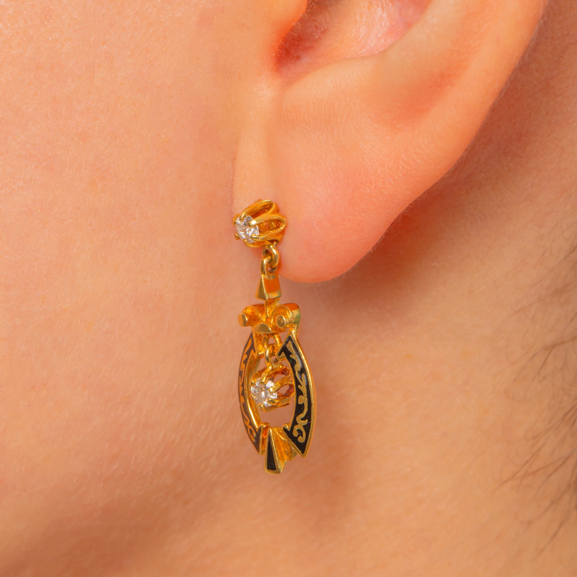 Refined and romantic, these Victorian earrings marry glossy Black Enamel with the rich glow of 18ct Gold. Each petite articulated drop is composed of a round Diamond at the stud and a second Diamond suspended within an elegant openwork cartouche, the inky Enamel panels framing the sparkle beautifully.