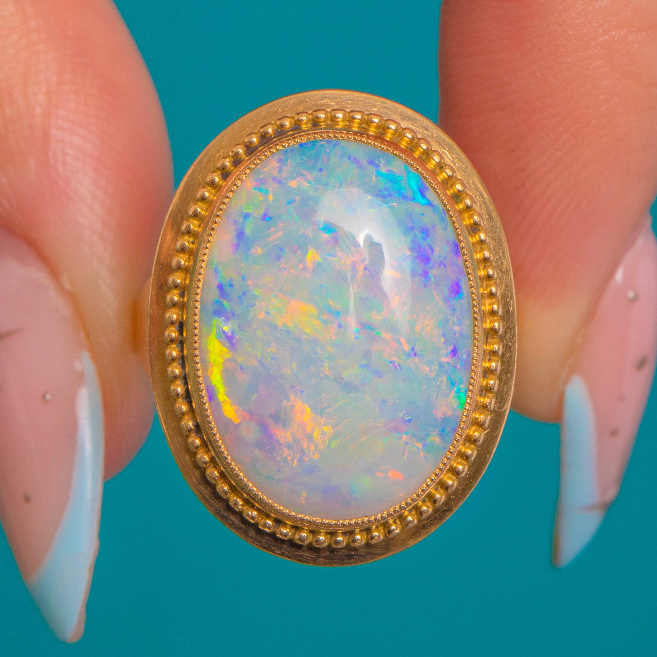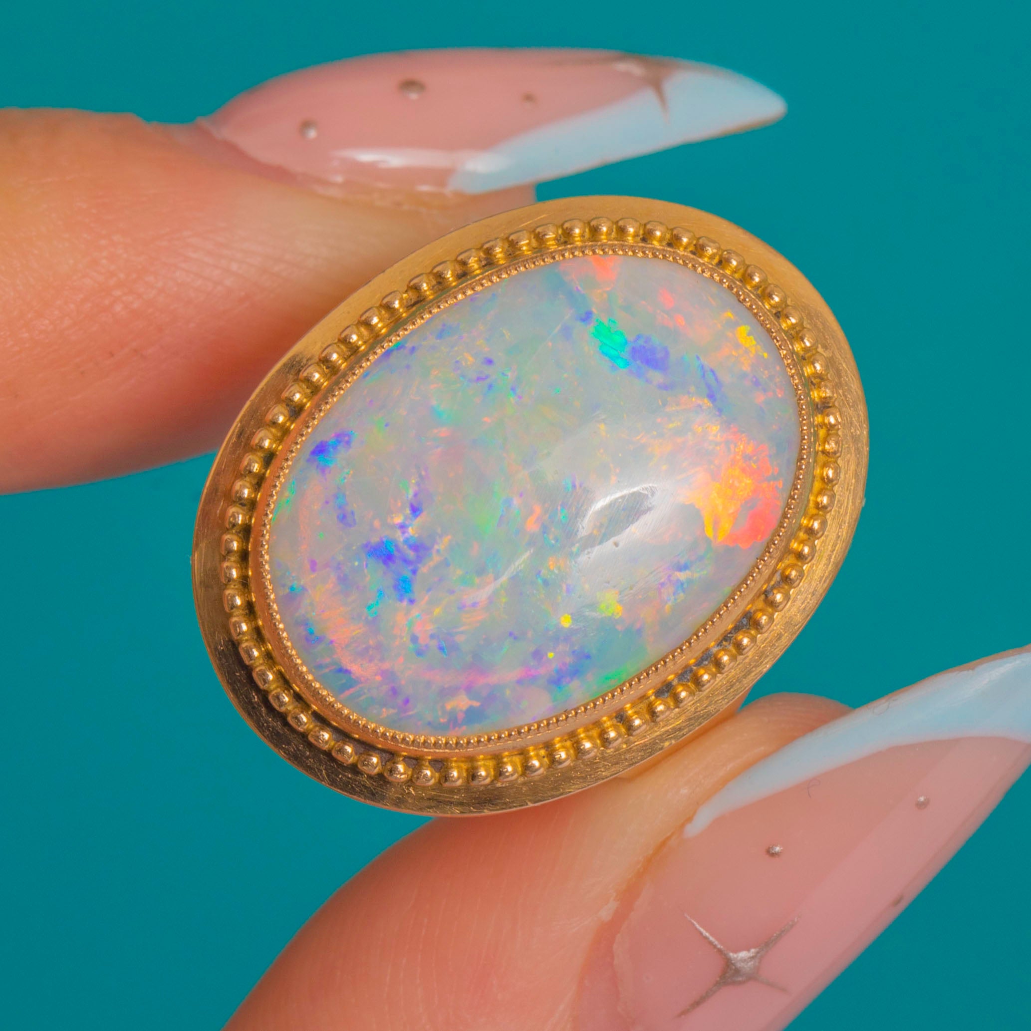 A luminous celebration of colour and craft, this French 18ct Gold cocktail ring showcases a captivating Solid Opal of approximately 4.50ct. The oval cabochon shimmers with vivid play-of-colour—flashes of blue, green, orange, and lilac dance across the gemstone, creating a mesmerising, ever-changing display.