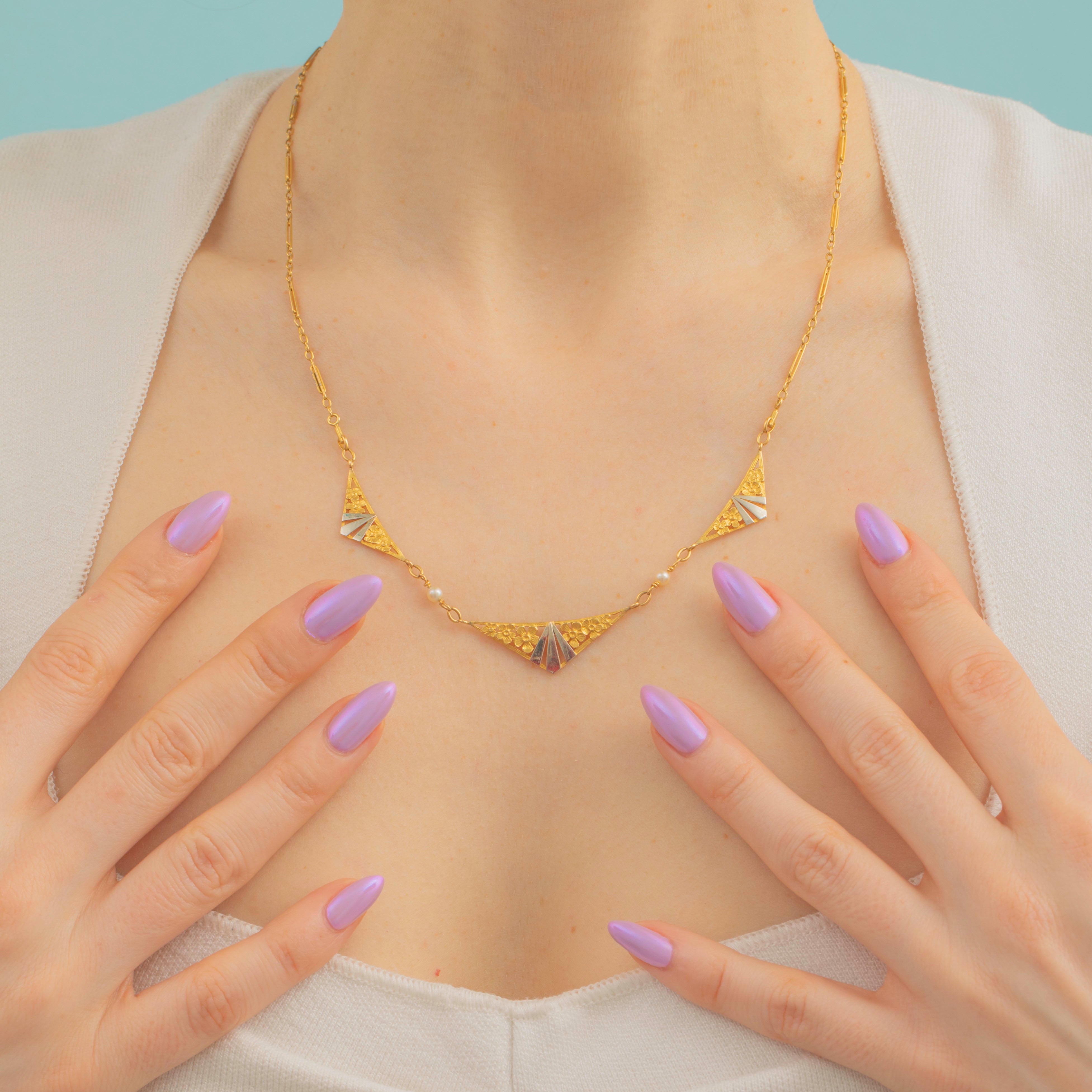You will get lost in the exquisite details of this French antique 18ct Gold Pearl floral lozenge necklace! Beautifully formed from buttery 18ct Gold and studded with iridescent Pearls, this Art Deco necklace perfectly captures the superb craftsmanship of the era.