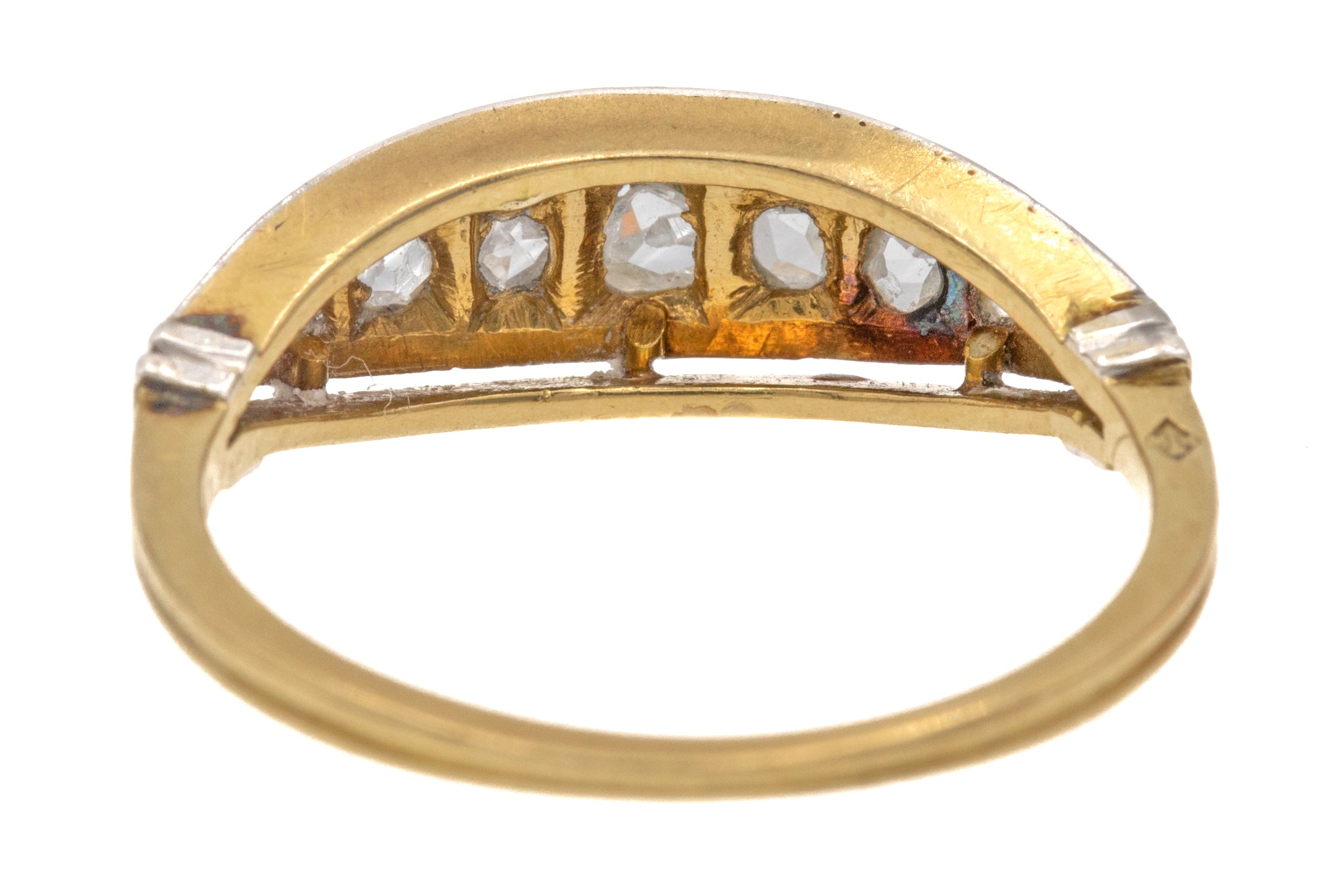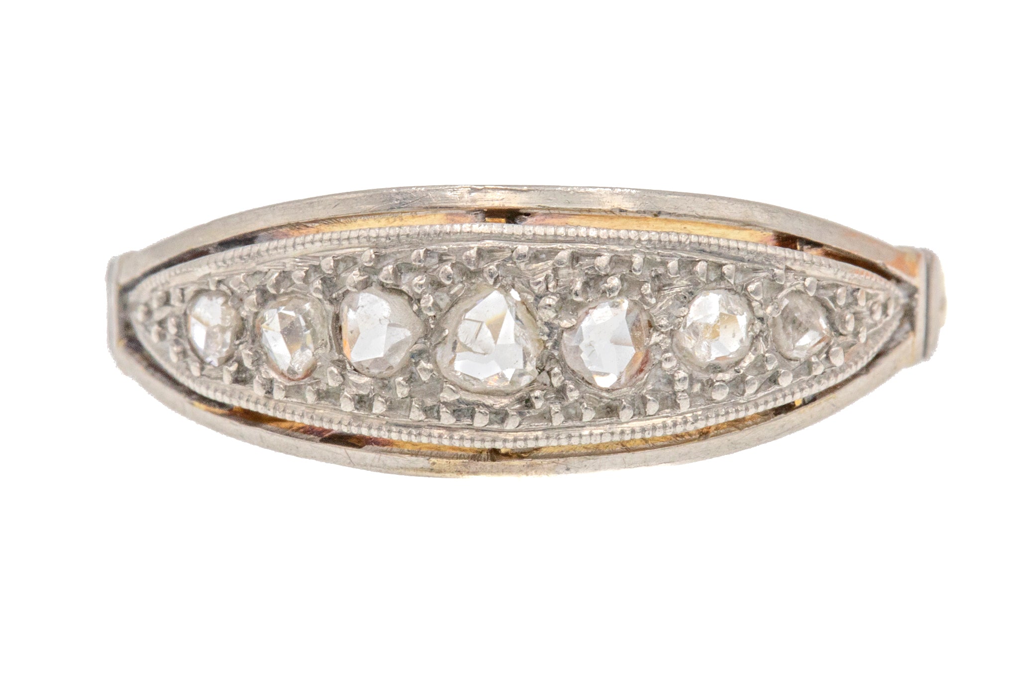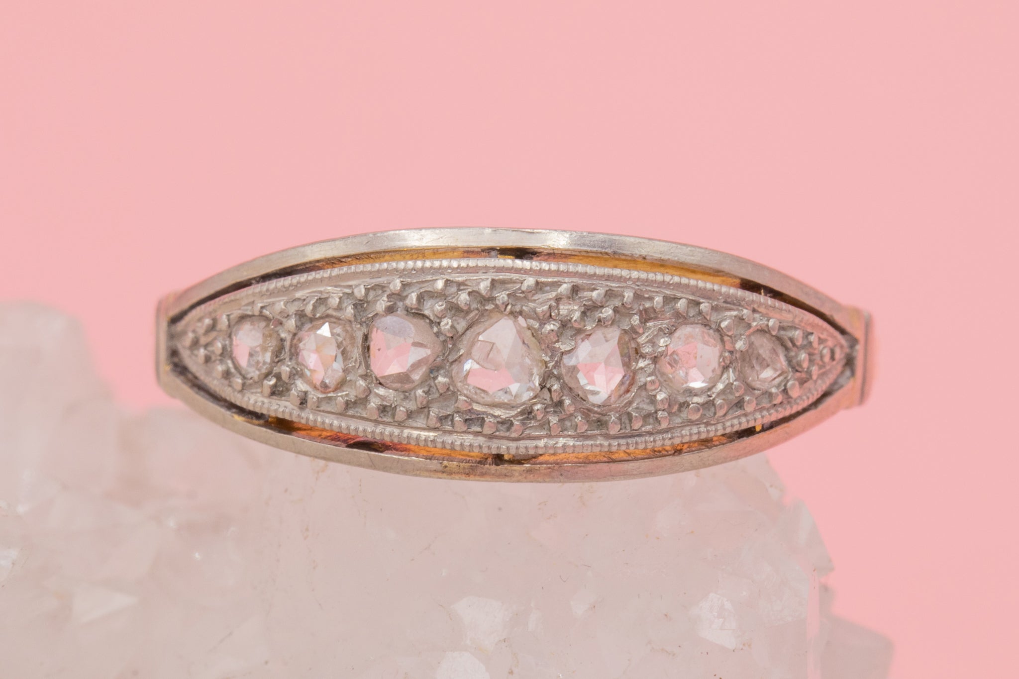 A fabulous French Art Deco 18ct Gold rose-cut Diamond ring. Crafted from the most luxurious materials - a richly saturated French 18ct Gold and cool, solid Platinum, she is studded with seven scintillating rose-cut Diamonds.