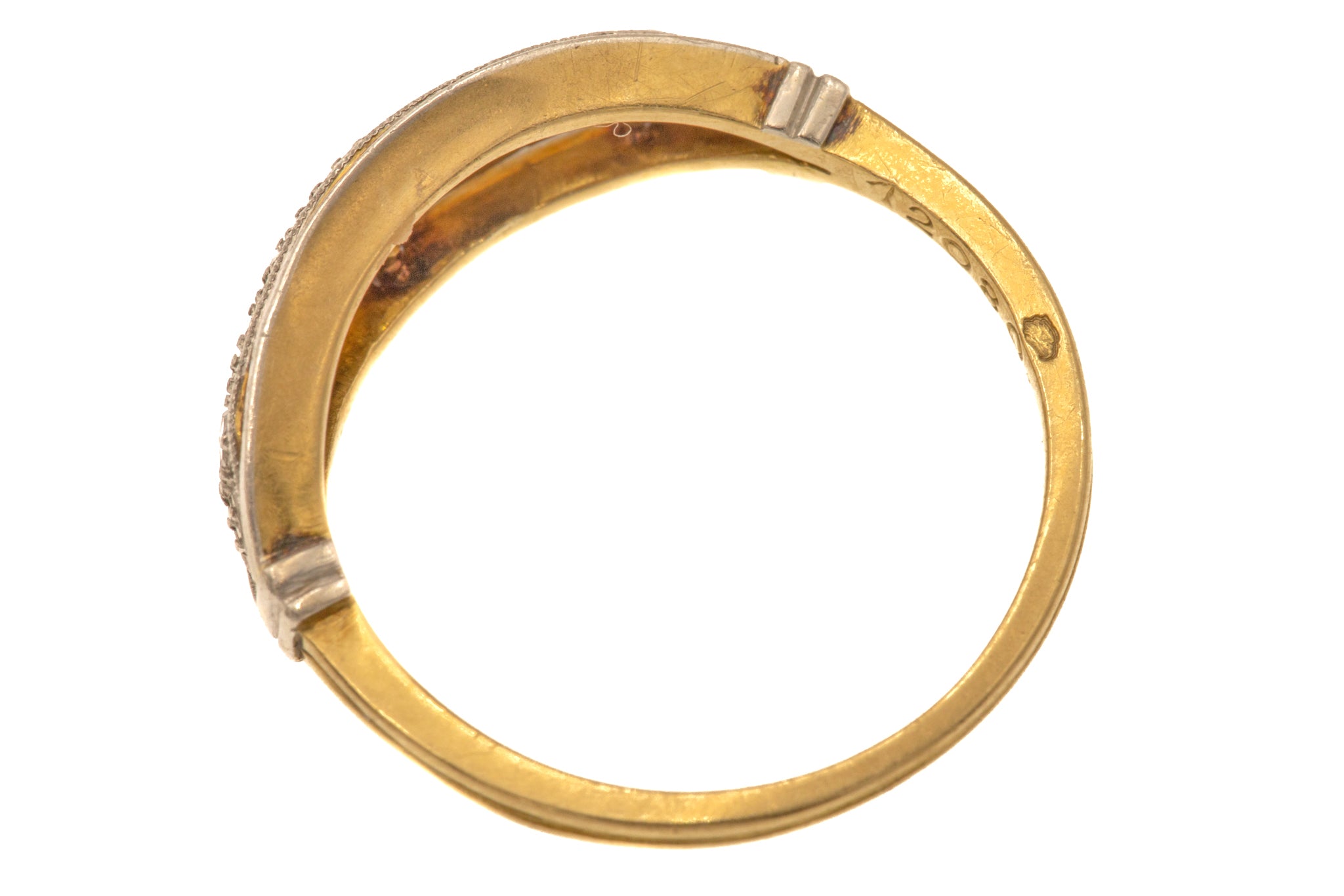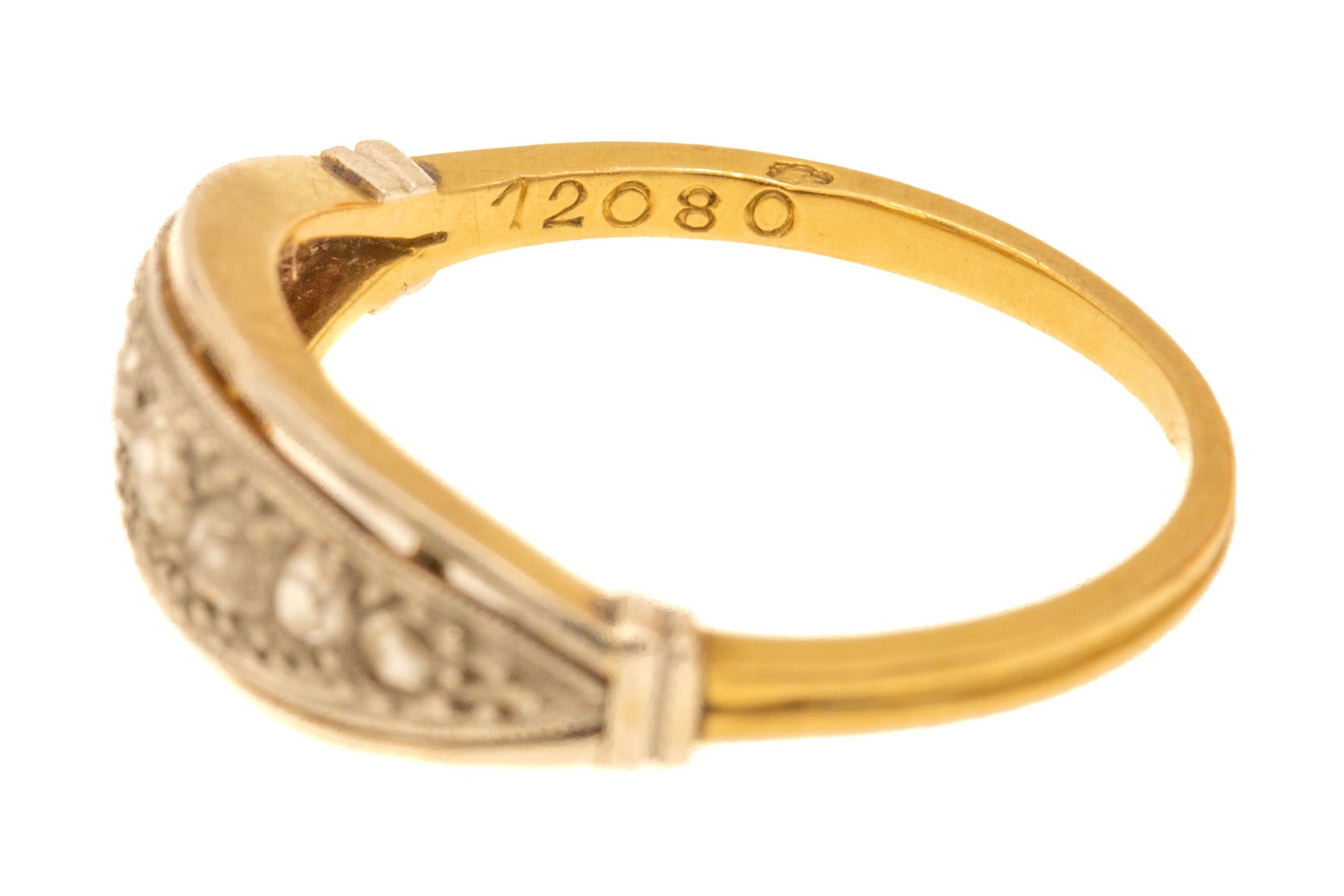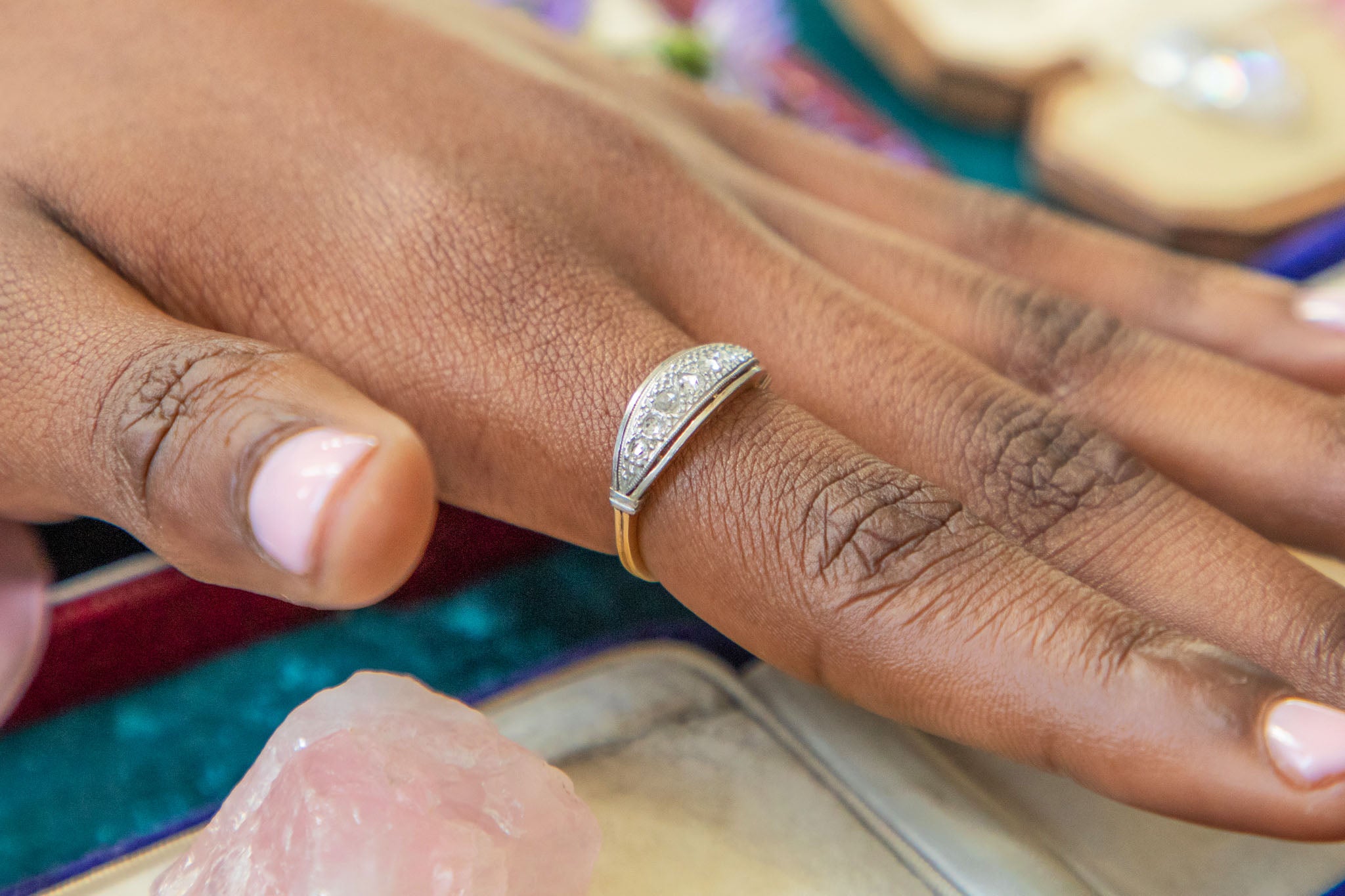 A fabulous French Art Deco 18ct Gold rose-cut Diamond ring. Crafted from the most luxurious materials - a richly saturated French 18ct Gold and cool, solid Platinum, she is studded with seven scintillating rose-cut Diamonds.