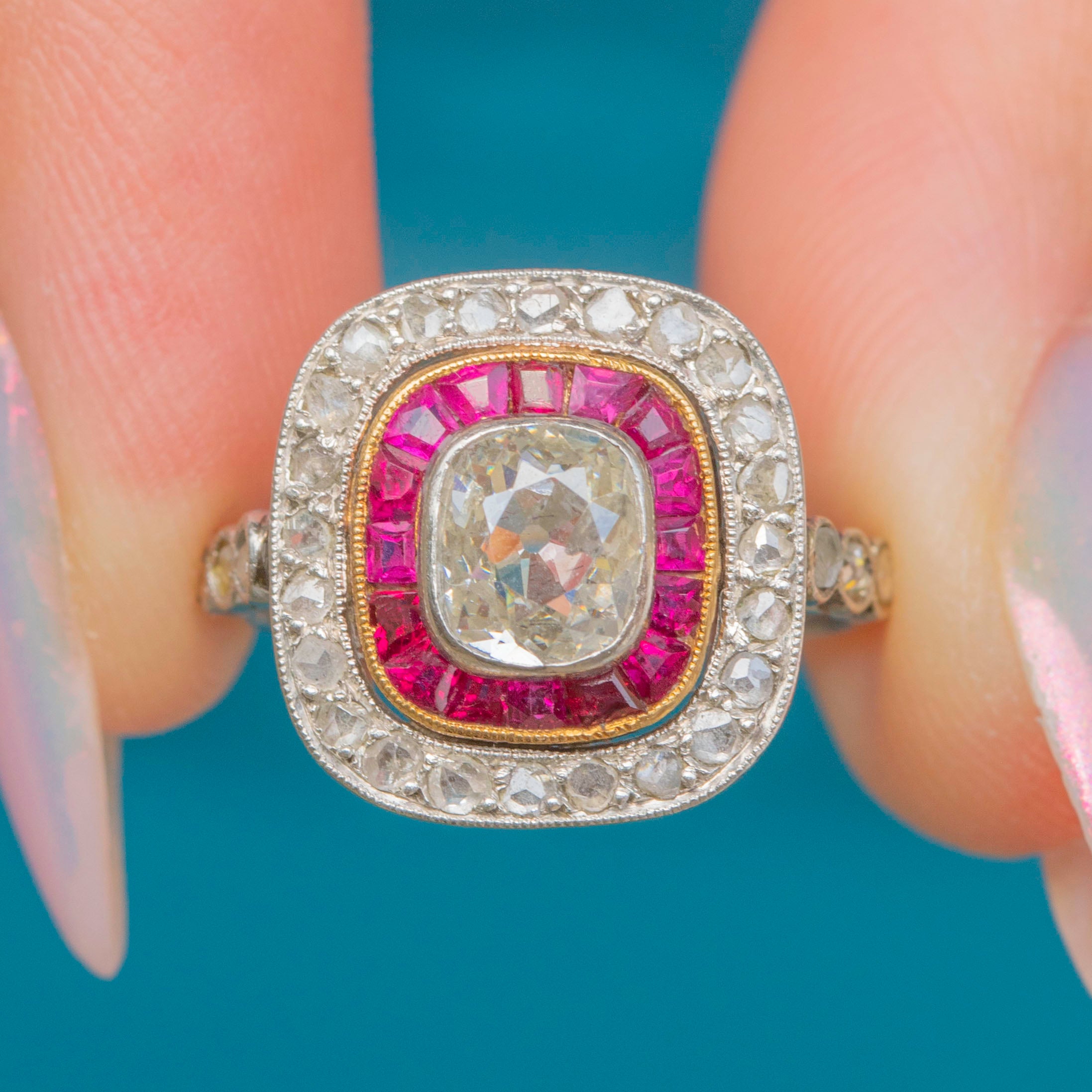 French Art Deco Platinum Ruby Diamond Cluster Ring, 1.00ct Old Mine Cut Diamond Centre