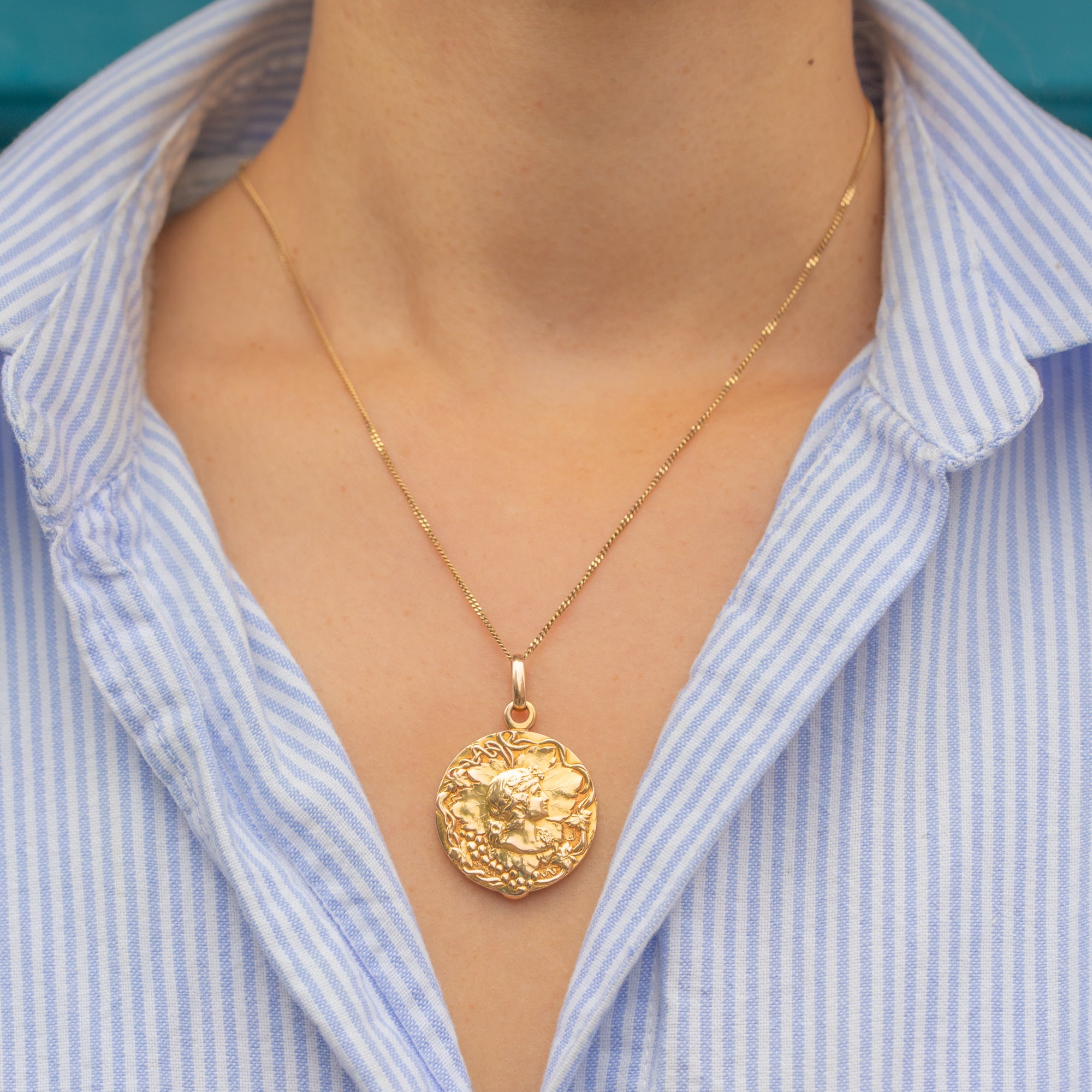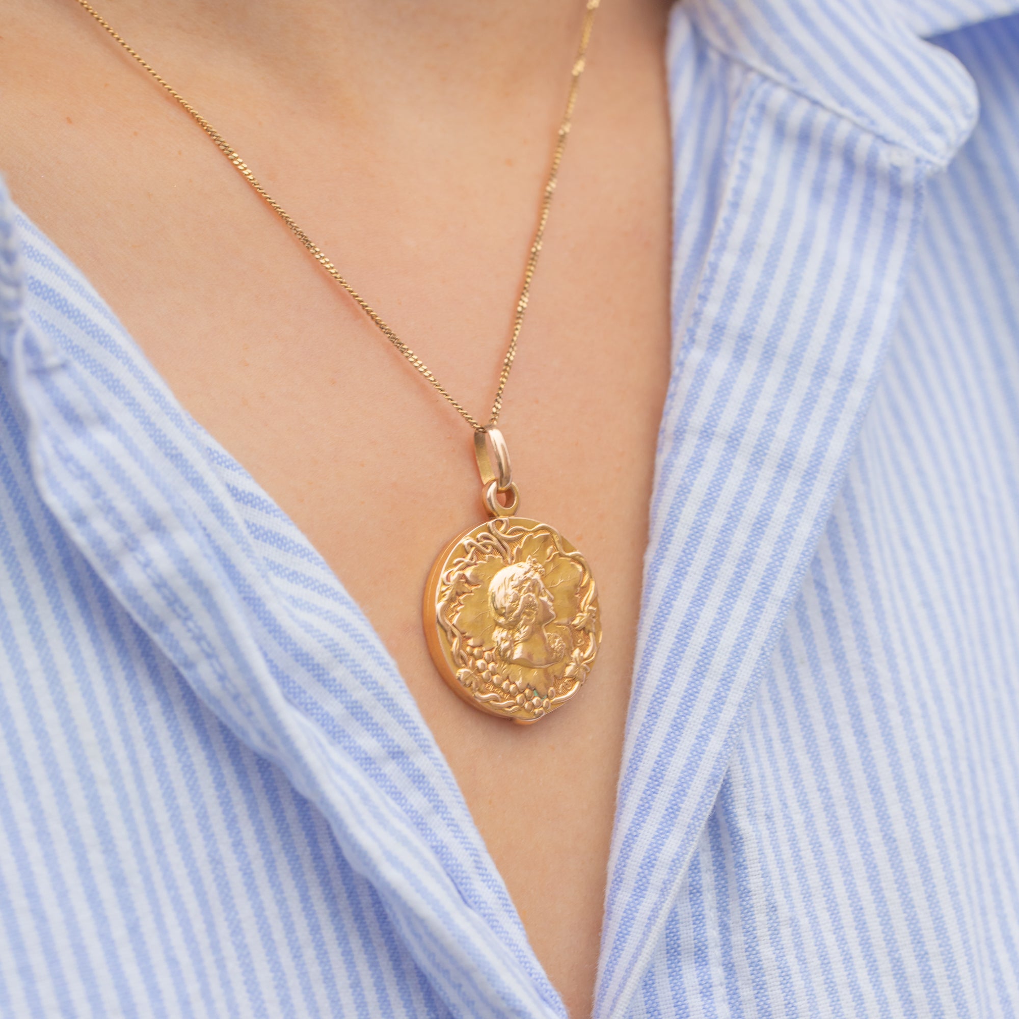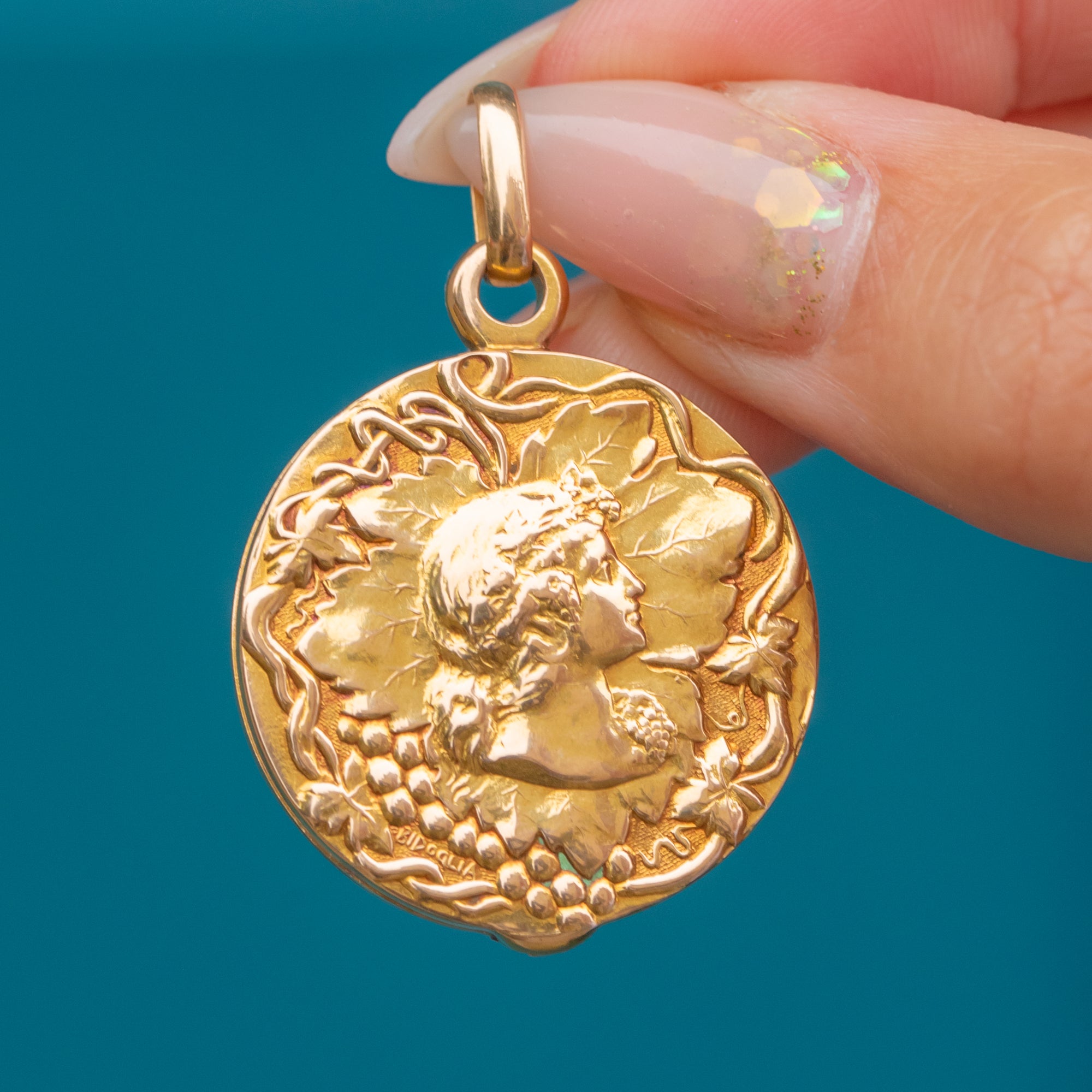 A superb French Art Nouveau locket in rich 18ct Gold depicting Bacchus, the god of wine, complete with flowing vines and classical detail. The sculpted relief has wonderful depth and presence, catching the light beautifully from every angle.
