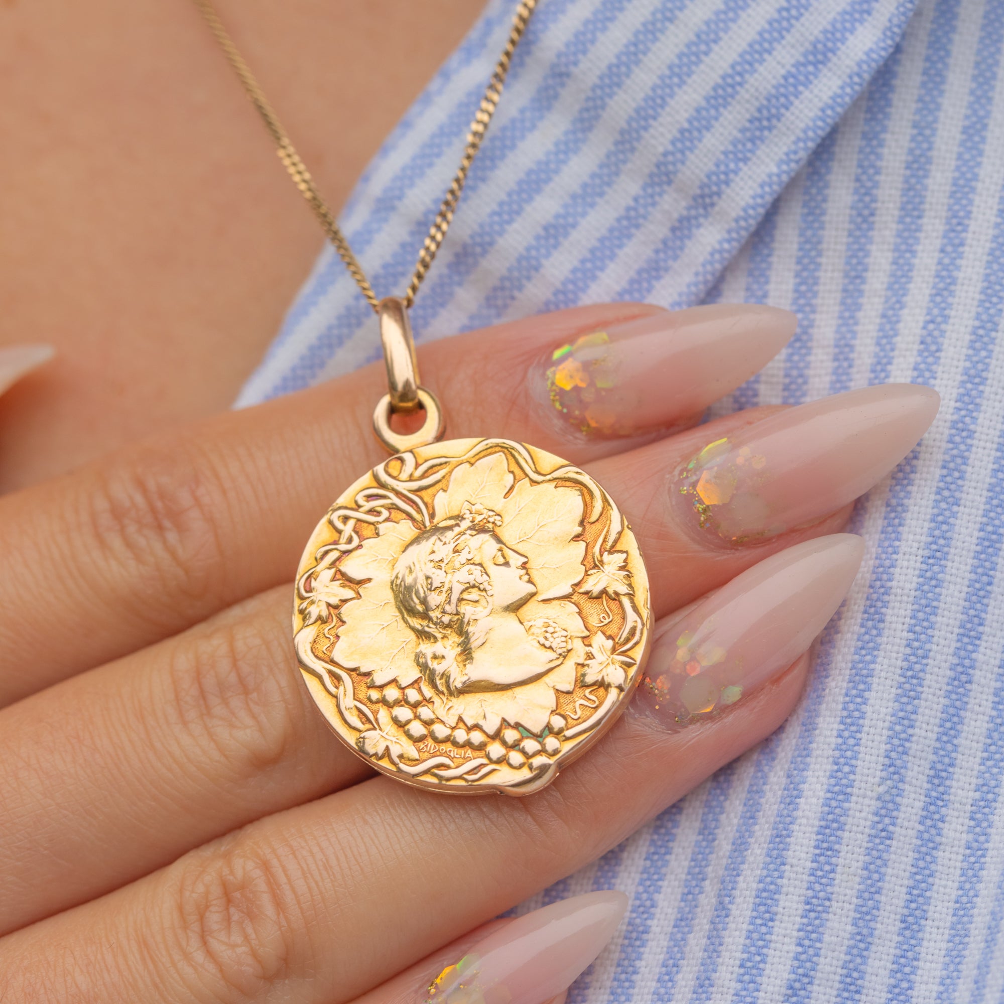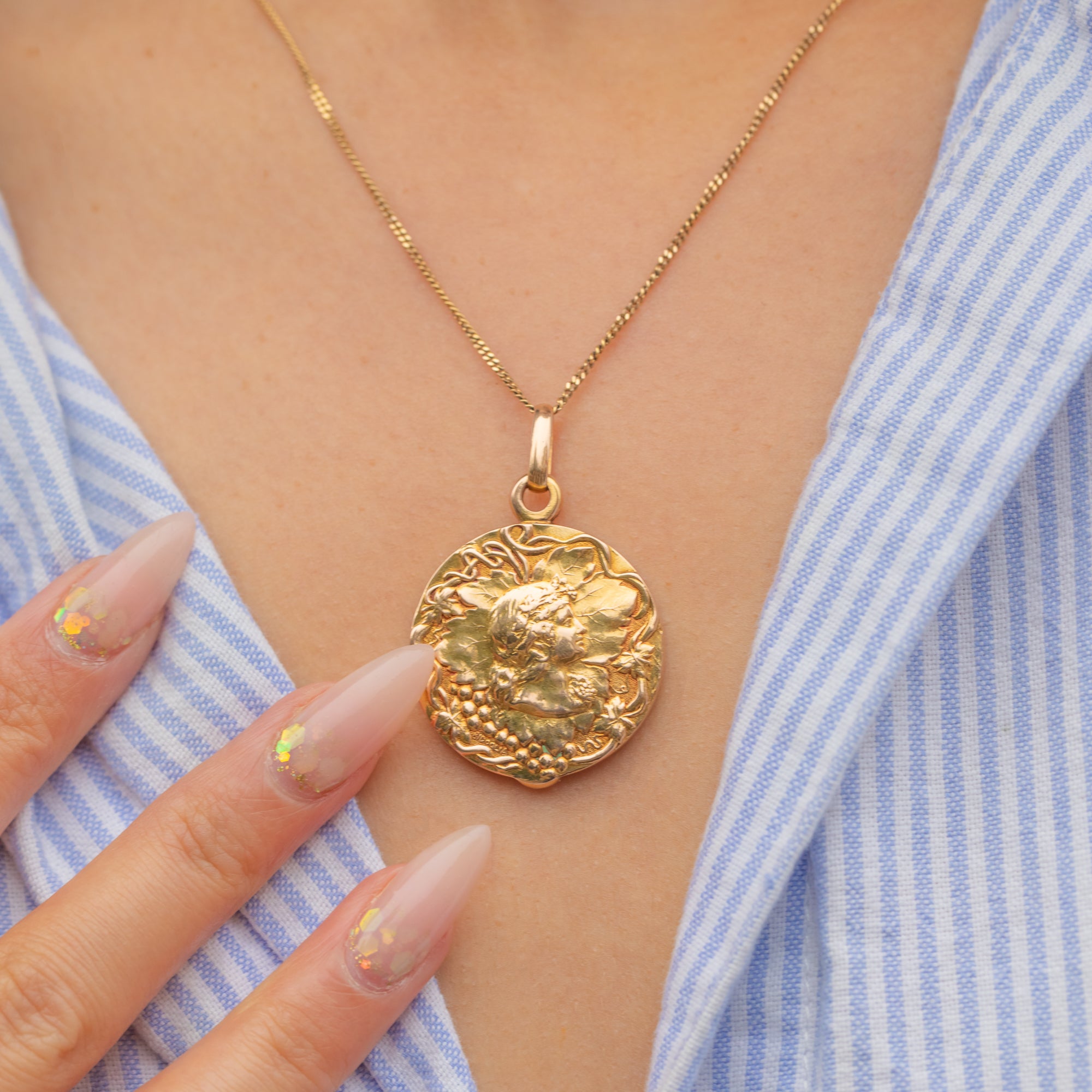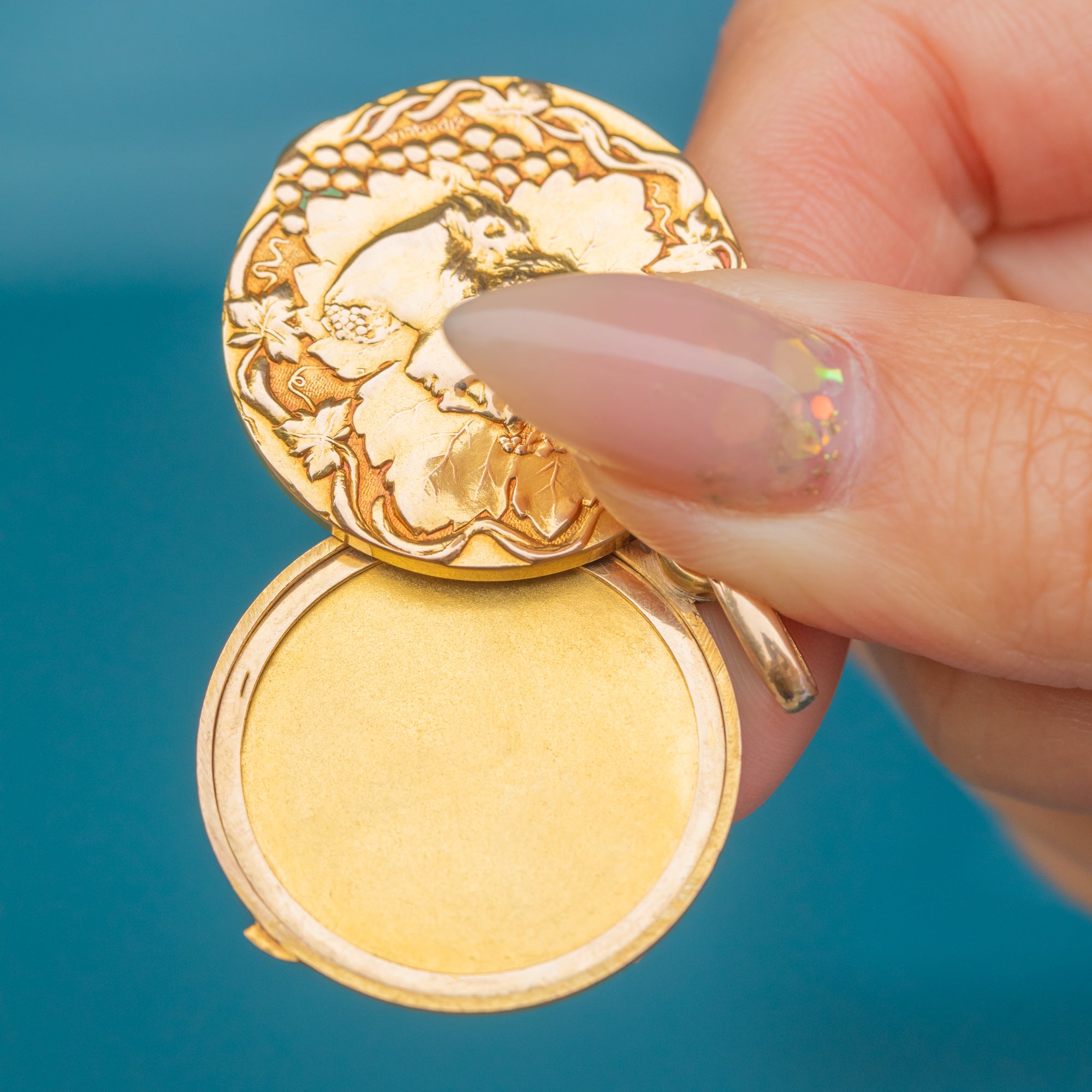 A superb French Art Nouveau locket in rich 18ct Gold depicting Bacchus, the god of wine, complete with flowing vines and classical detail. The sculpted relief has wonderful depth and presence, catching the light beautifully from every angle.