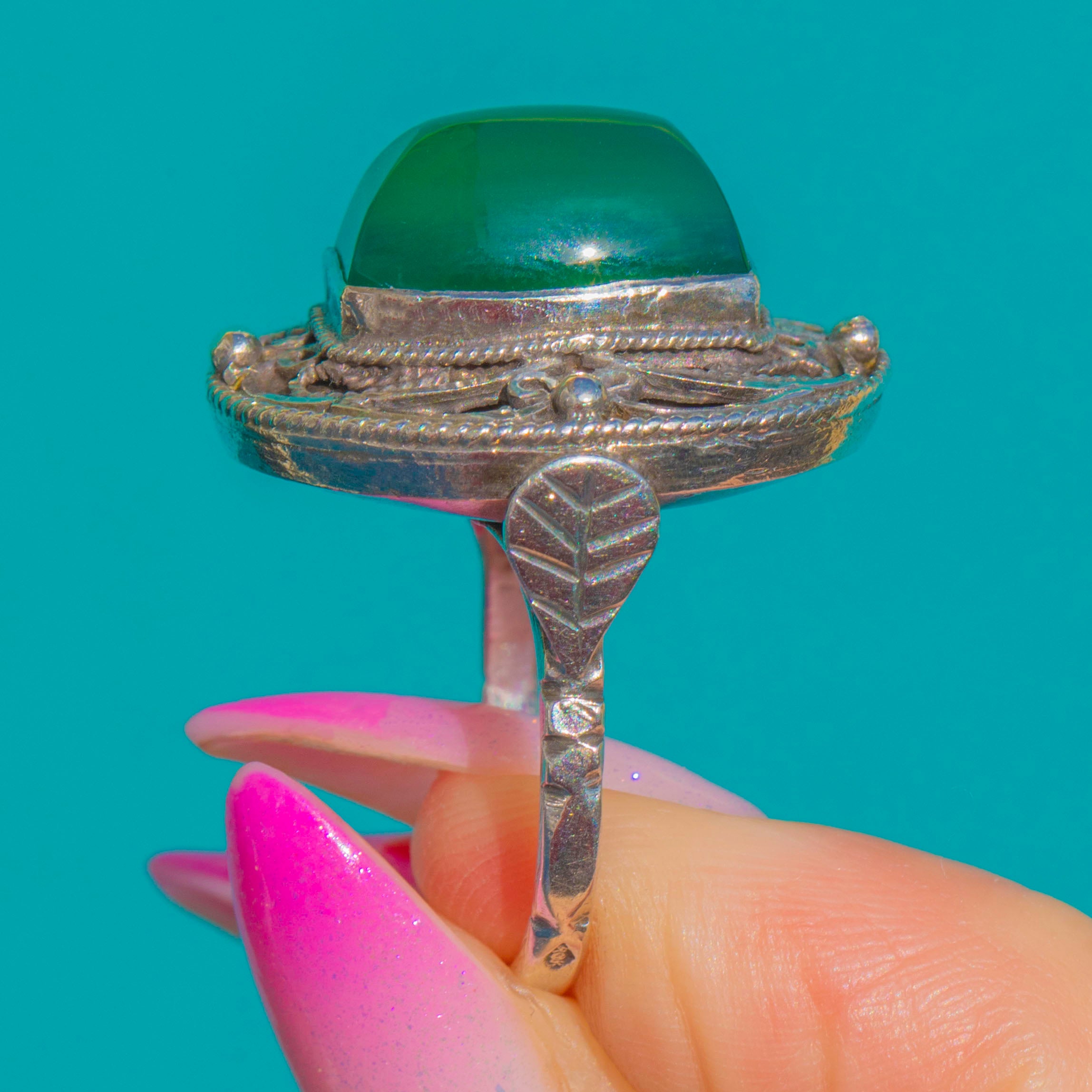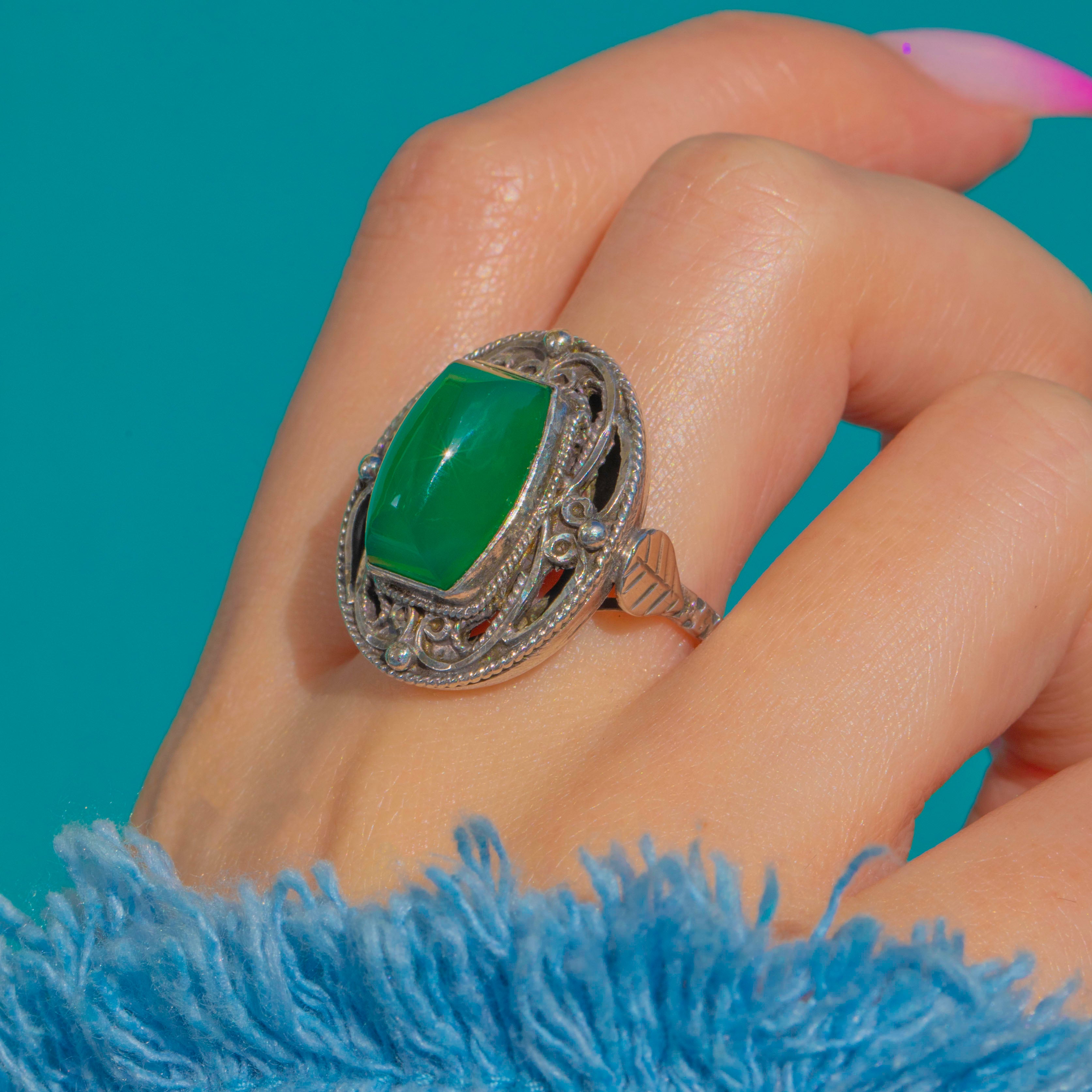 A striking French Arts and Crafts ring showcasing a vivid green Chrysoprase sugarloaf cabochon. The ornate Silver mount is richly detailed with rope and milgrain borders, applied granules, and flowing foliate scrolls, with an openwork gallery lending lightness and architectural finesse. Bold and beautifully balanced on the hand, it’s a statement piece with unmistakable early 20th-century artistry.