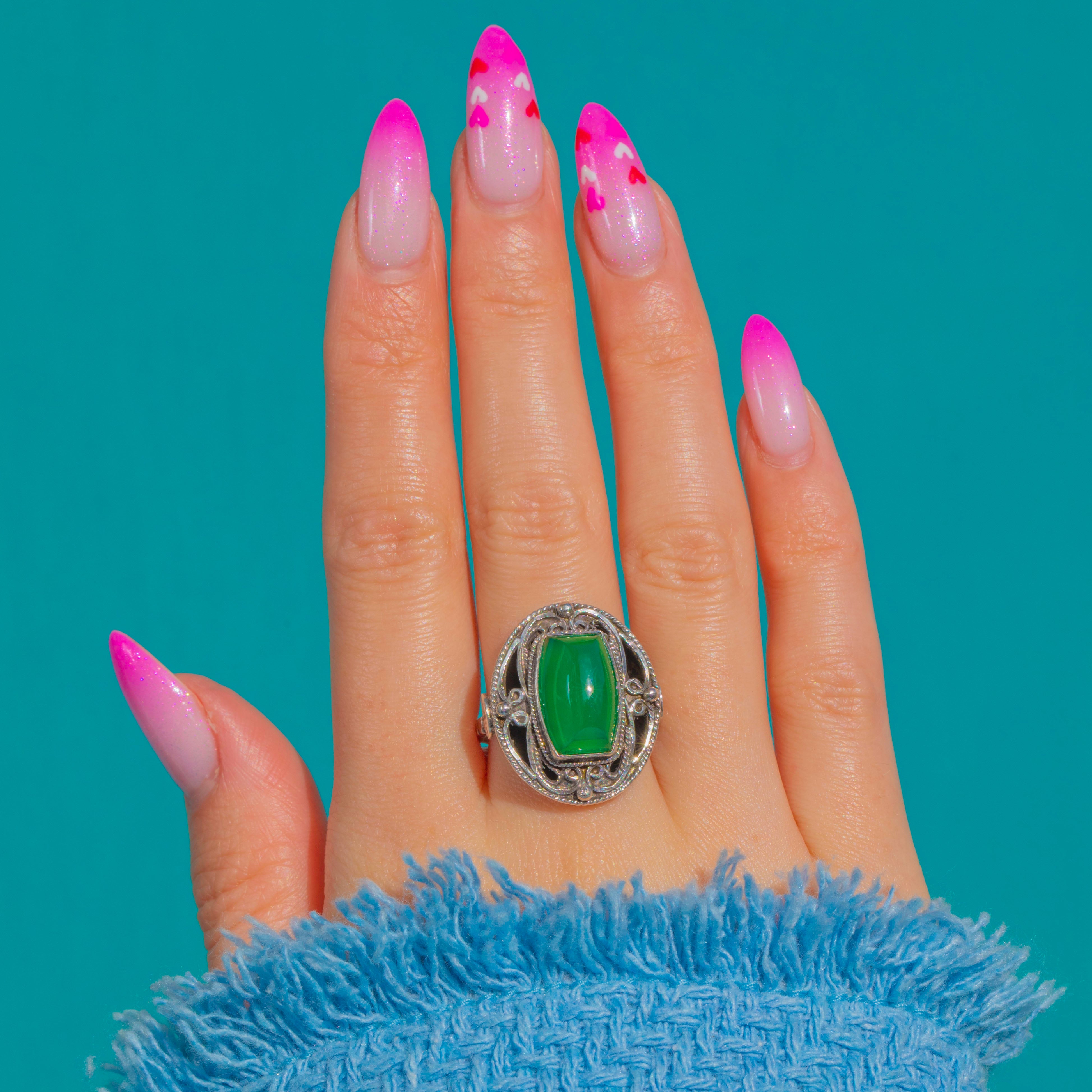 EXCELLENT: The Chrysoprase is smooth and glossy with minimal surface wear visible under magnification. The Silver mount is crisp with light age-related patina and gentle surface marks consistent with careful wear. The shank is sturdy and well-shaped.