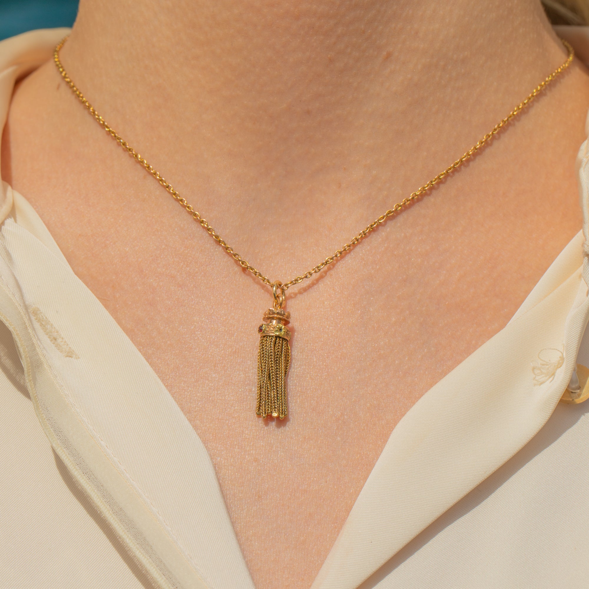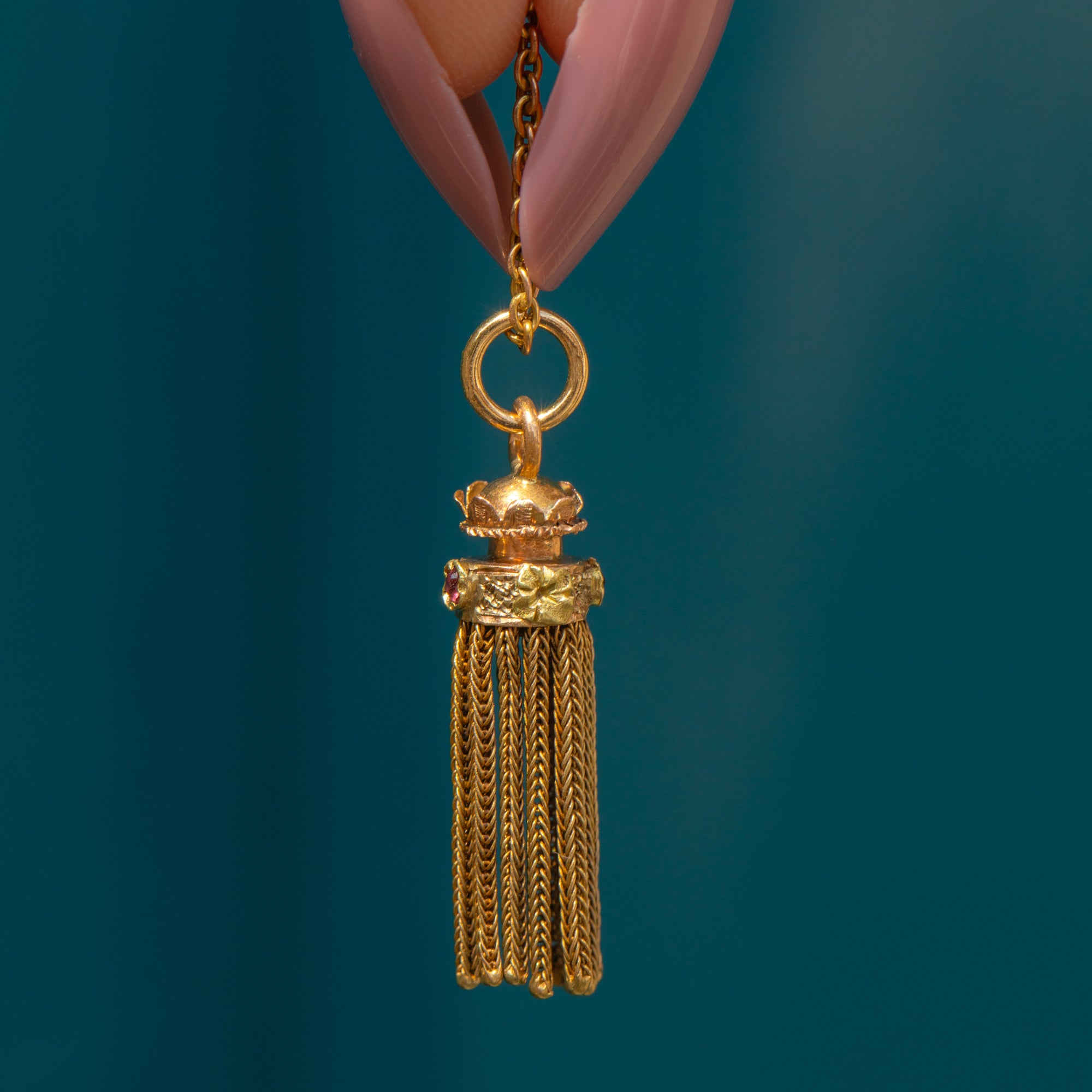 EXCELLENT. This Napoleon III French 18ct Gold tassel pendant is in excellent condition. The Gold is buttery and each foxtail chain tassel is neatly woven and firmly affixed. The Garnets are securely set and free from any signs of wear, with crimson flashes as their rose-cut facets catch the light. Complete with a soldered jump ring, all this pendant needs is a chain to adorn!