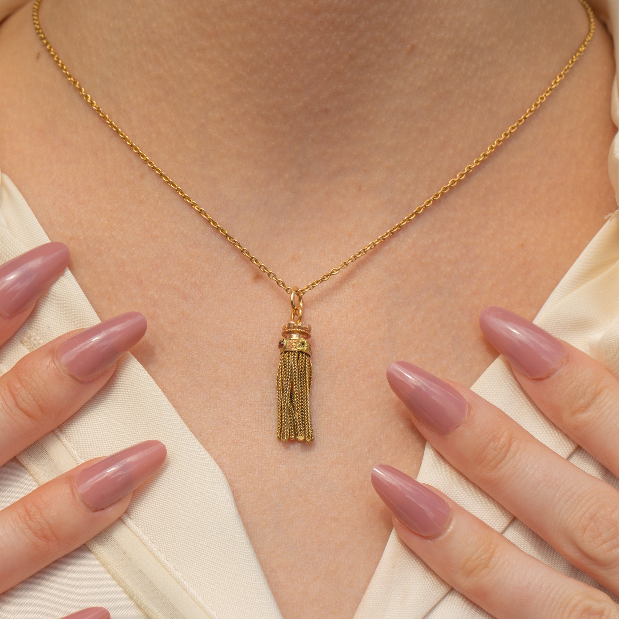 A rare treasure, this Napoleon III French 18ct Gold tassel pendant is a highly coveted piece for any antique jewellery aficionado or lover of resplendent jewels! Steeped in history, this Victorian pendant is crafted from solid 18ct Gold and set with rose-cut Garnets with floral accents topped by a crown, commemorating Napoleon III in the most sumptuous way!