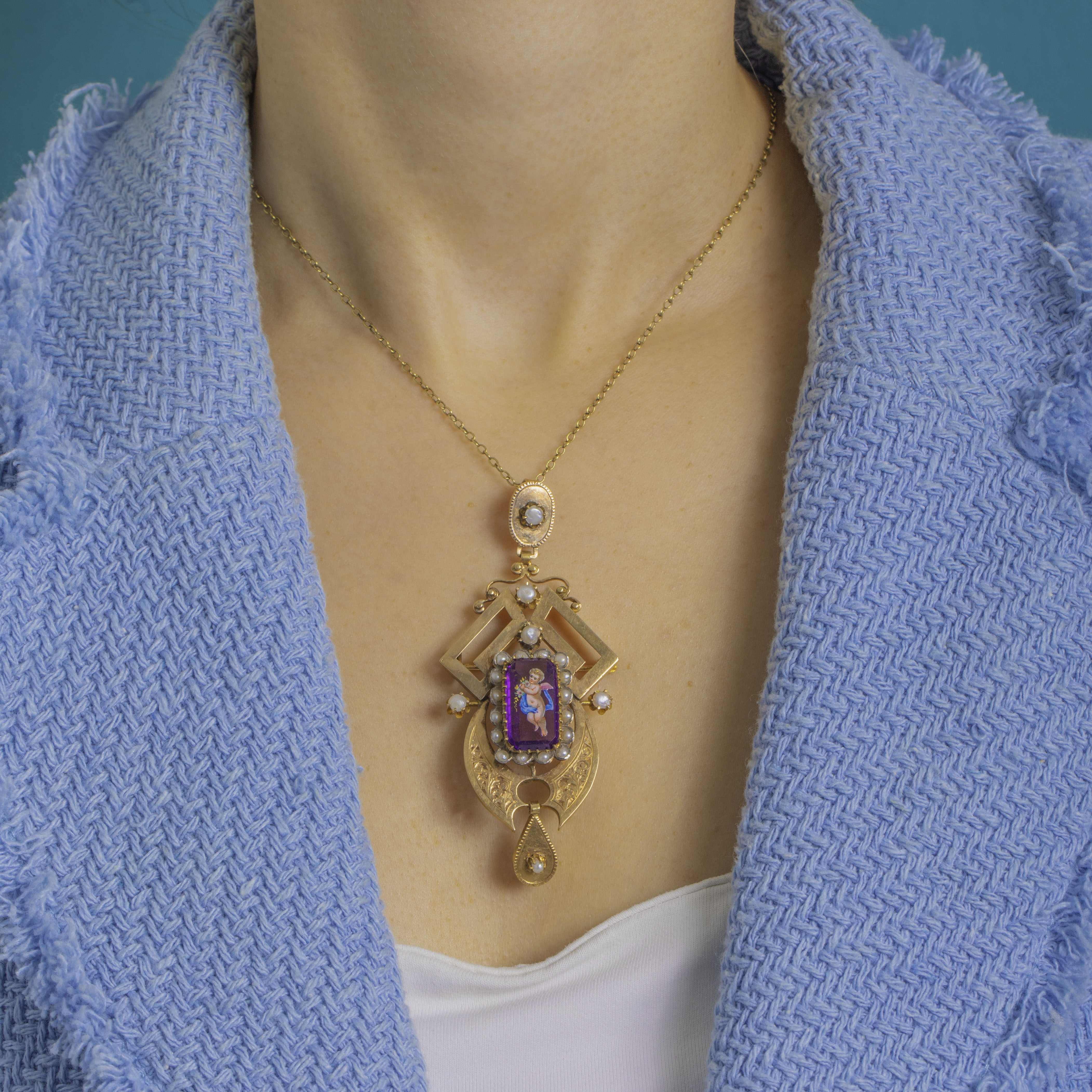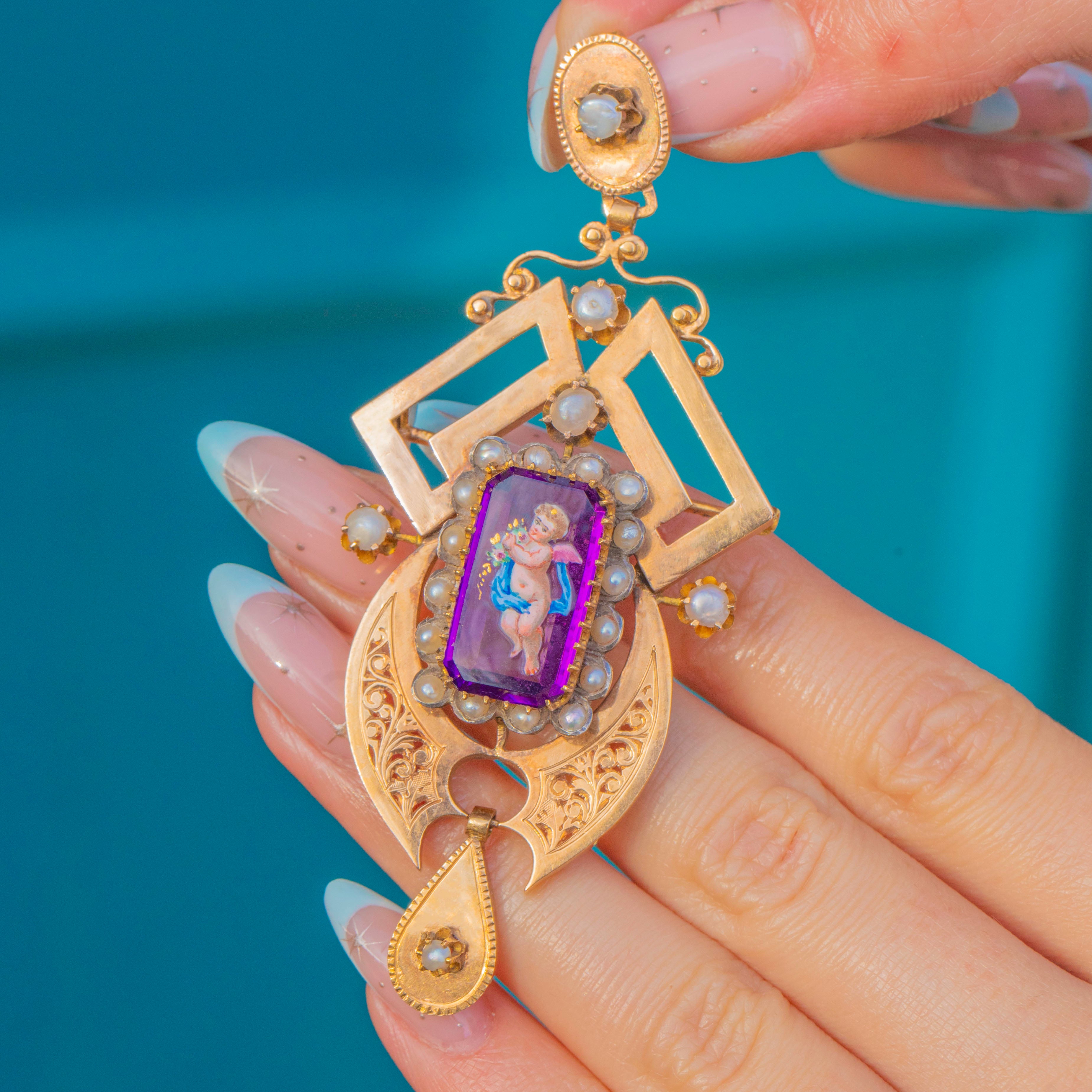 A magnificent French Victorian convertible pendant-brooch in rich 18ct Gold, exquisitely detailed in the Classical Revival style. At its heart sits a rectangular purple Paste tablet bearing a charming painted cherub, encircled by lustrous Pearls set in Silver to heighten their glow. The composition is romantic and architectural, with applied bead and rope borders for delicious texture and light play.