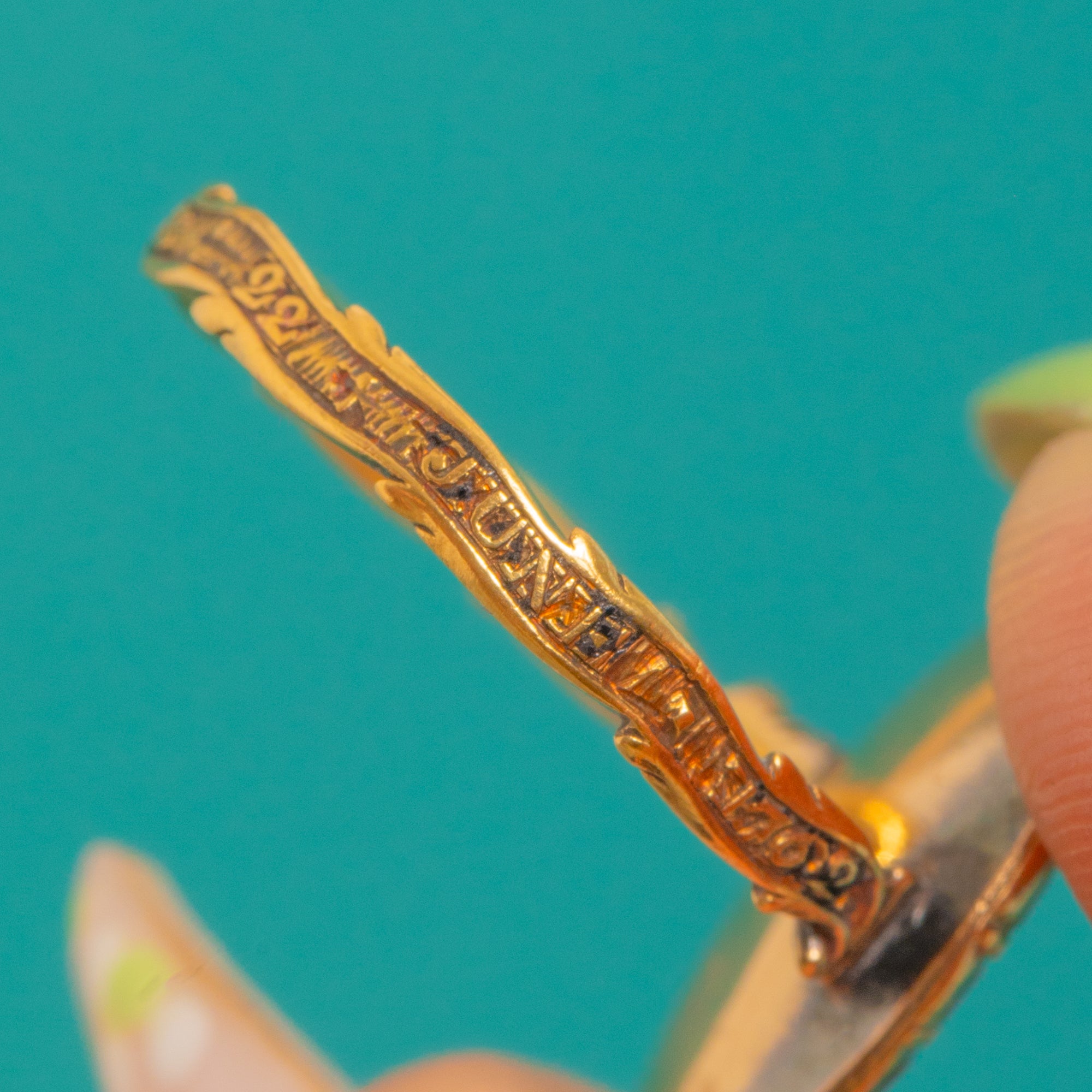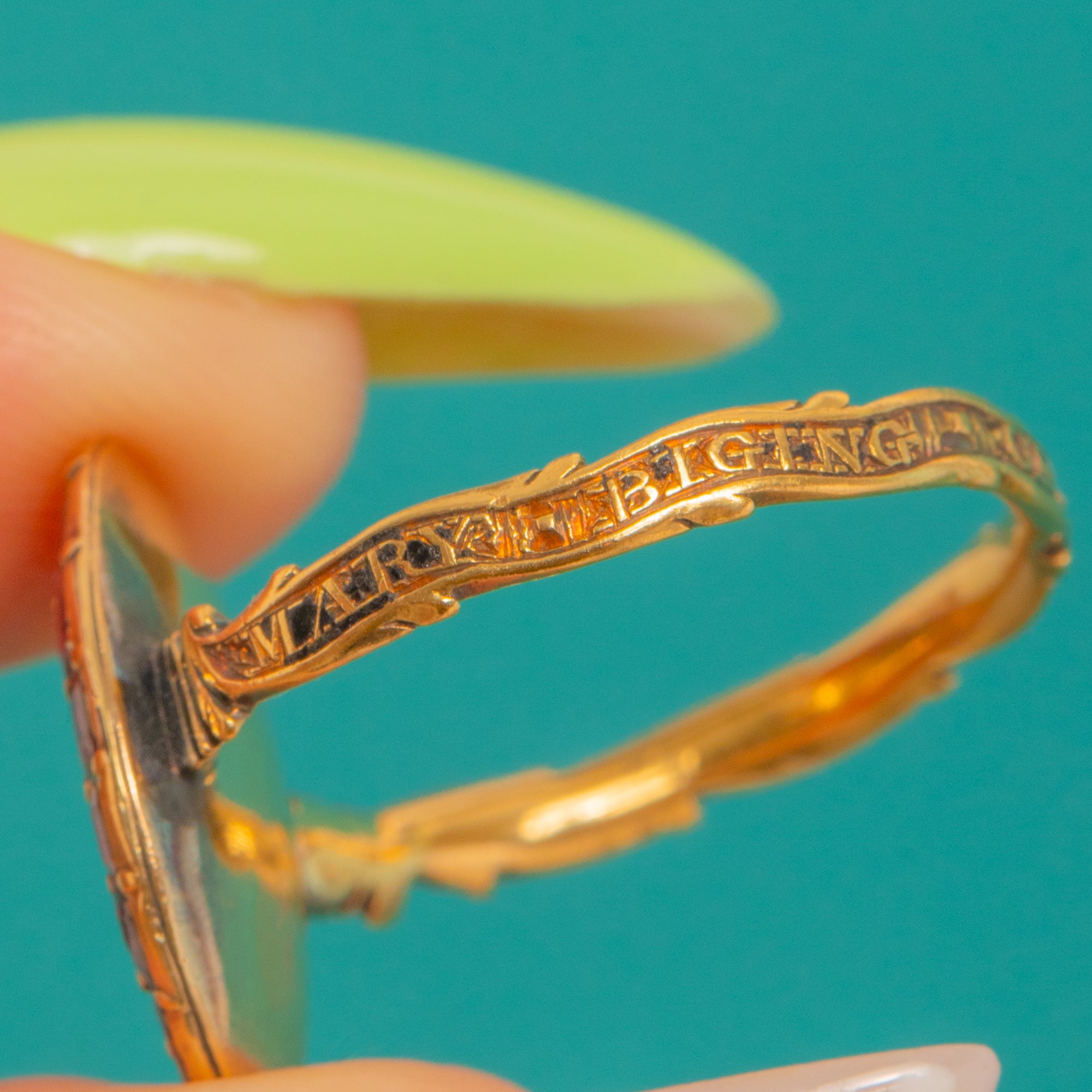 A loving inscription runs around the band, “Mary Biging ob 22nd June 1762”, with traces of original Enamel that speak softly of its history and sentiment. Elegant and evocative, it distils 18th-century remembrance into a beautifully wearable keepsake.