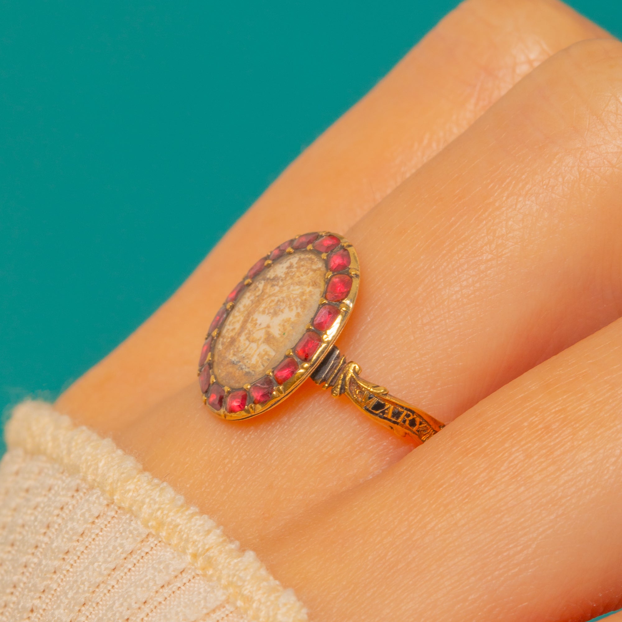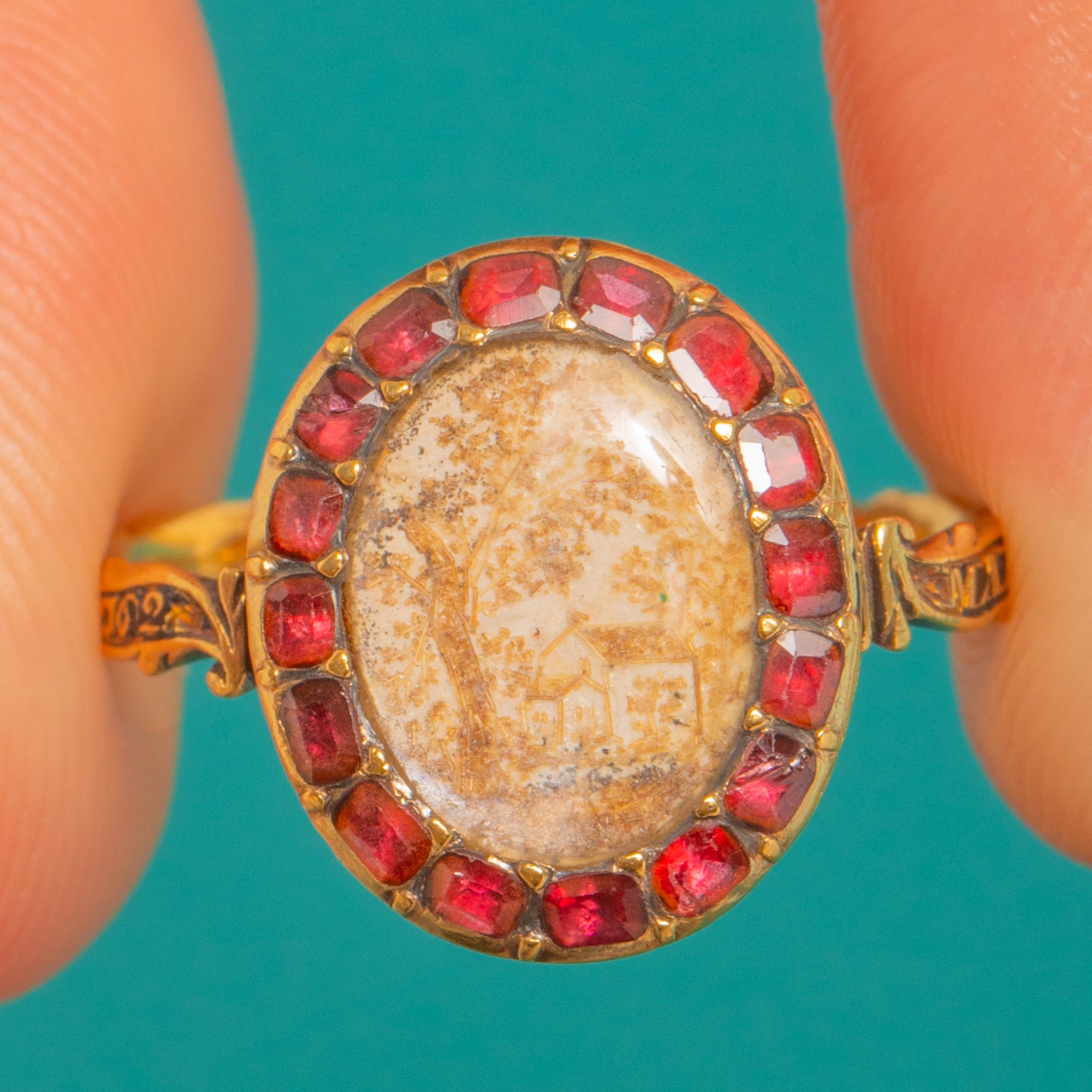 A poignant early Georgian mourning ring from circa 1762, masterfully hand-crafted in 18ct Gold. An oval central tablet of delicate woven hairwork depicting a house amongst trees is encircled by a halo of deep red Garnets in closed-back collets, with foliate engravings along the shoulders completing its refined silhouette.