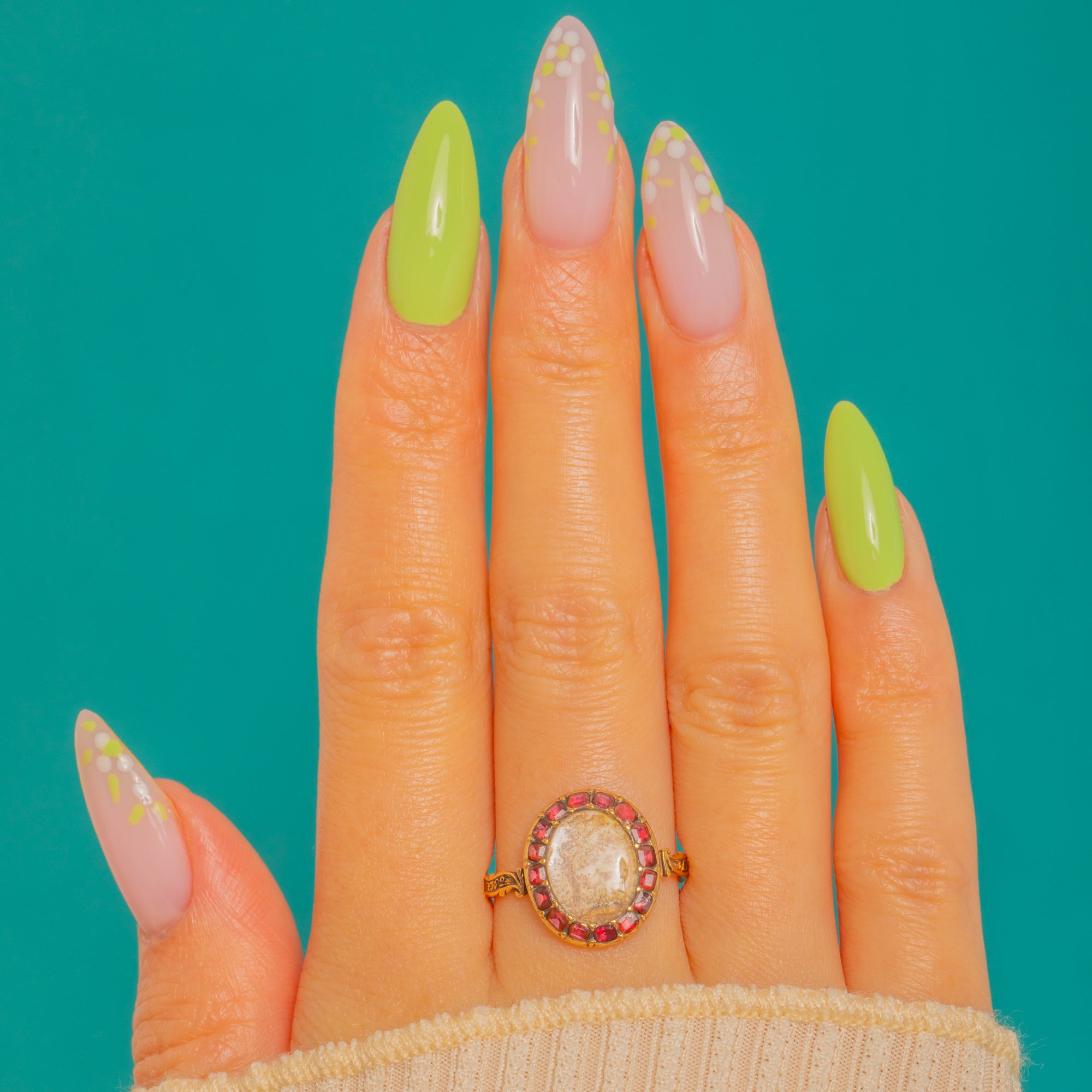 MATERIALS: Tests as 18ct Gold, Garnet, Woven Hair.