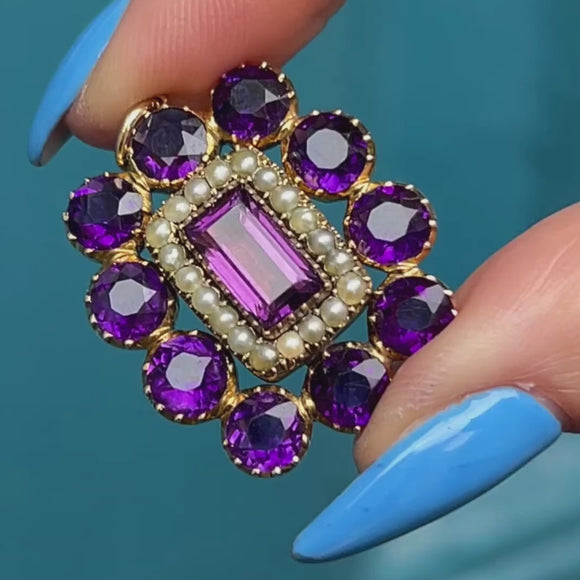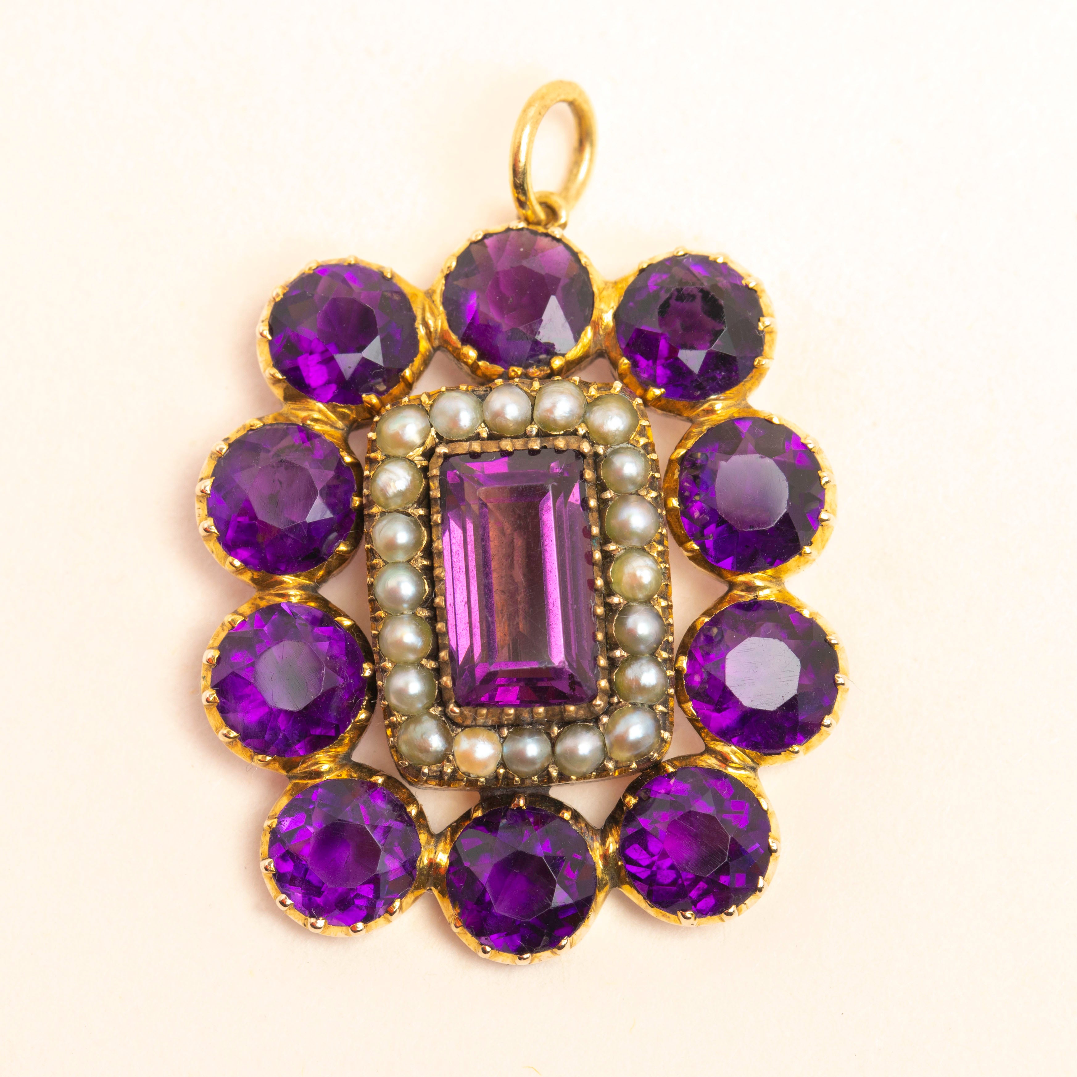 Georgian 15ct Gold Amethyst Pearl Cluster Pendant, 6.90ct