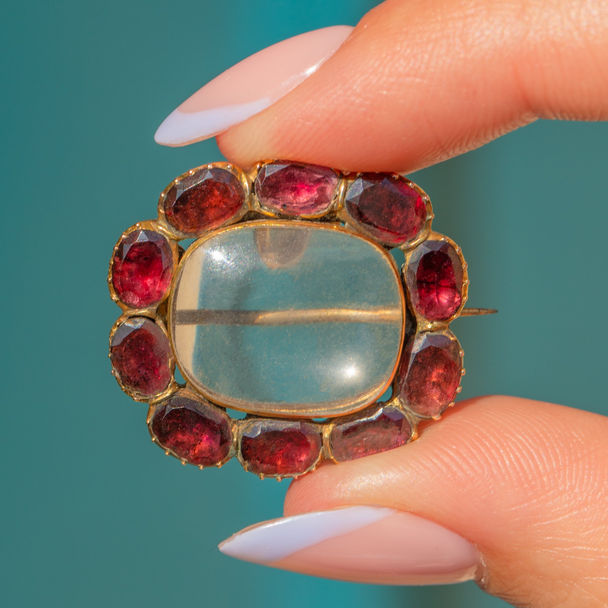 MATERIALS: Tests as 15ct Gold, Georgian (foiled) flat-cut Garnets (3.10ct).