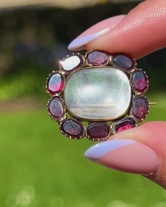 A captivating Georgian 15ct Gold flat-cut Garnet shaker locket crafted in warm 9ct Gold, adorned with luminous flat-cut Garnets enhanced by foiling for added brilliance. This adaptable piece can be worn as either a pendant or a brooch, allowing its antique elegance to shine in any setting.