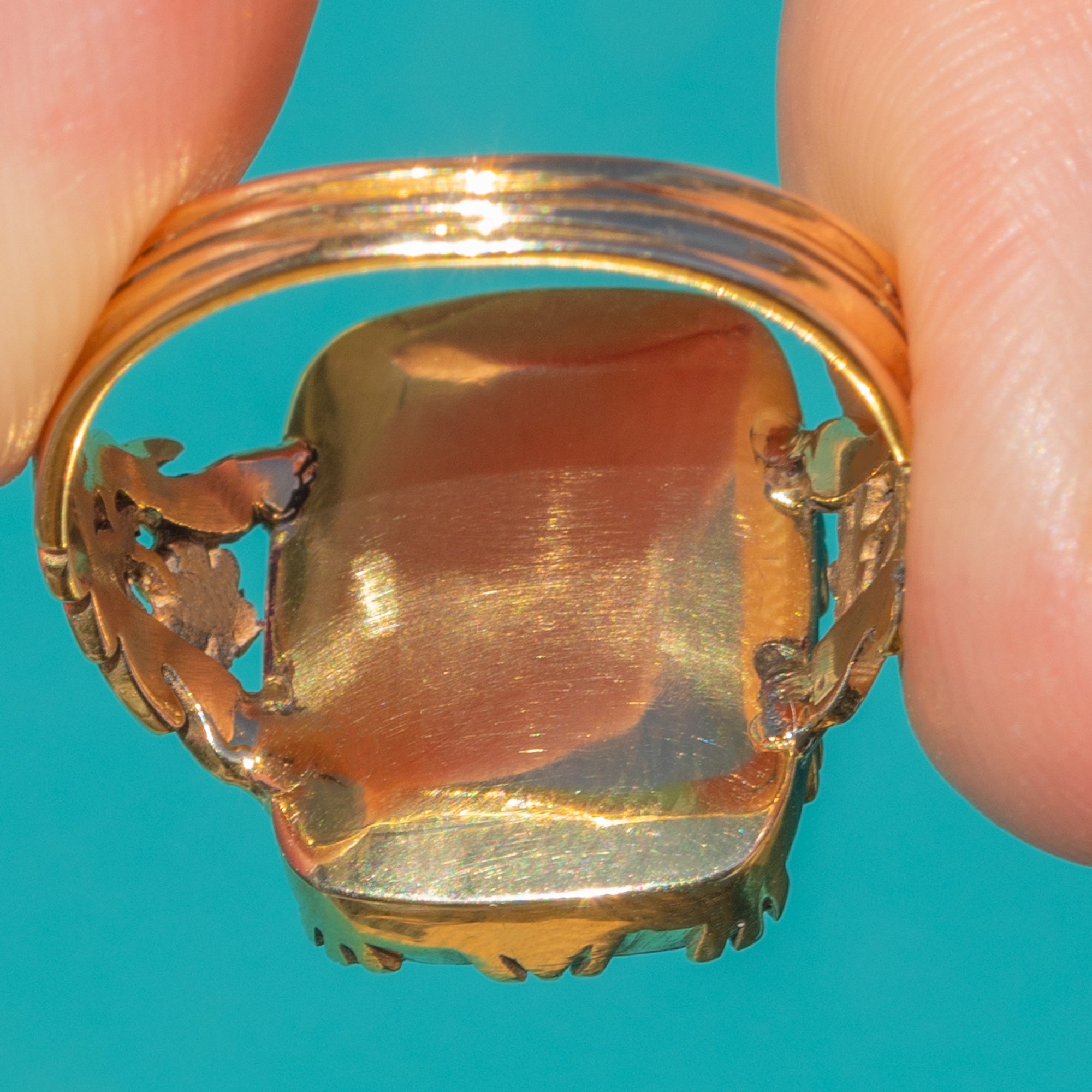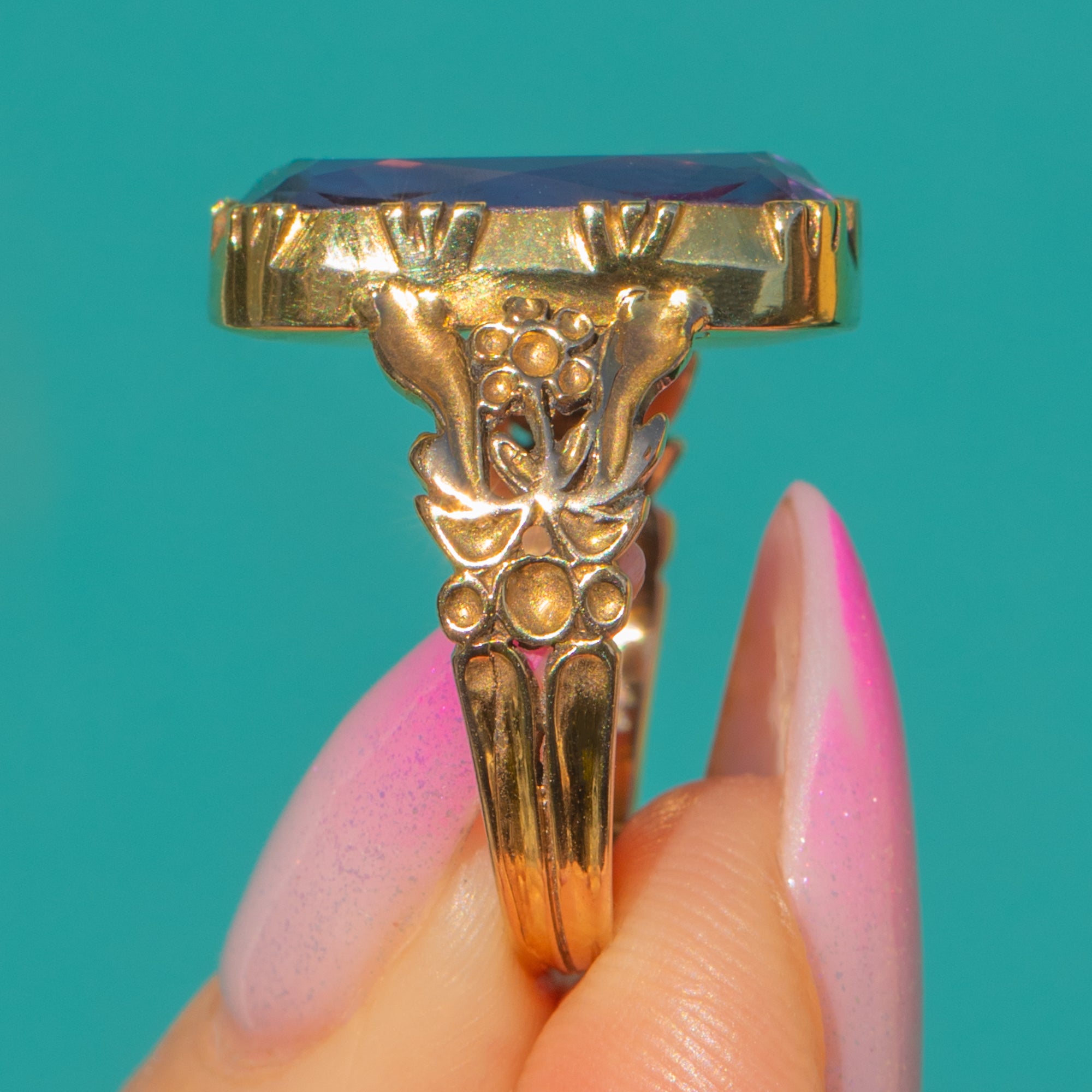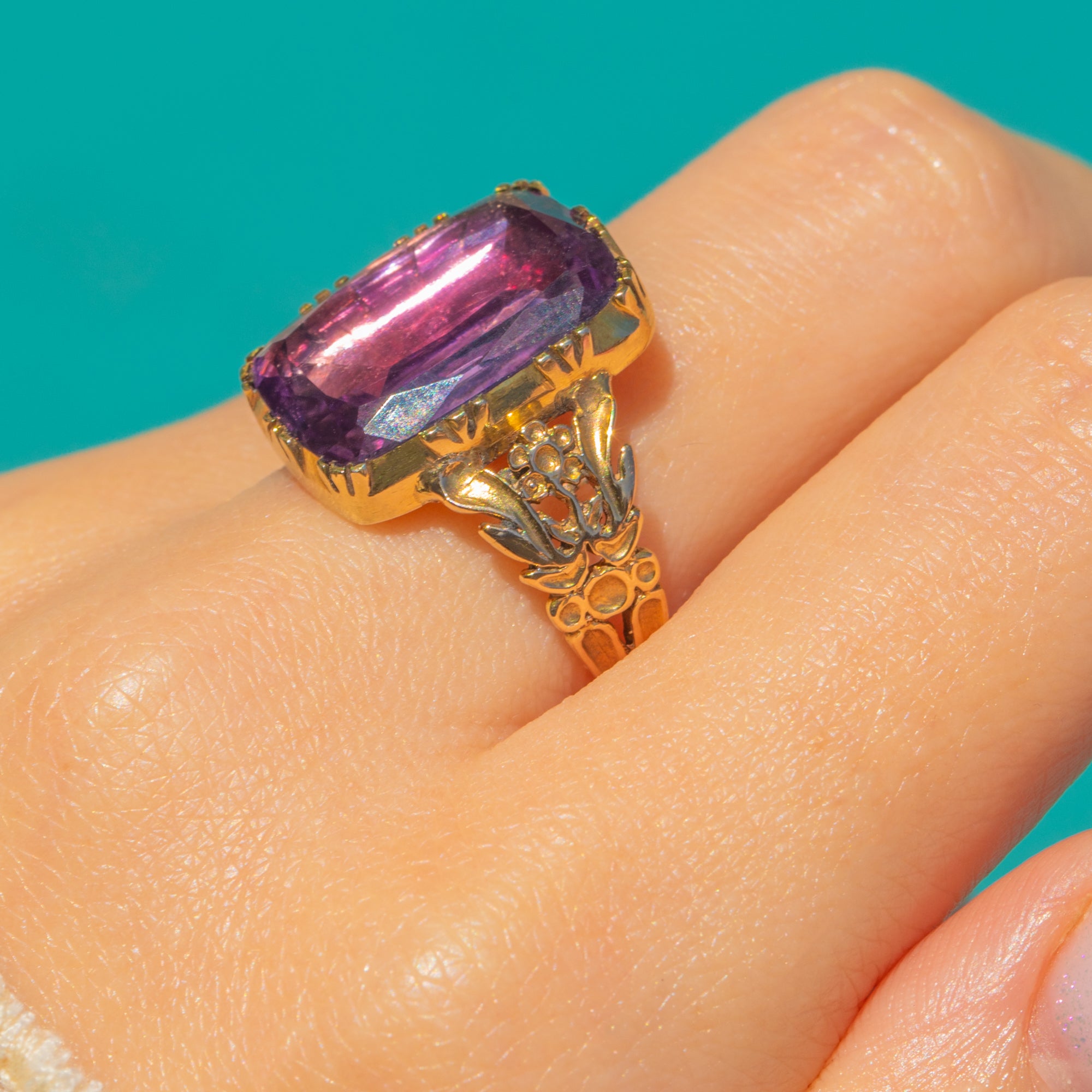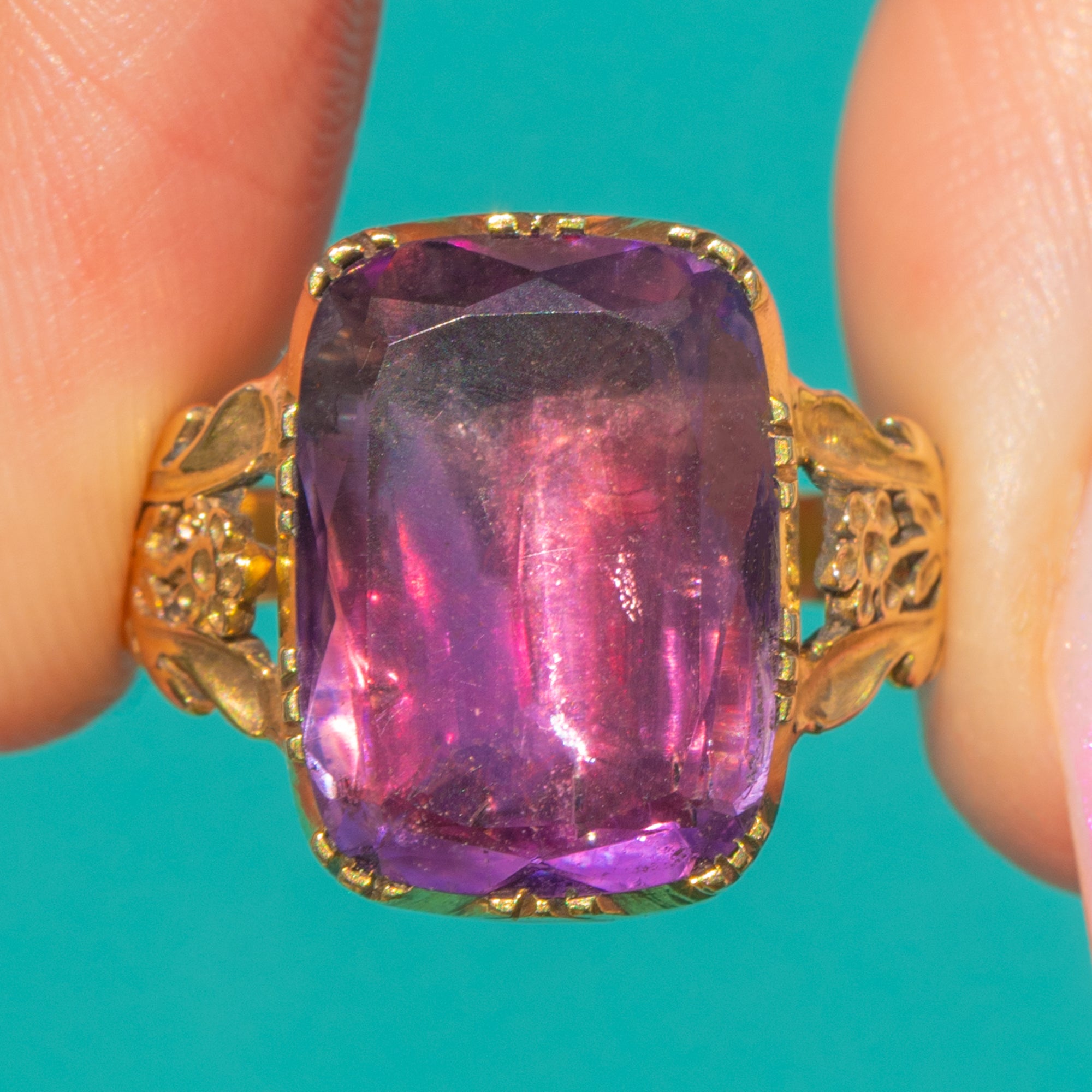 Alive with rich purple tones and warm rose‑amber flashes, this Georgian 15ct Gold ring showcases an impressive 8.60ct foiled Amethyst in a bold, high collet. The scalloped bezel and pierced foliate gallery add depth and romance, while decorative shoulders and split rails complete its sculptural silhouette.