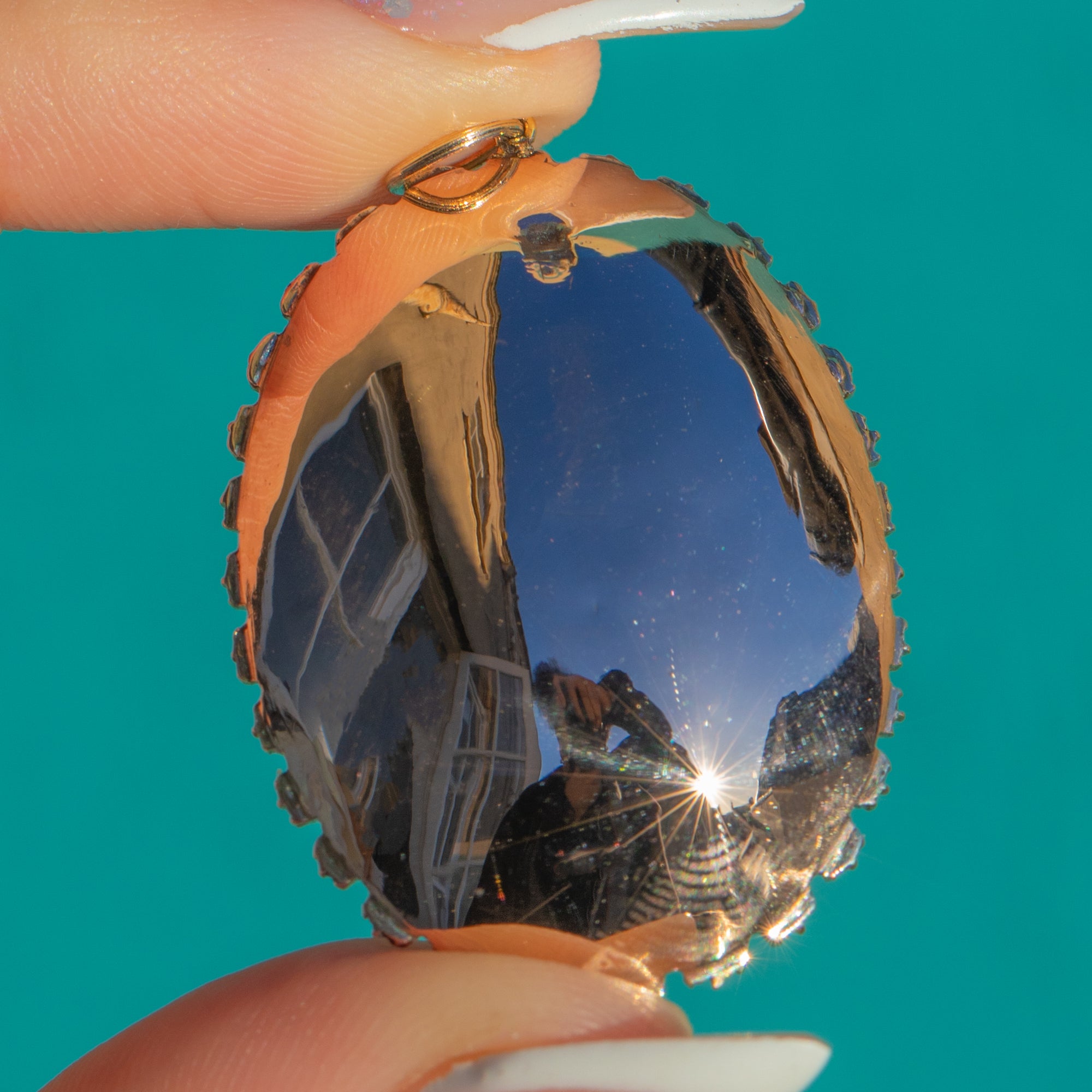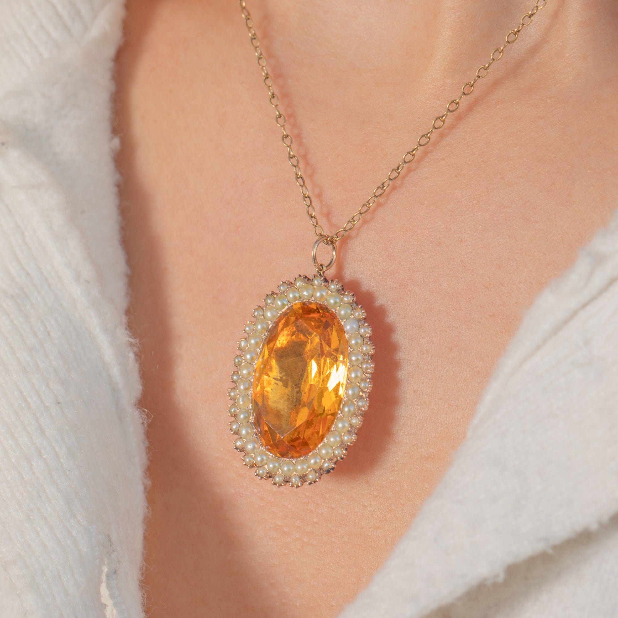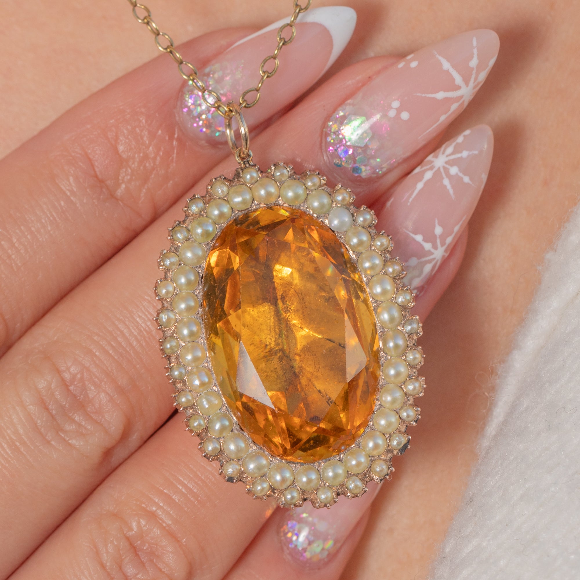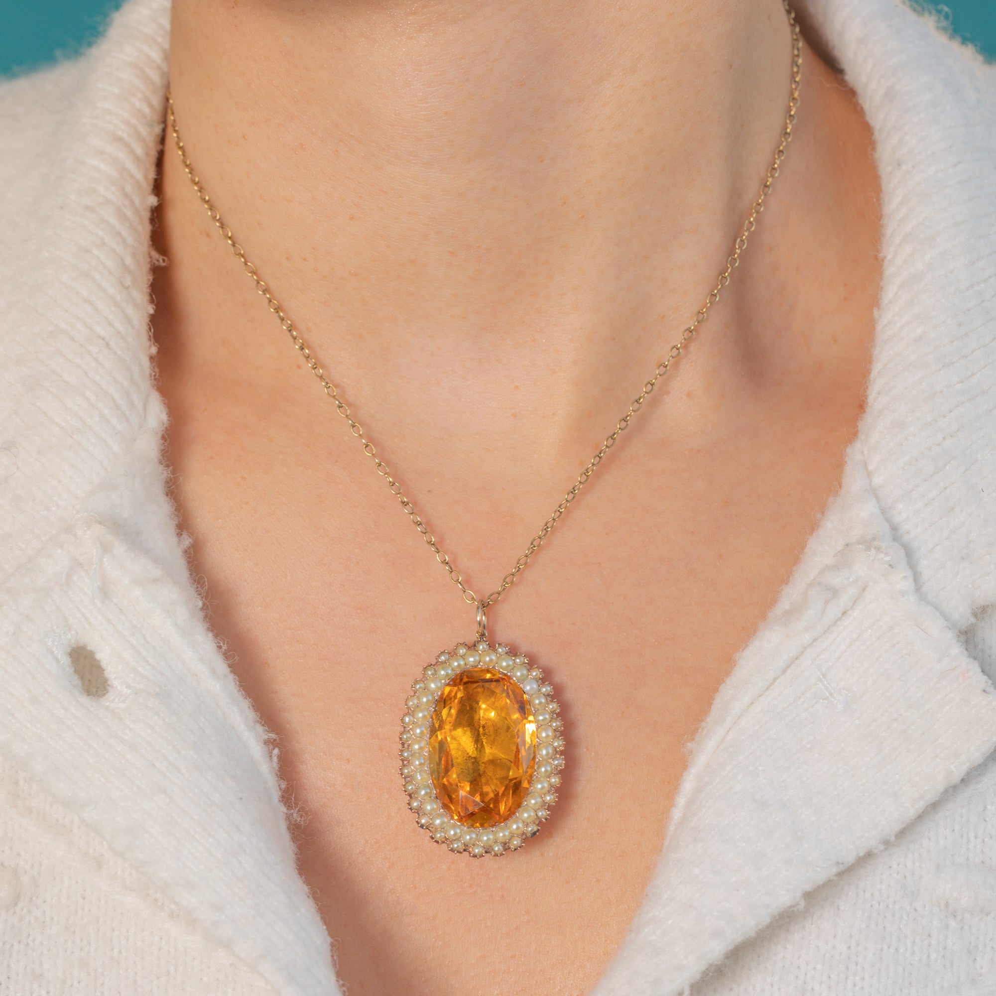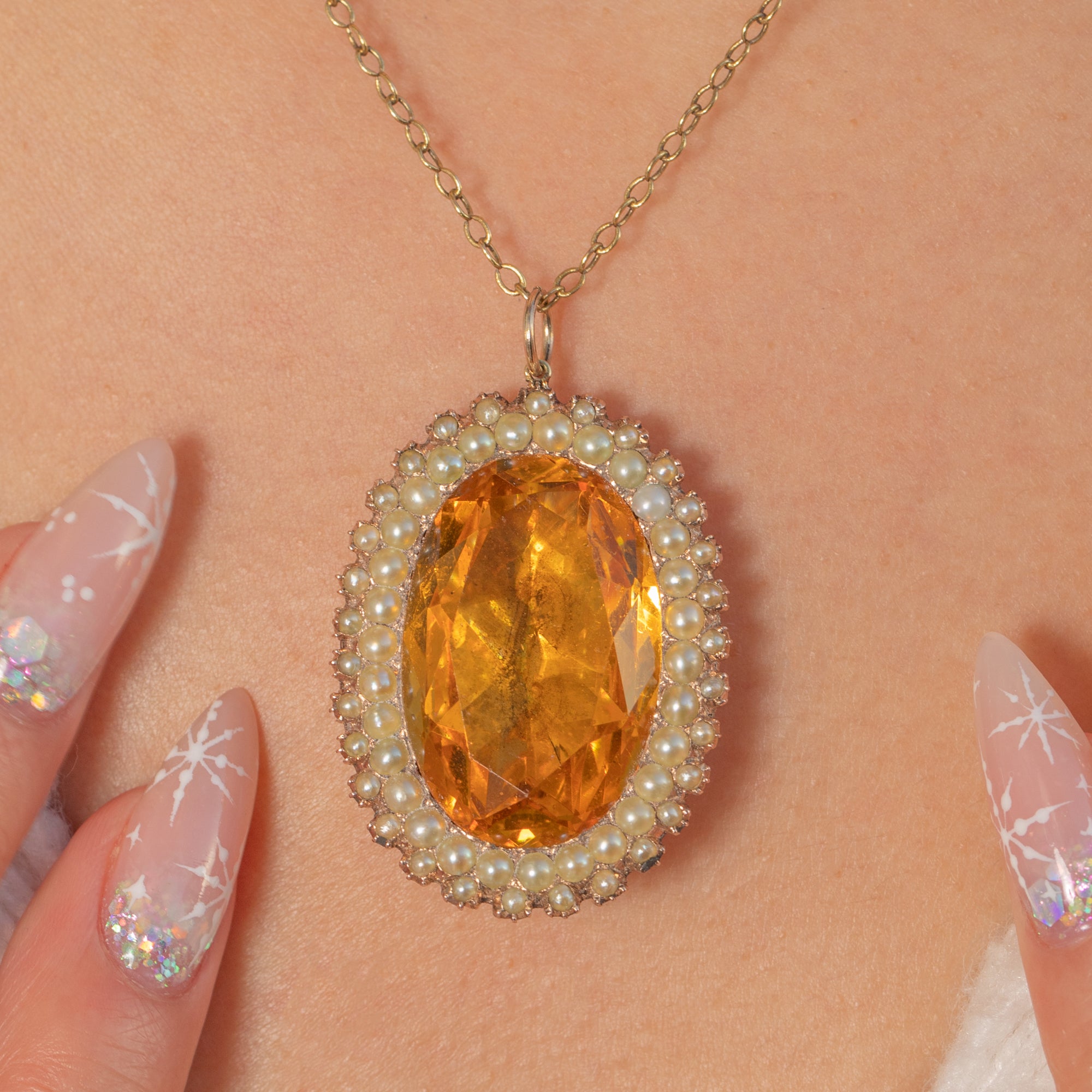Glowing with Georgian romance, this statement pendant centres on a vivid foiled Citrine in a warm 15ct Gold collet, its honeyed fire intensified by the foil behind the stone. A close inner halo of graduating Pearls adds a soft, creamy lustre, while the scalloped perimeter brings an ornate yet refined flourish quintessential of the era.