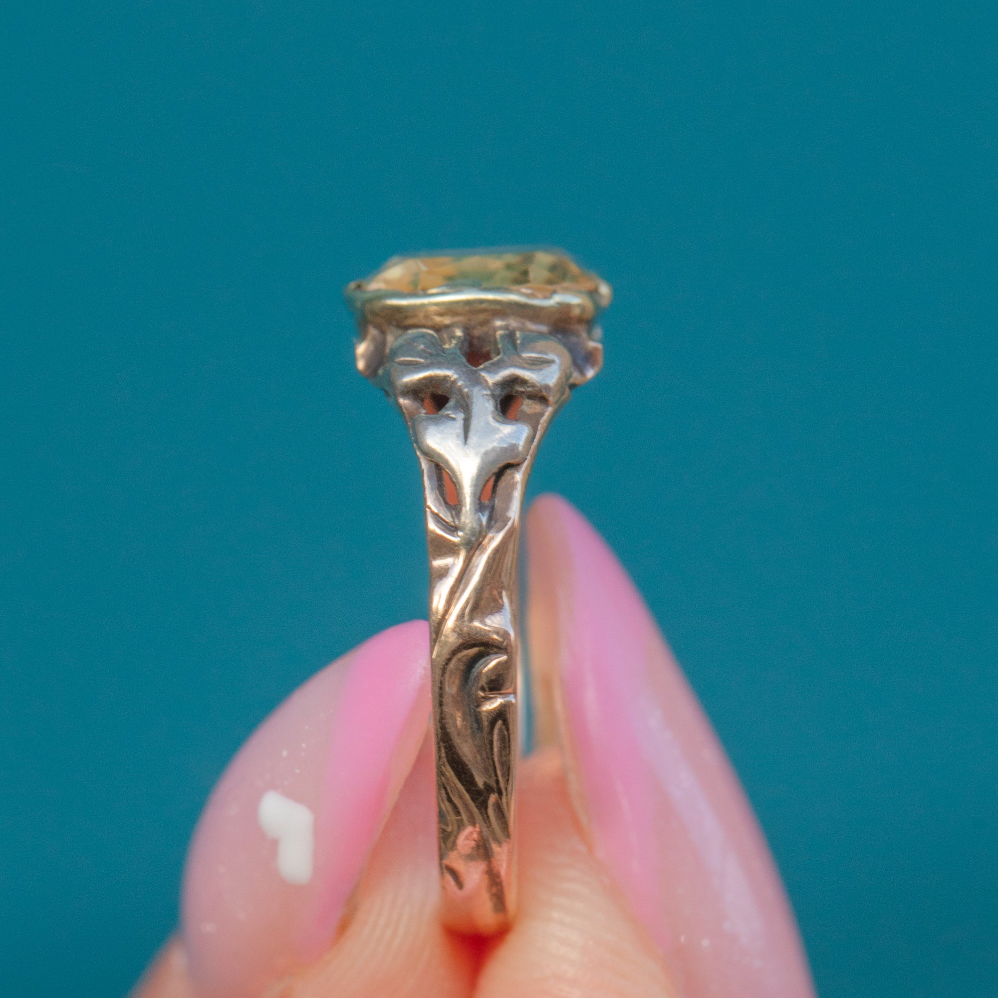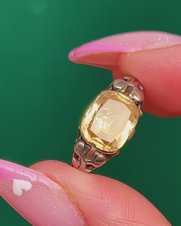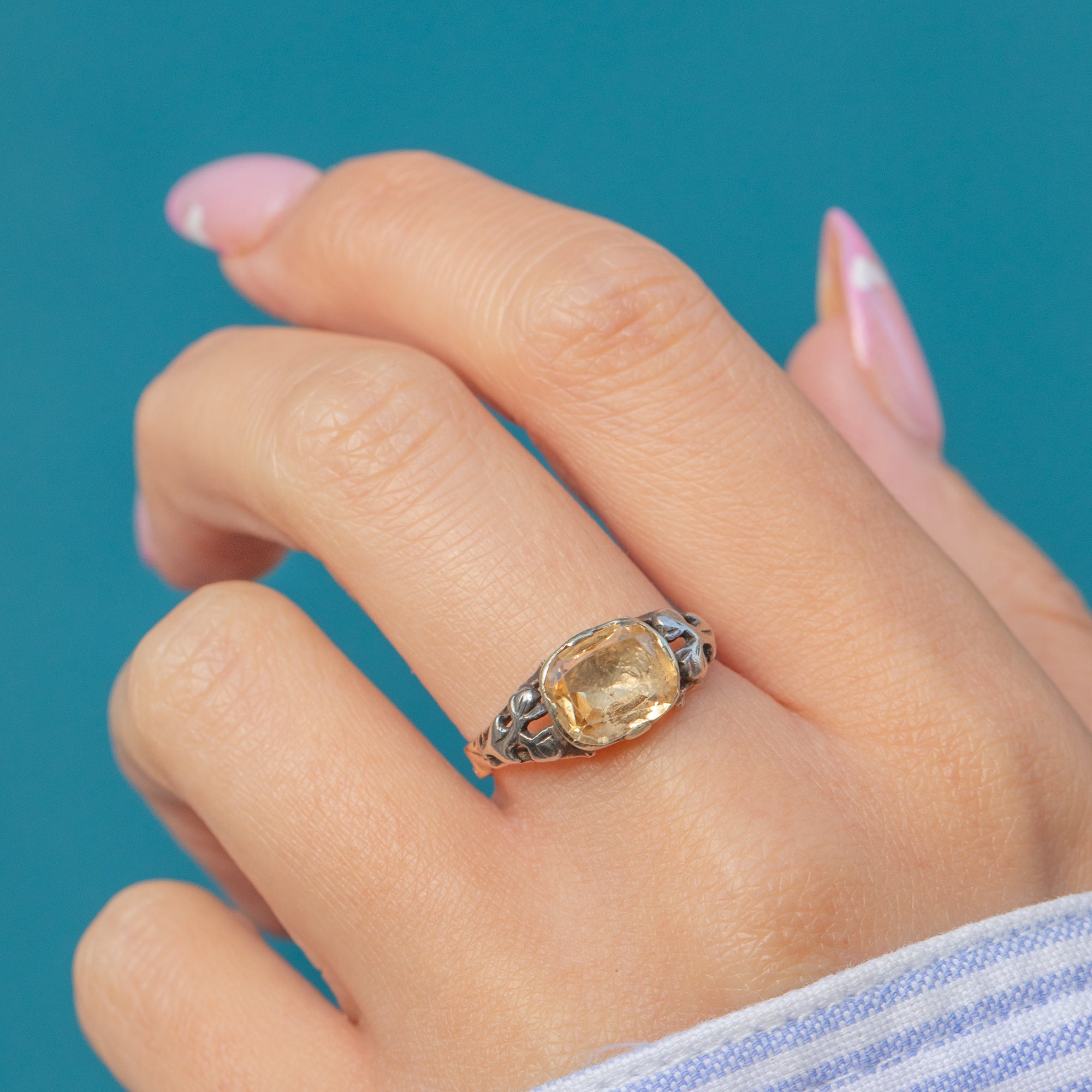 This exquisite Georgian Rococo ring, c.1760–1780, is set with a glowing 2.50ct Imperial Topaz, cushion-cut and foil-backed to enhance its warm golden-pink fire. The Topaz is mounted in a beautifully shaped Silver setting, elevated on a rich 15ct Gold band typical of the period’s luxurious two-tone design.