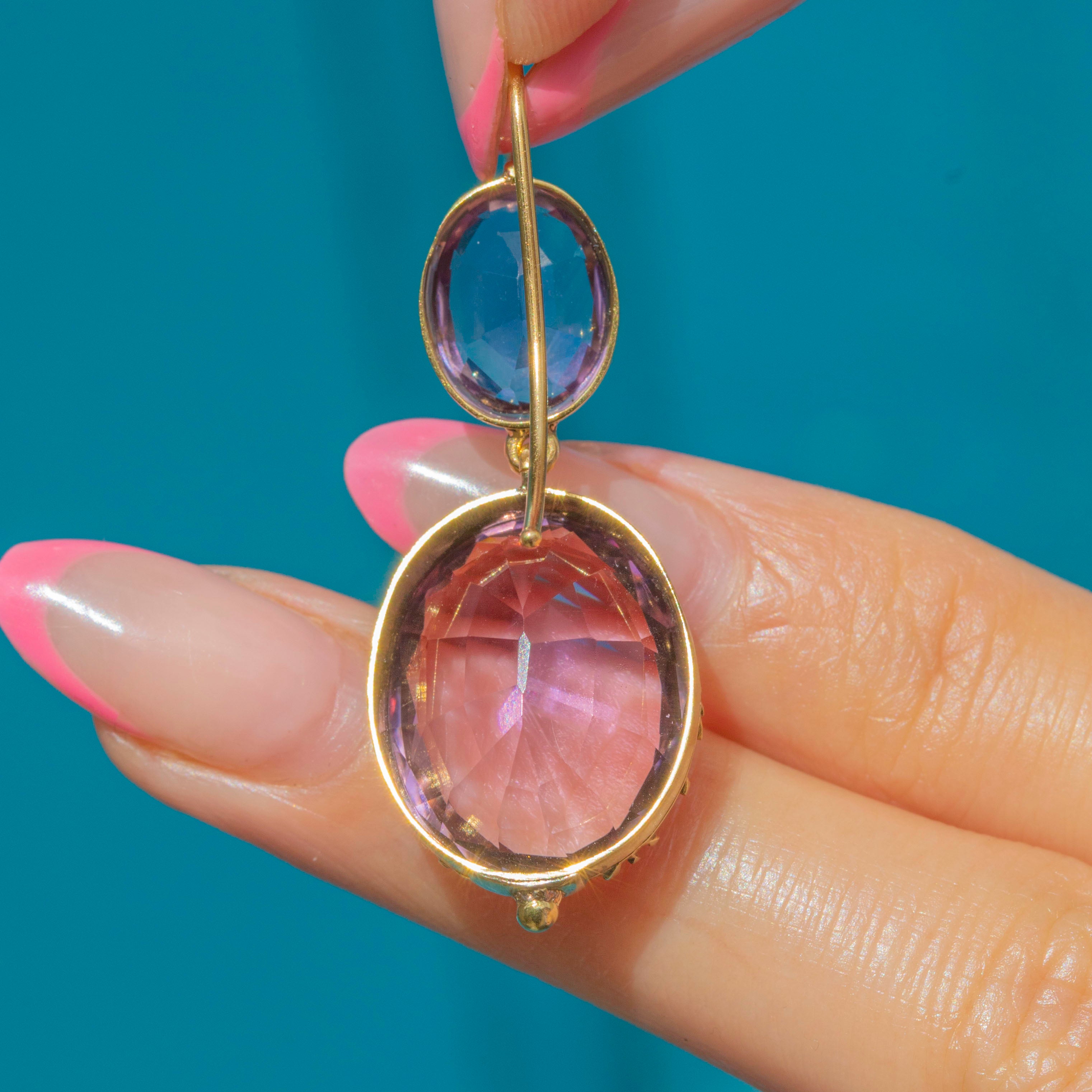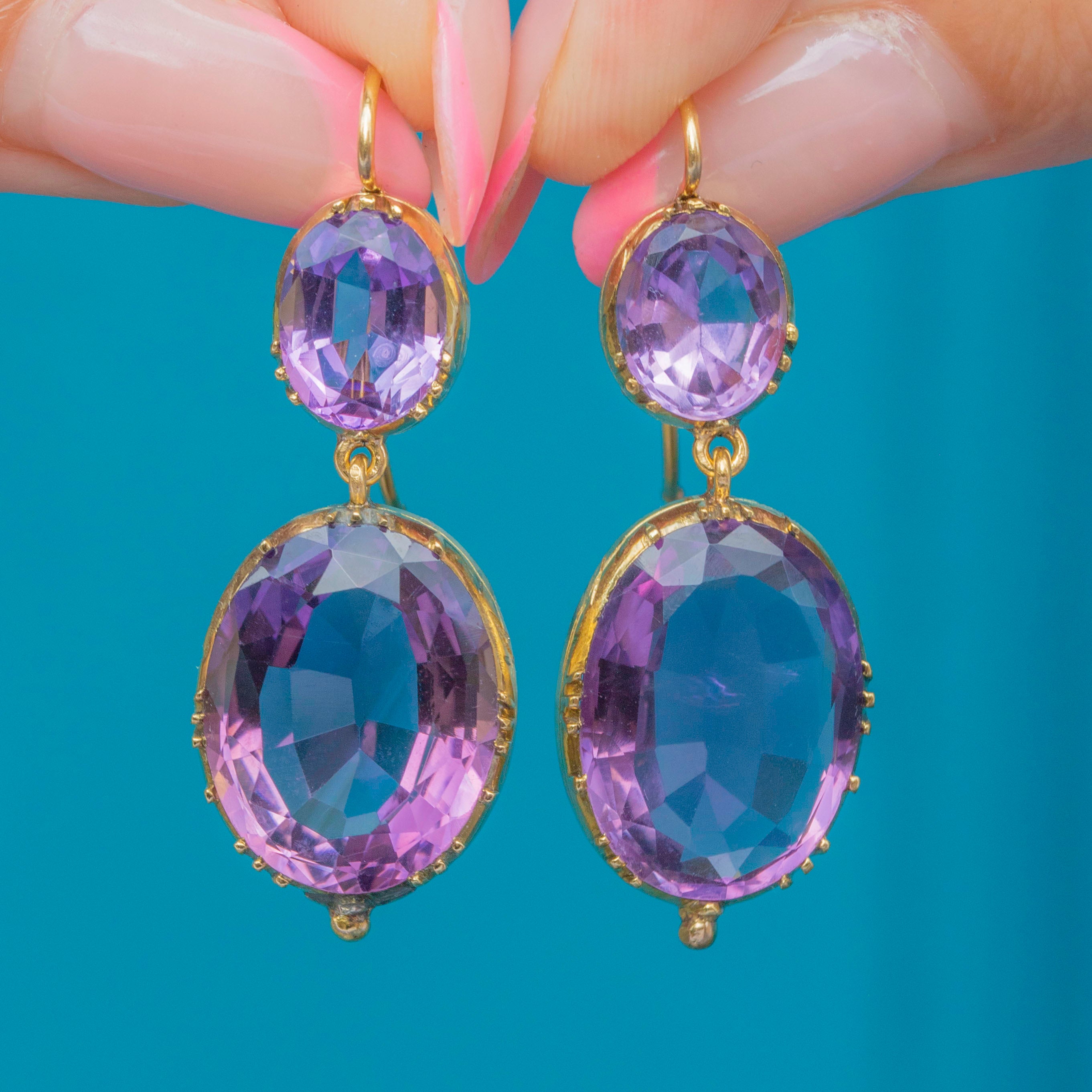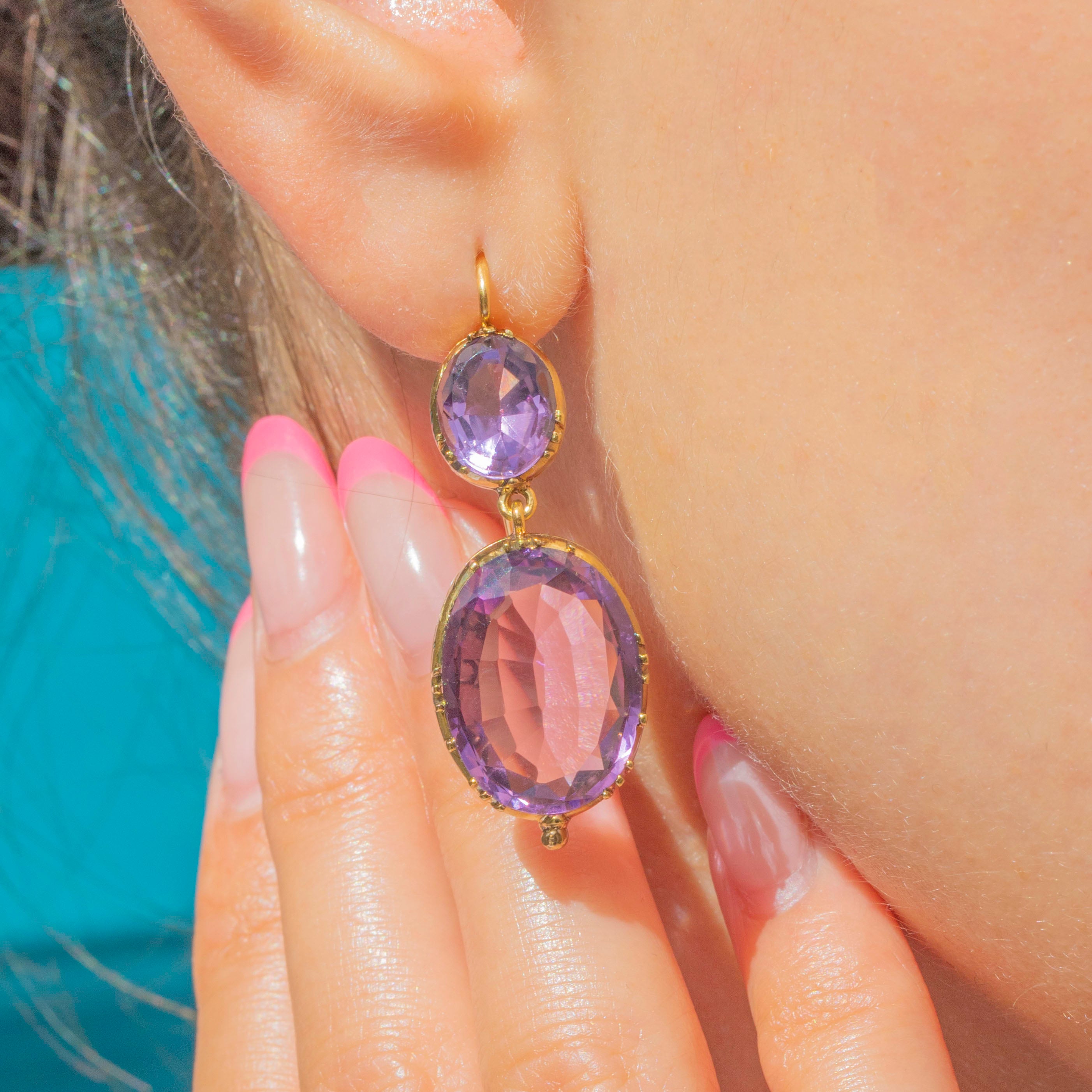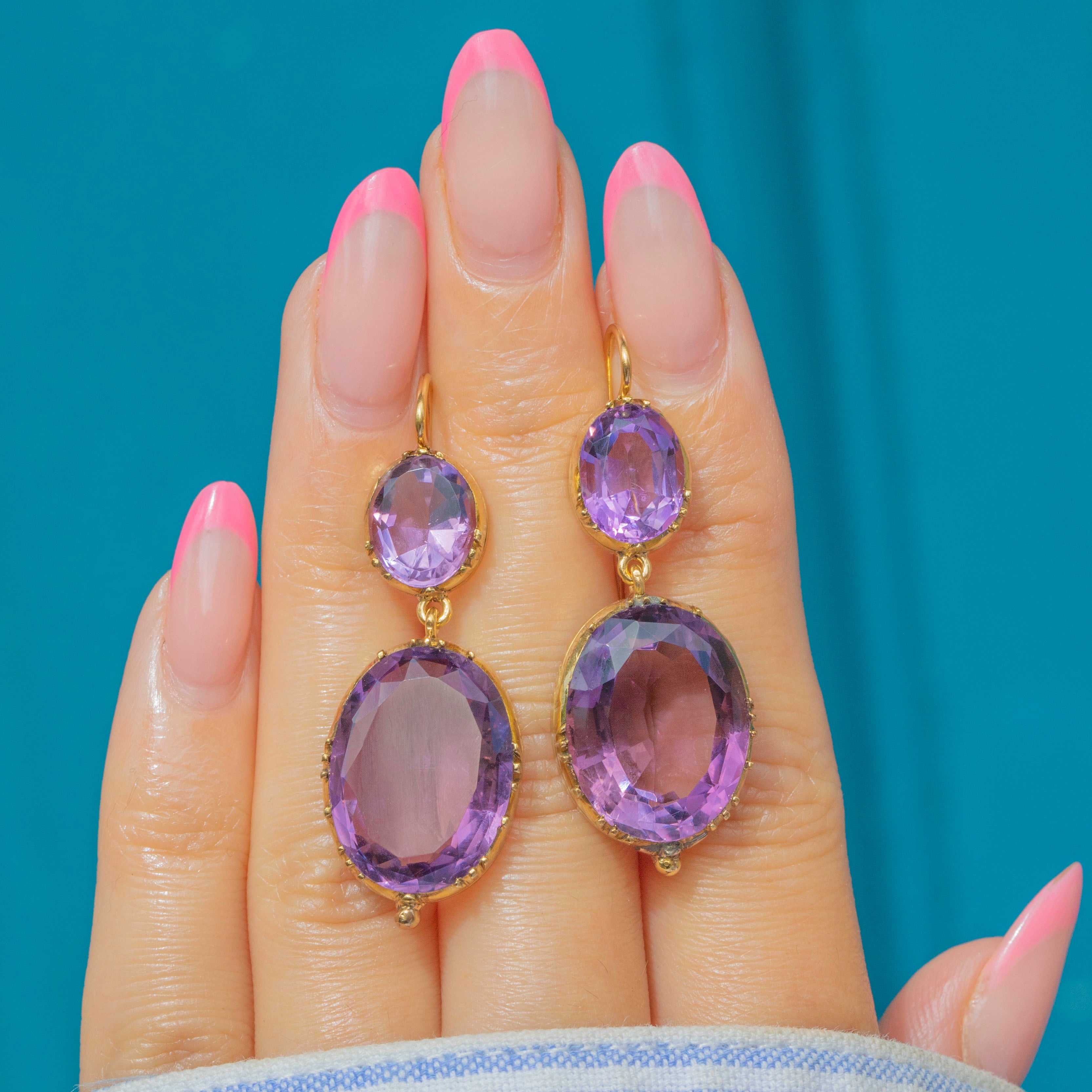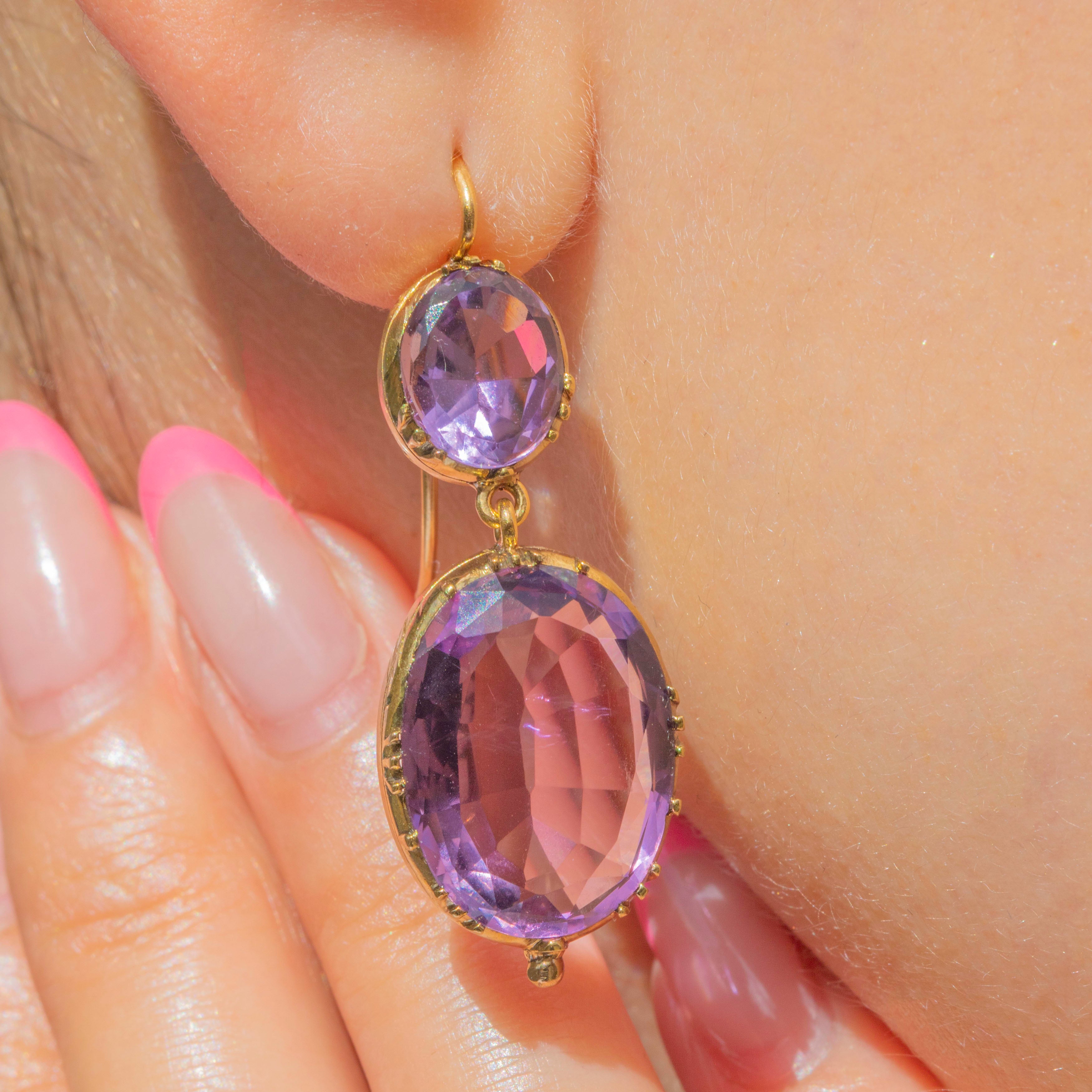 Add a luxurious accent to your outfit with these outstanding Georgian 18ct Gold Amethyst drop earrings! Each drop boasts two exquisitely hand-cut Amethysts, with a combined 21.82ct weight, shimmering with lavender and lilac hues as their facets dance in the light.