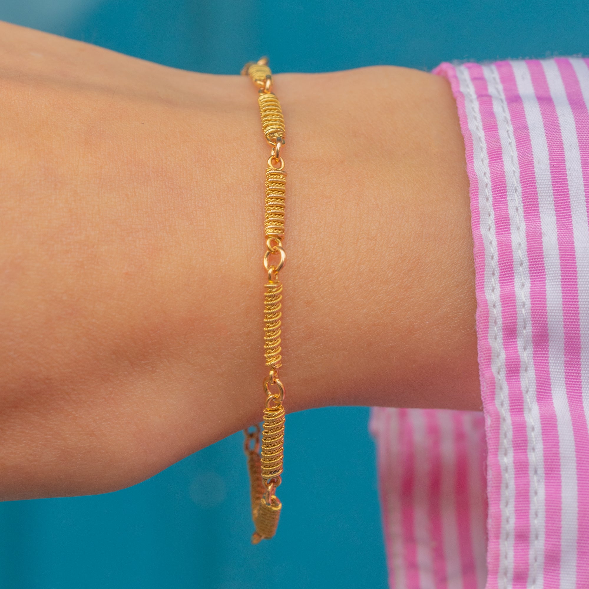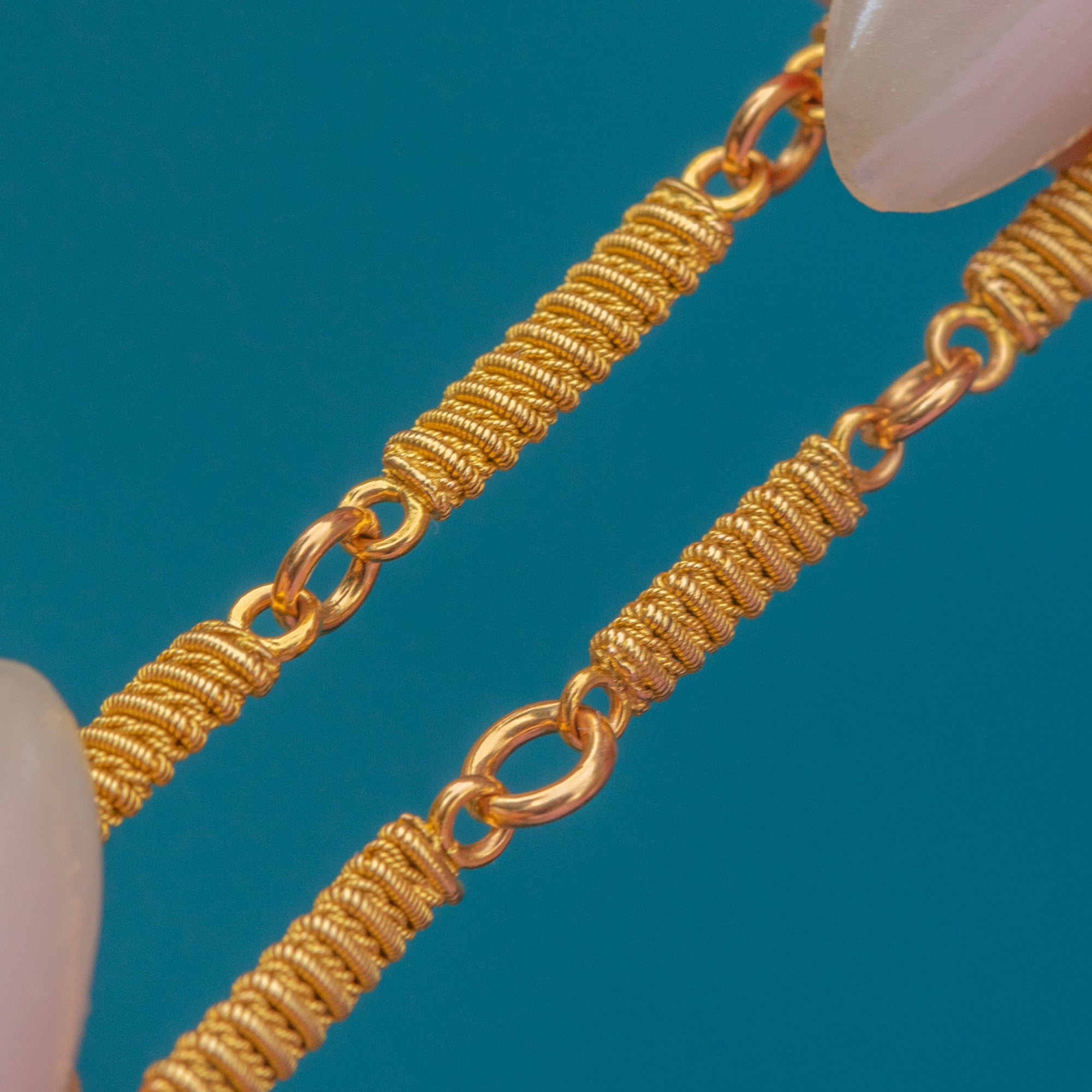 This exquisite antique 18ct Gold bracelet, dated 1780, features finely crafted Cannetille bar links which create a rich texture and depth. Its warm, glossy finish has been beautifully preserved, showcasing the intricate detailing of each link.