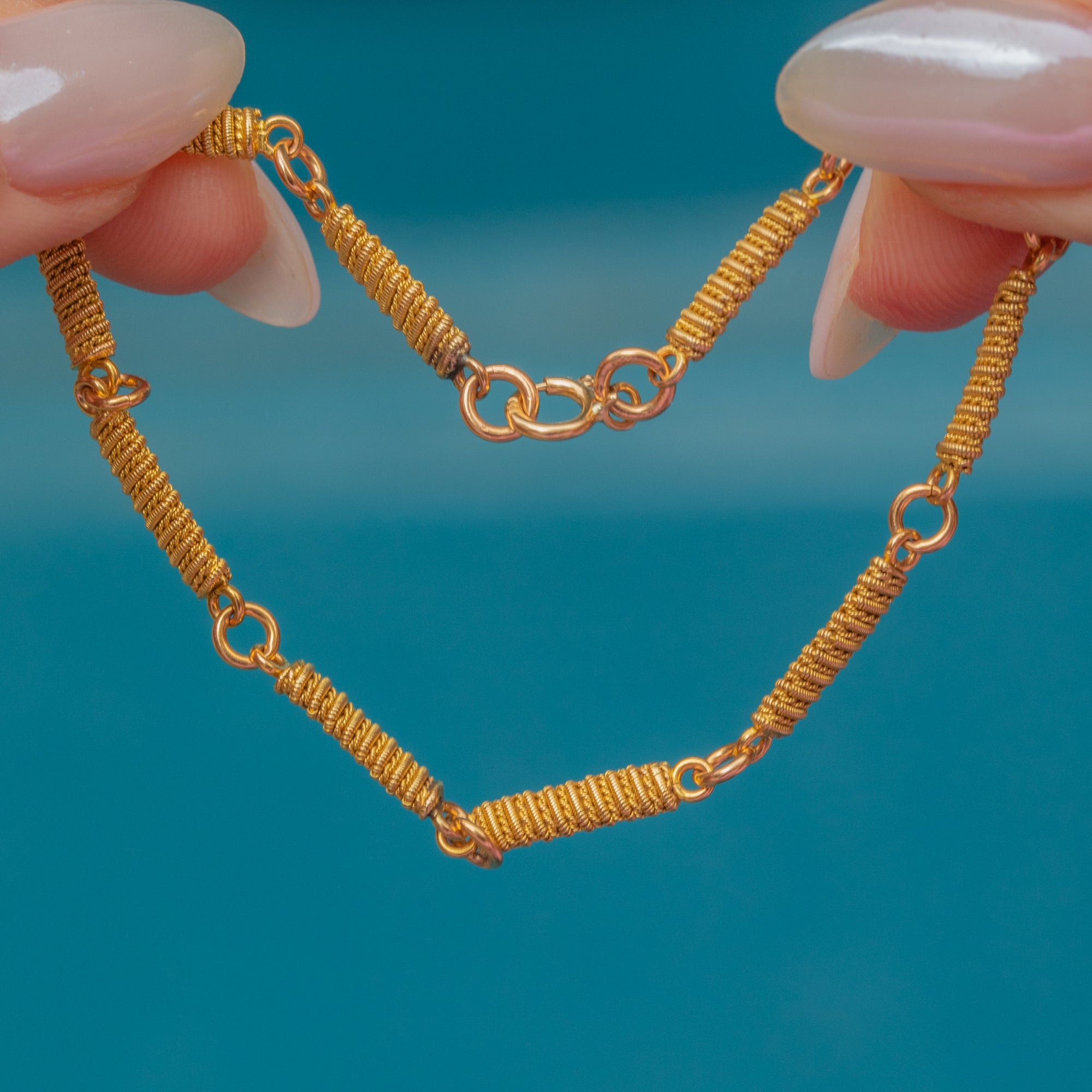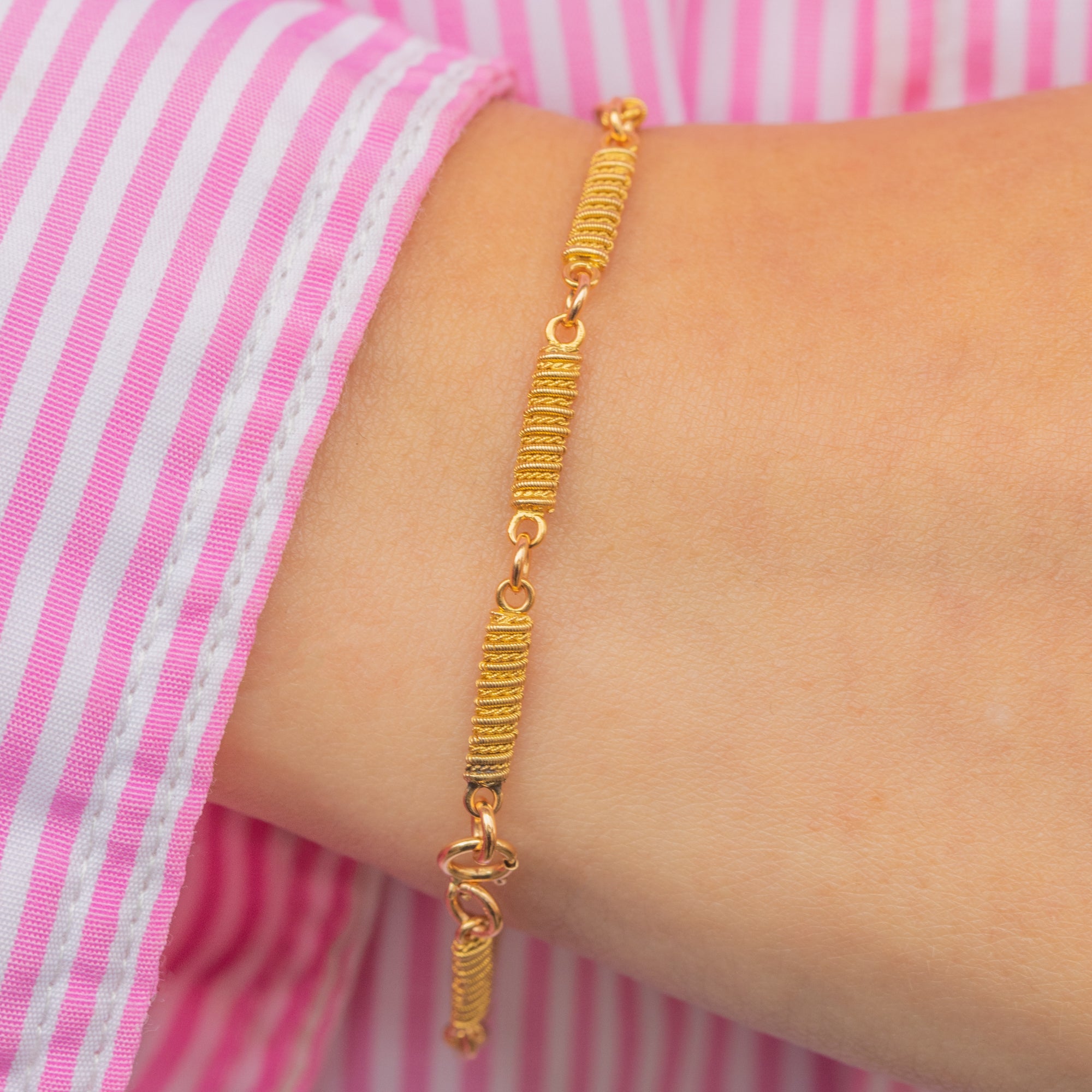 VERY GOOD-EXCELLENT: The Gold is bright and buttery, with each Cannetille link adding lovely intricate detail. The bolt ring requires a firm push to close, though it is fully functioning, allowing you to wear this Georgian 18ct Gold bar link bracelet with utmost confidence.