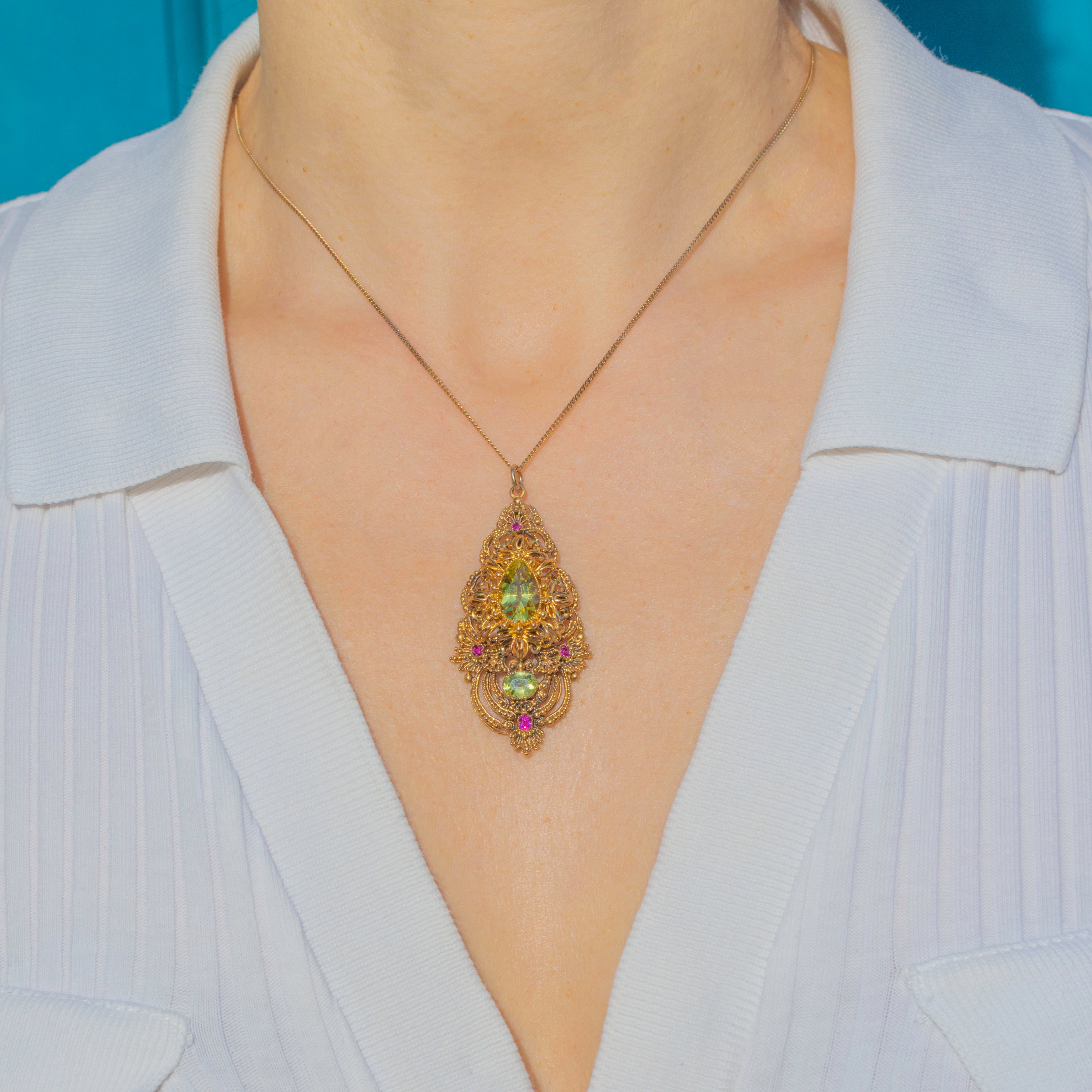 At its heart rests a glowing Pear-shaped Chrysoberyl of approx 2.65ct, complemented by a further oval Chrysoberyl and four natural Ruby accents for a regal pop of colour.