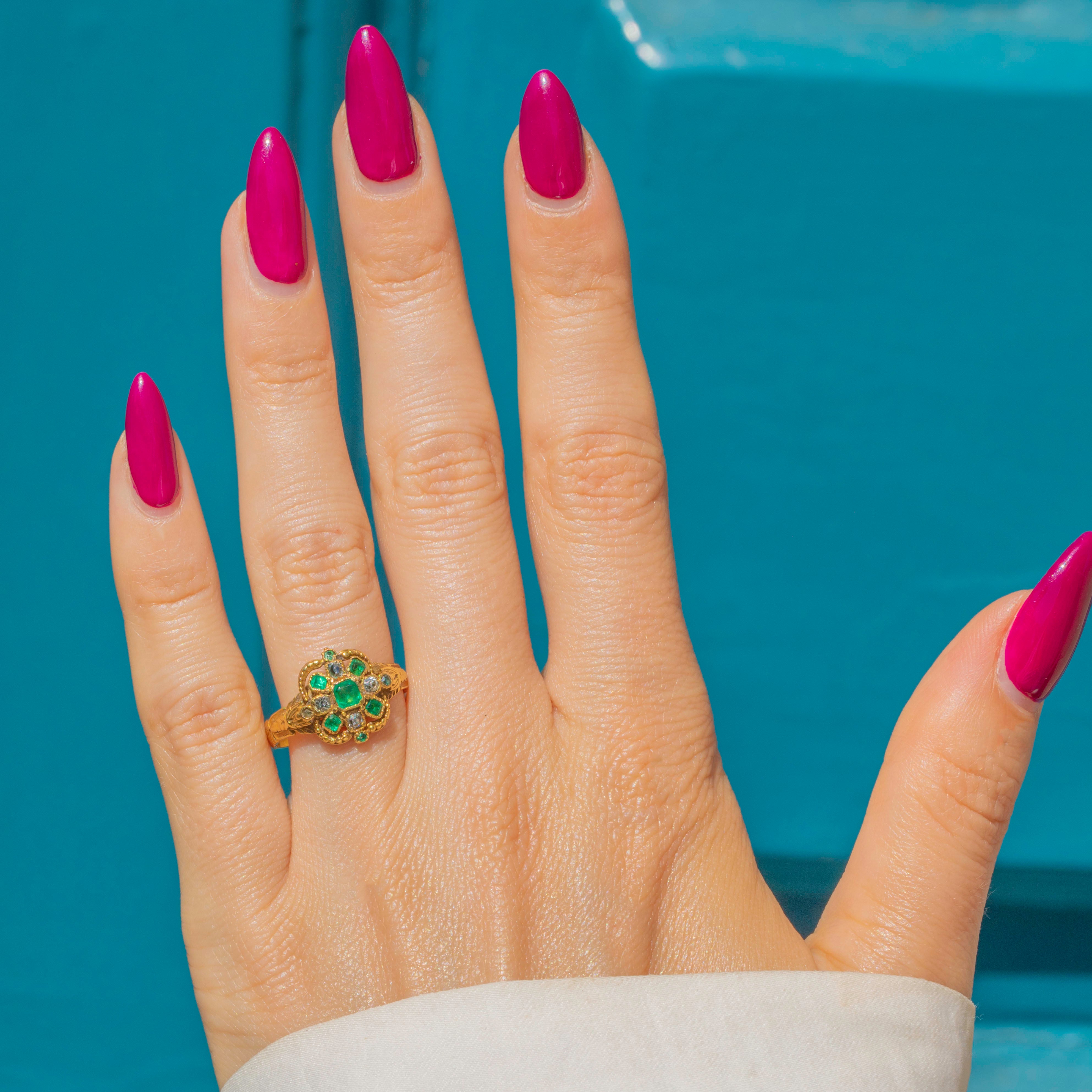 This Georgian Diamond Emerald ring is spectacular! Boasting bright peruzzi Diamonds and Natural Emeralds set in saturated 18ct Gold and arranged into a striking floral cluster.