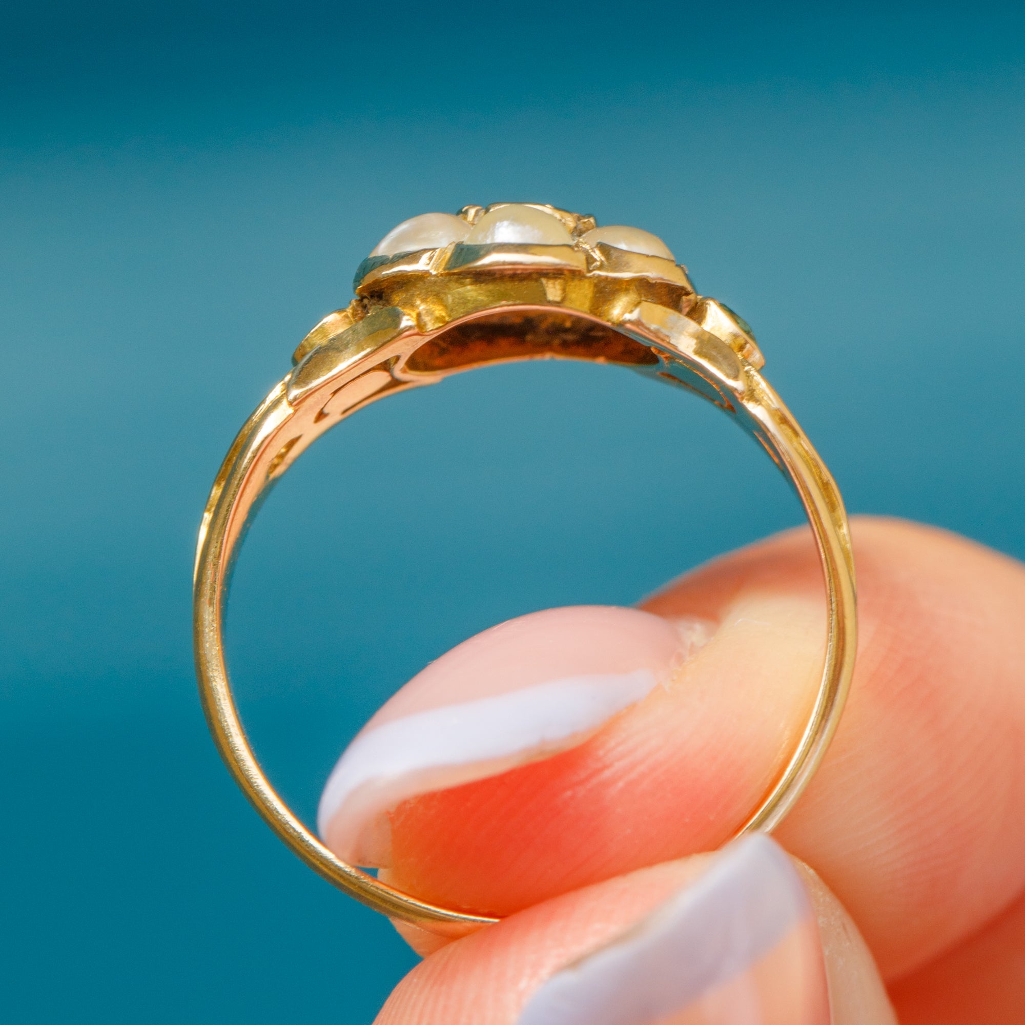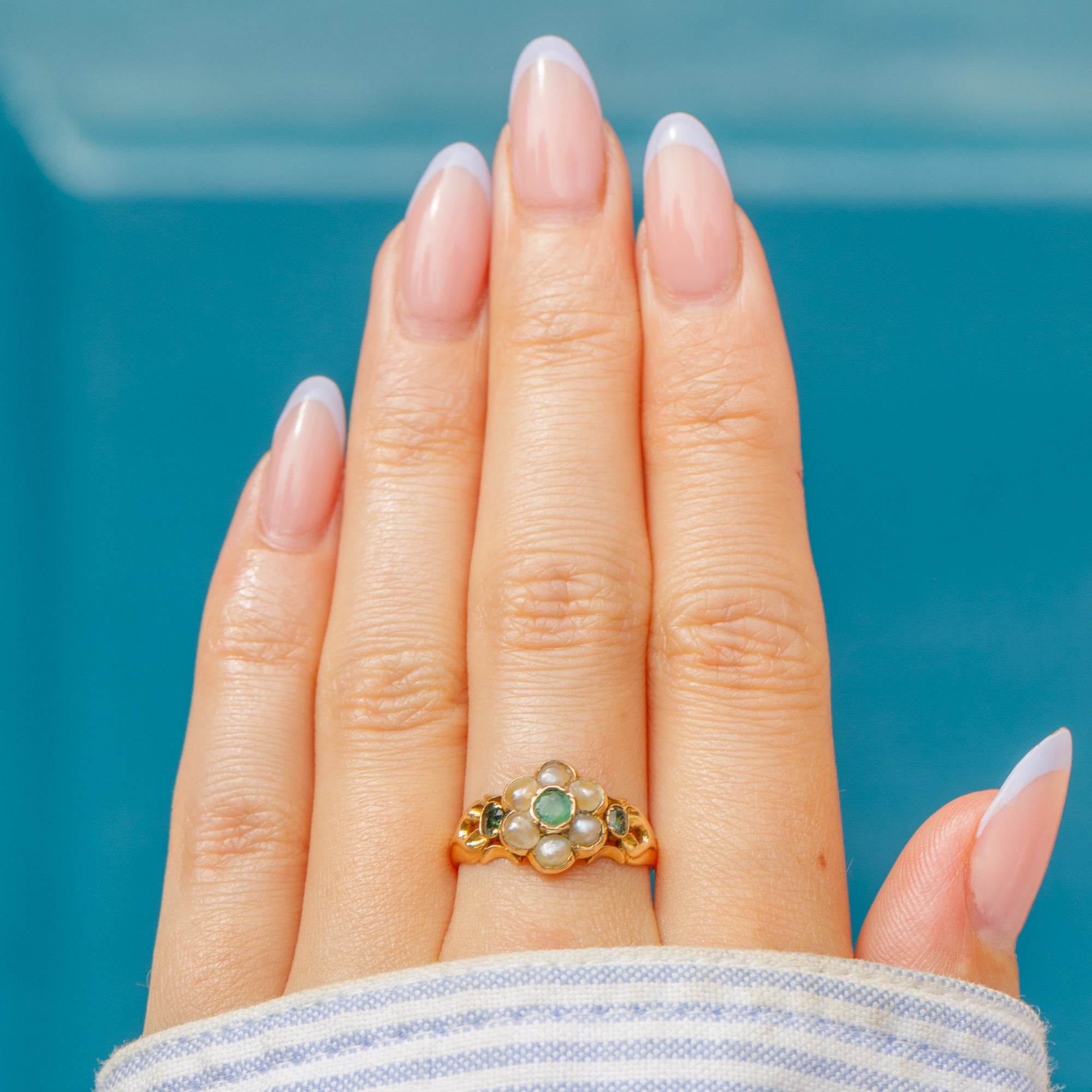 Exquisitely crafted almost two centuries ago, this Georgian 18ct Gold Emerald & Pearl daisy flower ring looks as though she's been plucked from an enchanted forest! The luxurious gemstone cluster displays deep green Emeralds and plump iridescent Pearls, forming a delectable, eye-catching flower.