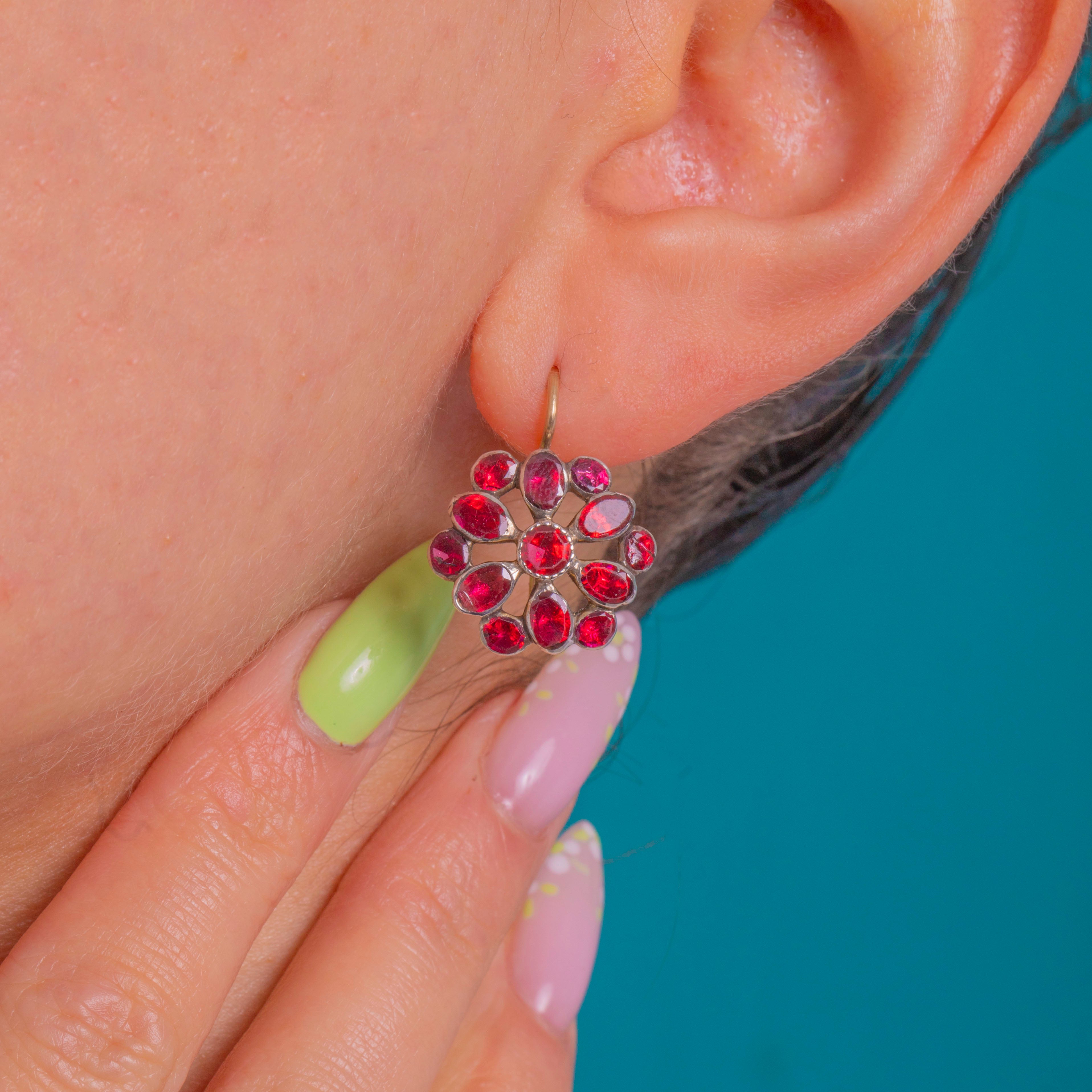 Glowing with rich cherry-red hues, these Georgian Garnet cluster earrings bloom into delicate floral rosettes. Each earring is composed of individually bezel-set Garnets arranged around a central round stone, the Silver settings lending a soft antique patina that beautifully offsets the saturated reds.