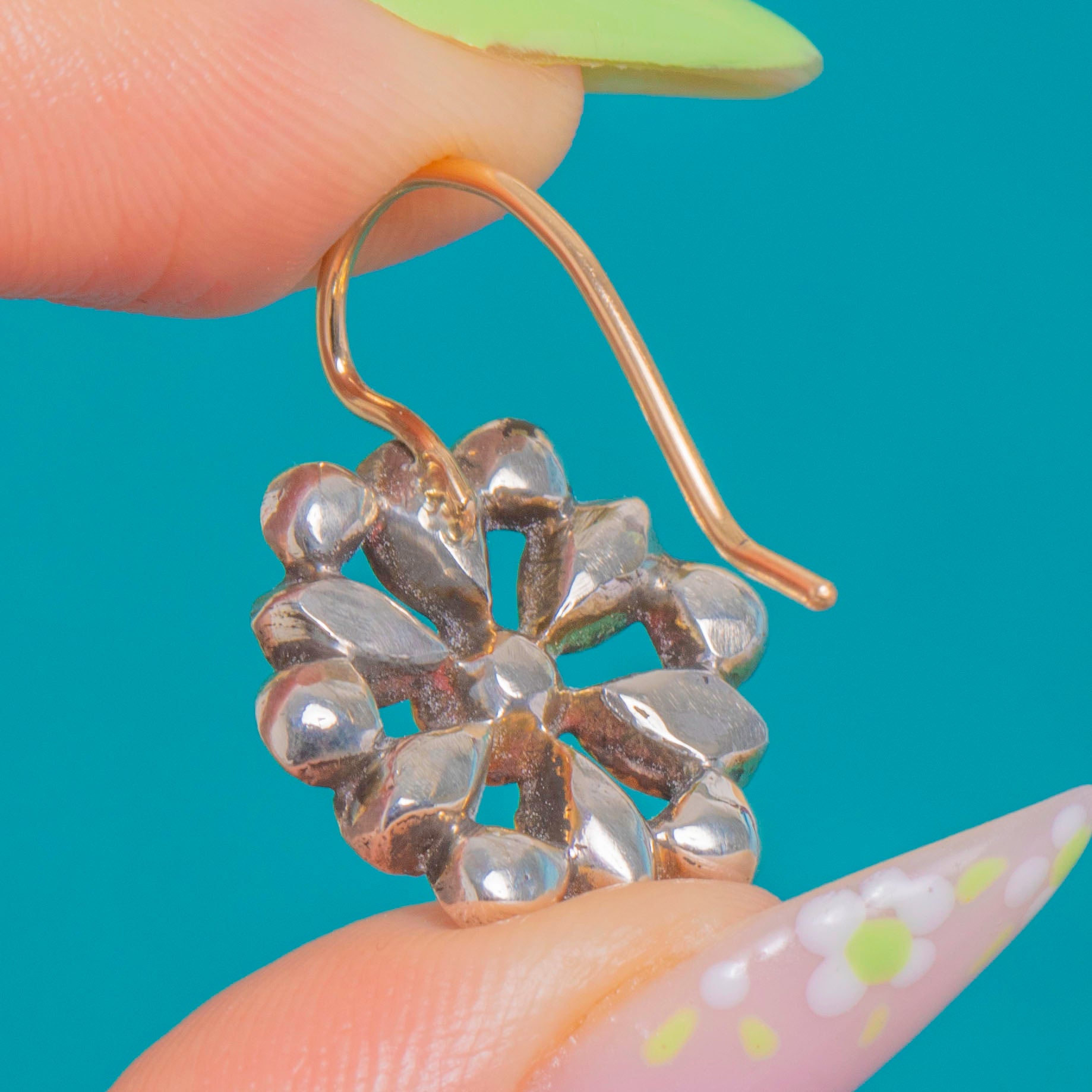Suspended from elegant 18ct Gold shepherd hooks, the contrasting metals add warmth and refinement. The compact, symmetrical clusters feel feminine and decorative, with the hand-assembled collet work giving that unmistakable period charm and a timeless, romantic allure.