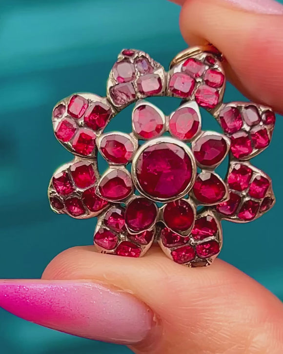 A sumptuous Georgian flower pendant alive with the rich wine-red glow of Flat Cut Garnets. Arranged in a radiant rosette, the stones graduate towards a domed centre, each nestled in hand-worked closed-back collet settings that create a deep, romantic shimmer. The ornate, layered openwork gives air and dimension to the cluster, while an 18ct Gold jump ring adds a refined note to the Silver mount.
