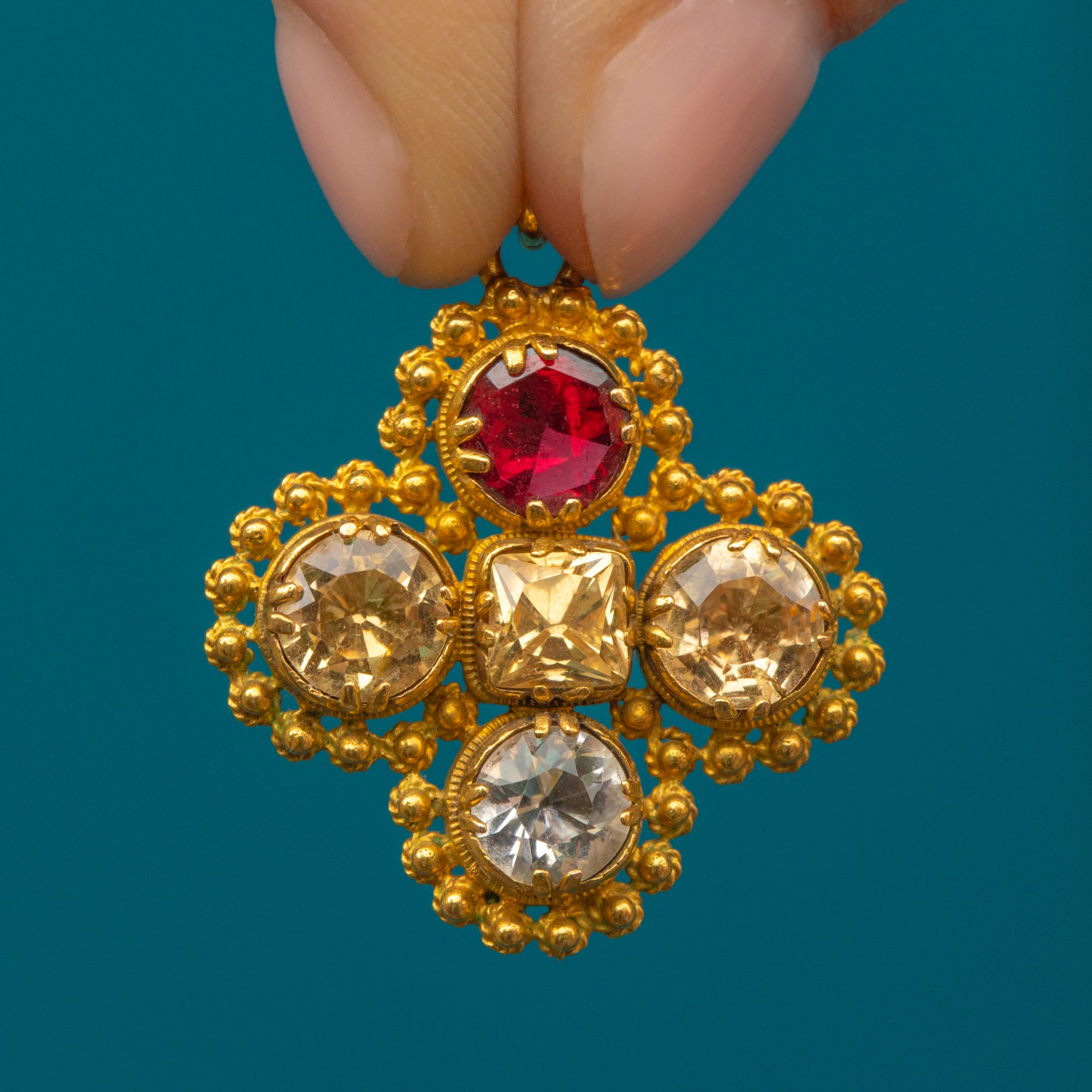 EXCELLENT. This Georgian 18ct Gold Garnet & Topaz harlequin pendant is in excellent condition. The gemstones rest securely in their settings, claws holding them in place. The back of the piece is smooth, and has likely been converted from a brooch, with only little sign of this conversion. The box allows you to keep this treasure safe and sound for the rest of time.