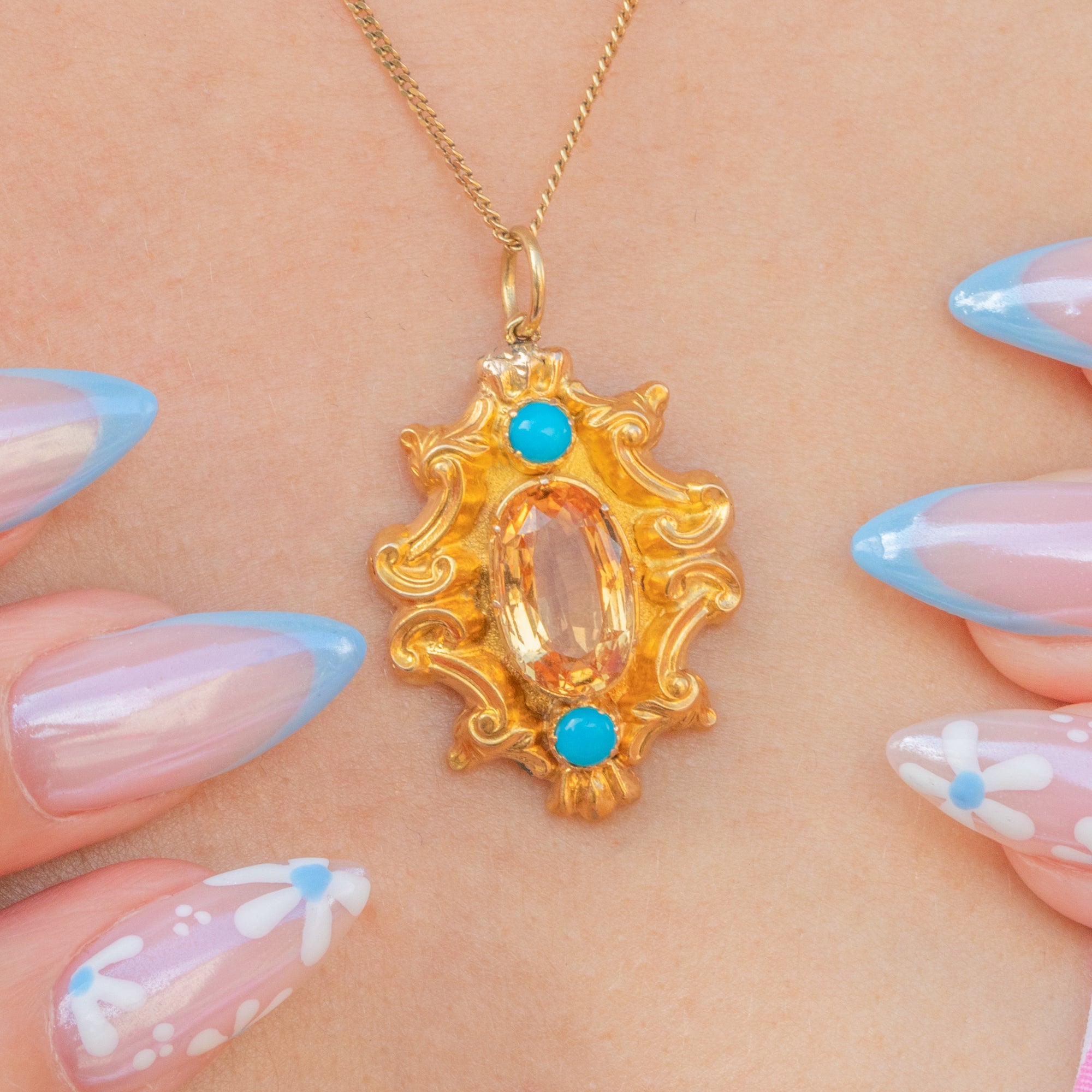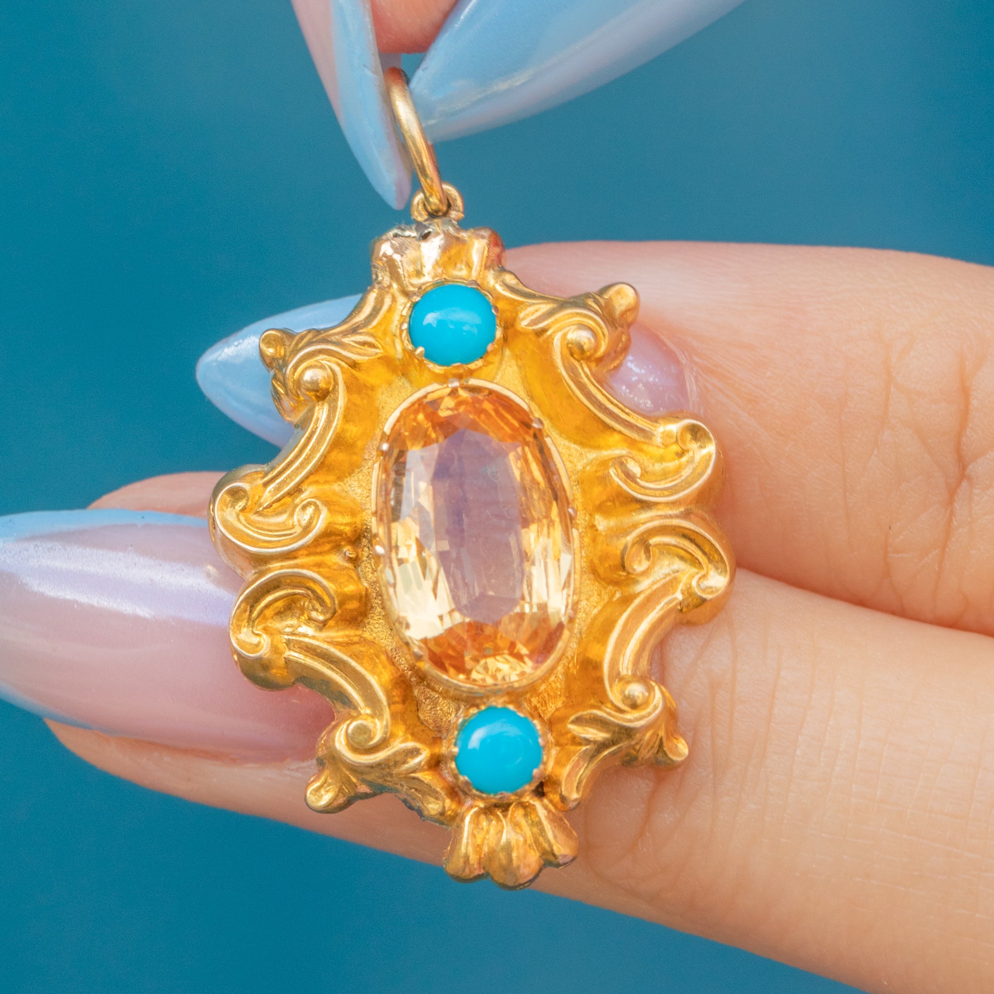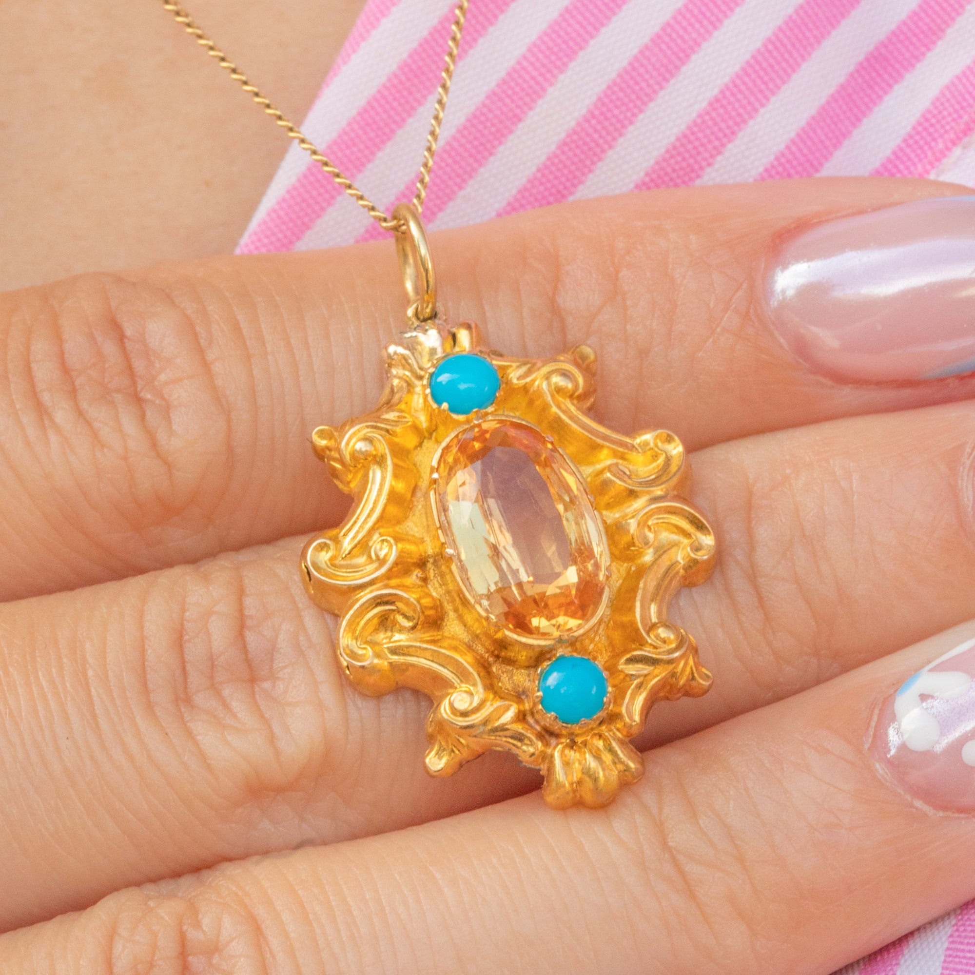 A late Georgian pendant set with a 2.20ct Imperial Topaz and two Turquoise gemstones. The pendant has been exquisitely designed, in typical Regency fashion, with bright pops of colour from the Turquoise and a warm radiance from the Imperial Topaz.