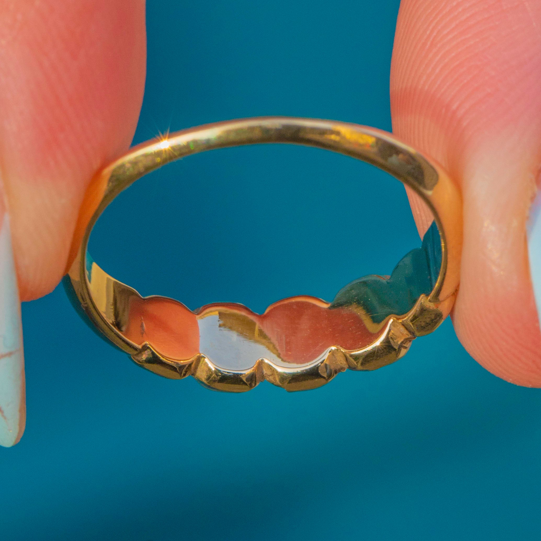 A lyrical Georgian five-stone half hoop, crafted in rich 18ct Gold and set with Natural Pearls that graduate softly across the finger. Each domed Pearl nestles in scalloped settings, creating a romantic, low-profile line of glow and gentle shimmer.