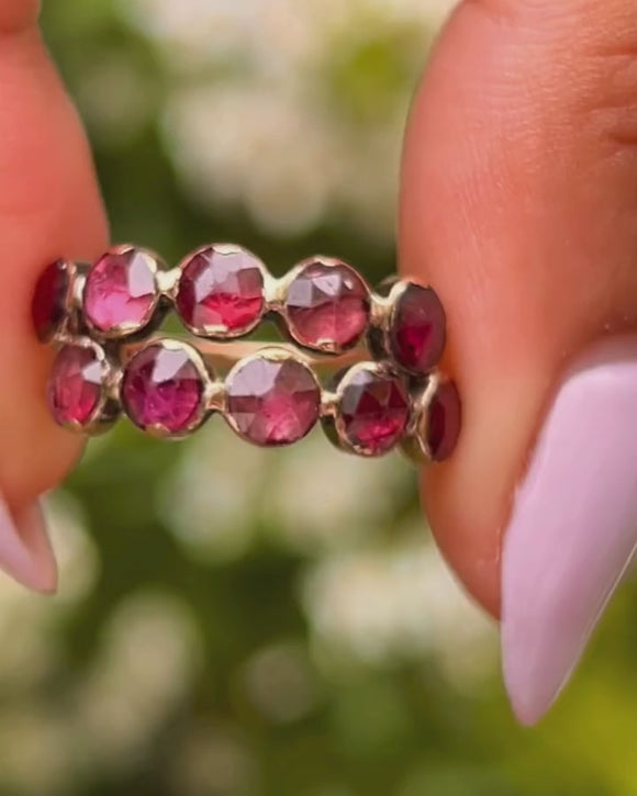 Ten gorgeous Georgian Garnets are suspended in a half hoop design across the 18ct Gold ring shank, offering an elegant and sophisticated look. The rose-cut gems are another sign of Georgian style, making this ring a unique treasure within your jewellery collection.