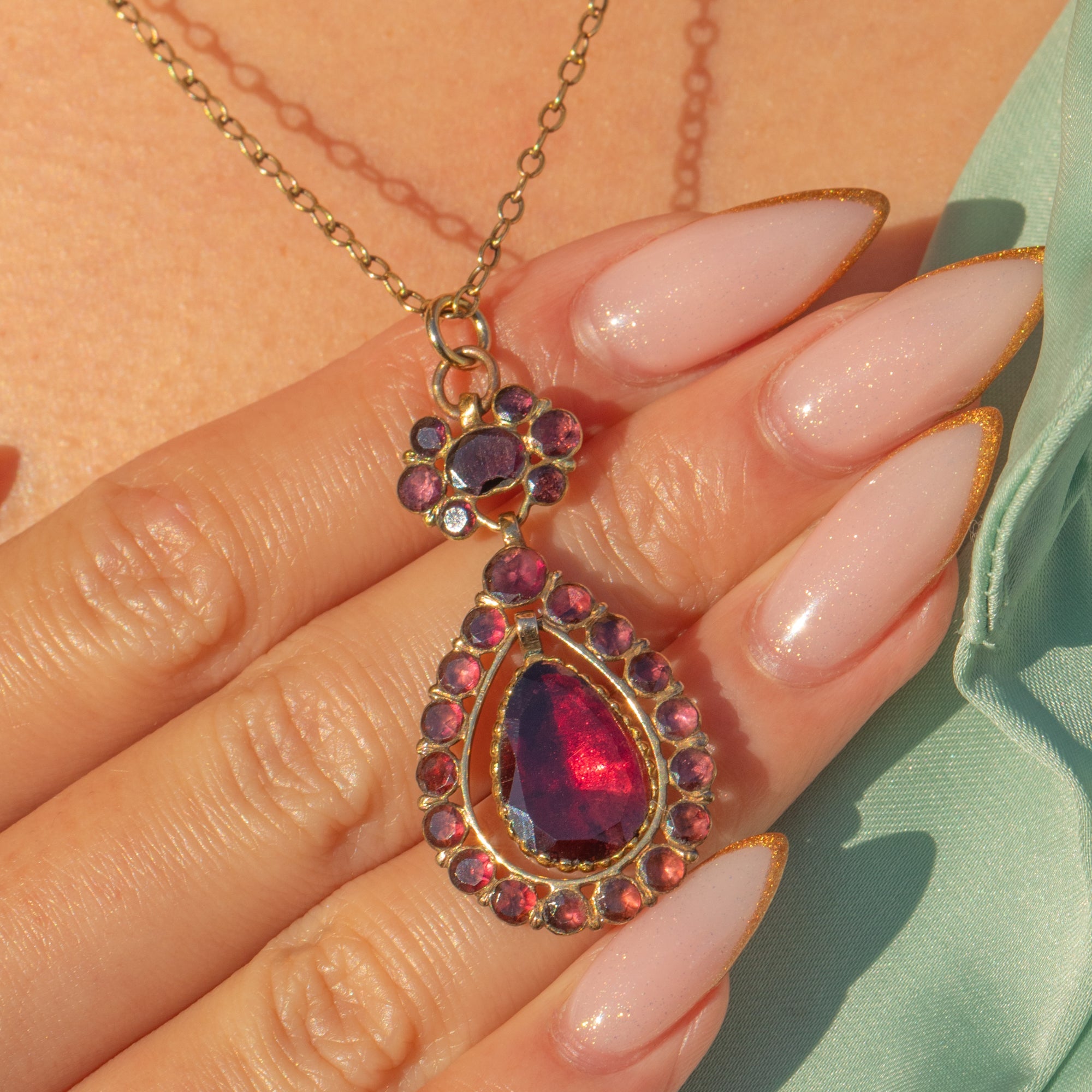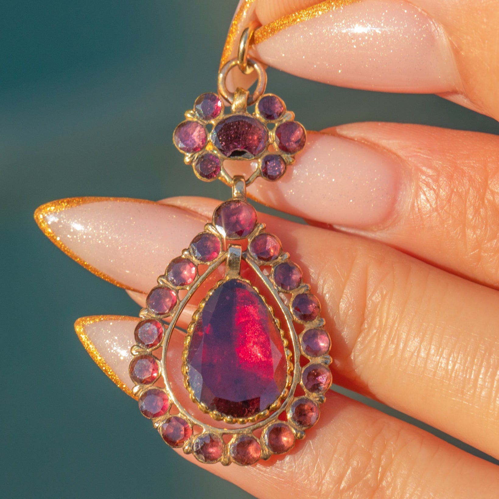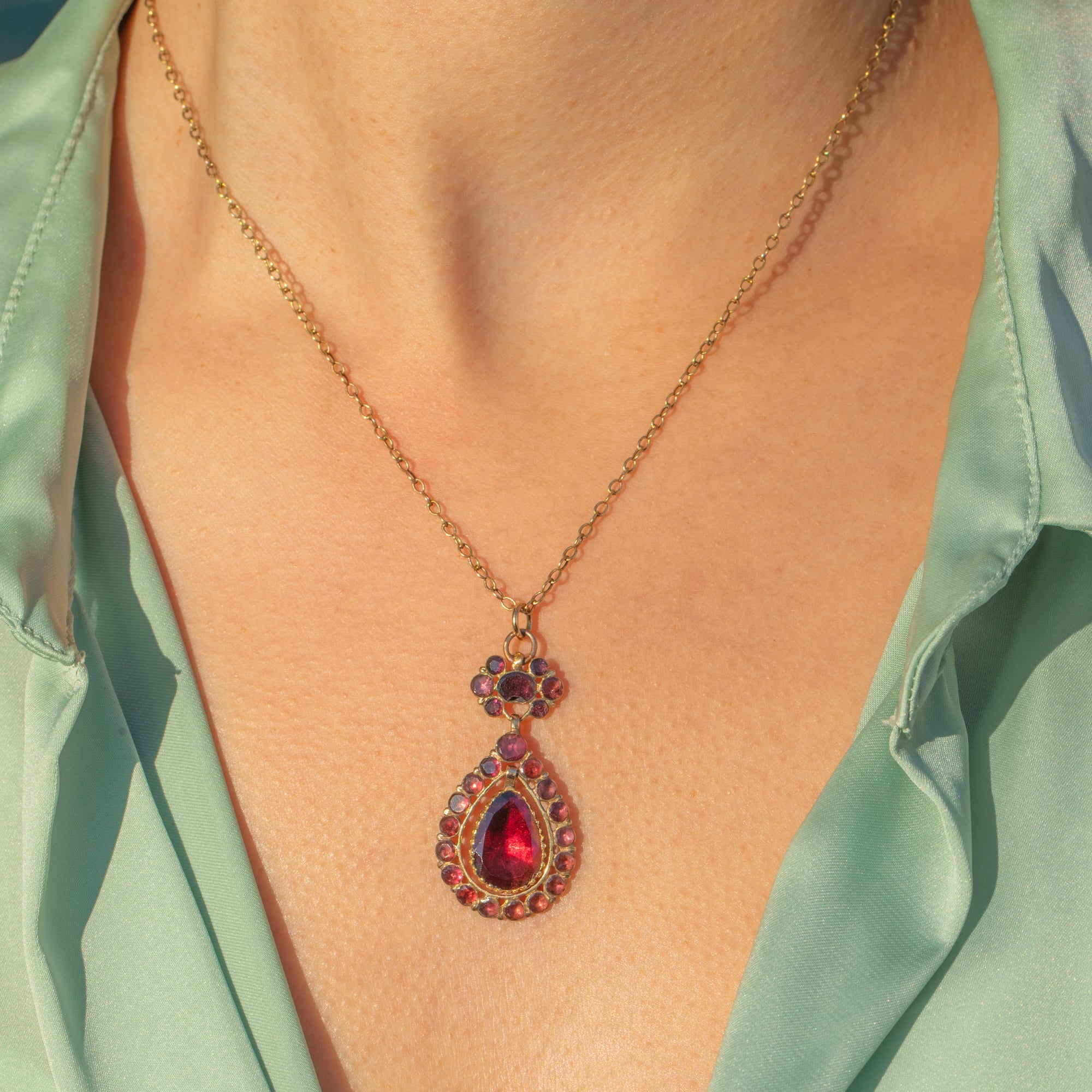 This exquisite Georgian flat-cut Garnet pendant is a beautiful and rare survival from the late 18th century. Crafted entirely in rich 18ct Gold, it features glowing Queen Anne–style flat-cut Garnets arranged in a classic Georgian cluster with an articulated pear-shaped drop. The movement of the drop adds elegance and life, enhancing the warm, wine-red glow of the Garnets.