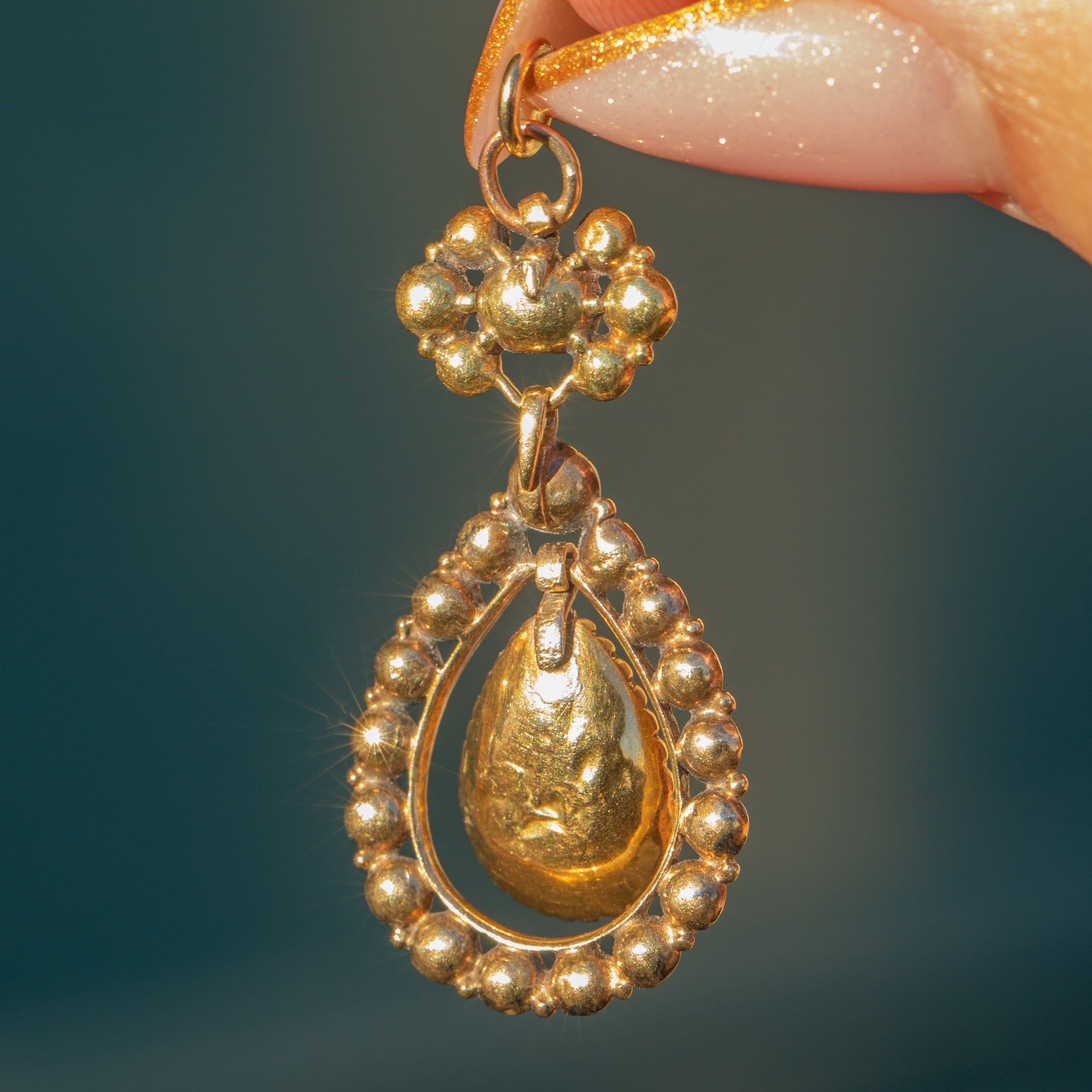 VERY GOOD: The Garnets display rich, even colour with only light surface wear expected of Georgian flat-cut stones. Gold settings are well preserved with secure foiling and minimal age-related wear, including some dinks and dents on the back. There is a chip to one of the flat cut Garnets but this hardly impacts the impression of the piece. Articulated drop moves freely and the pendant remains strong, wearable and beautifully cared for.