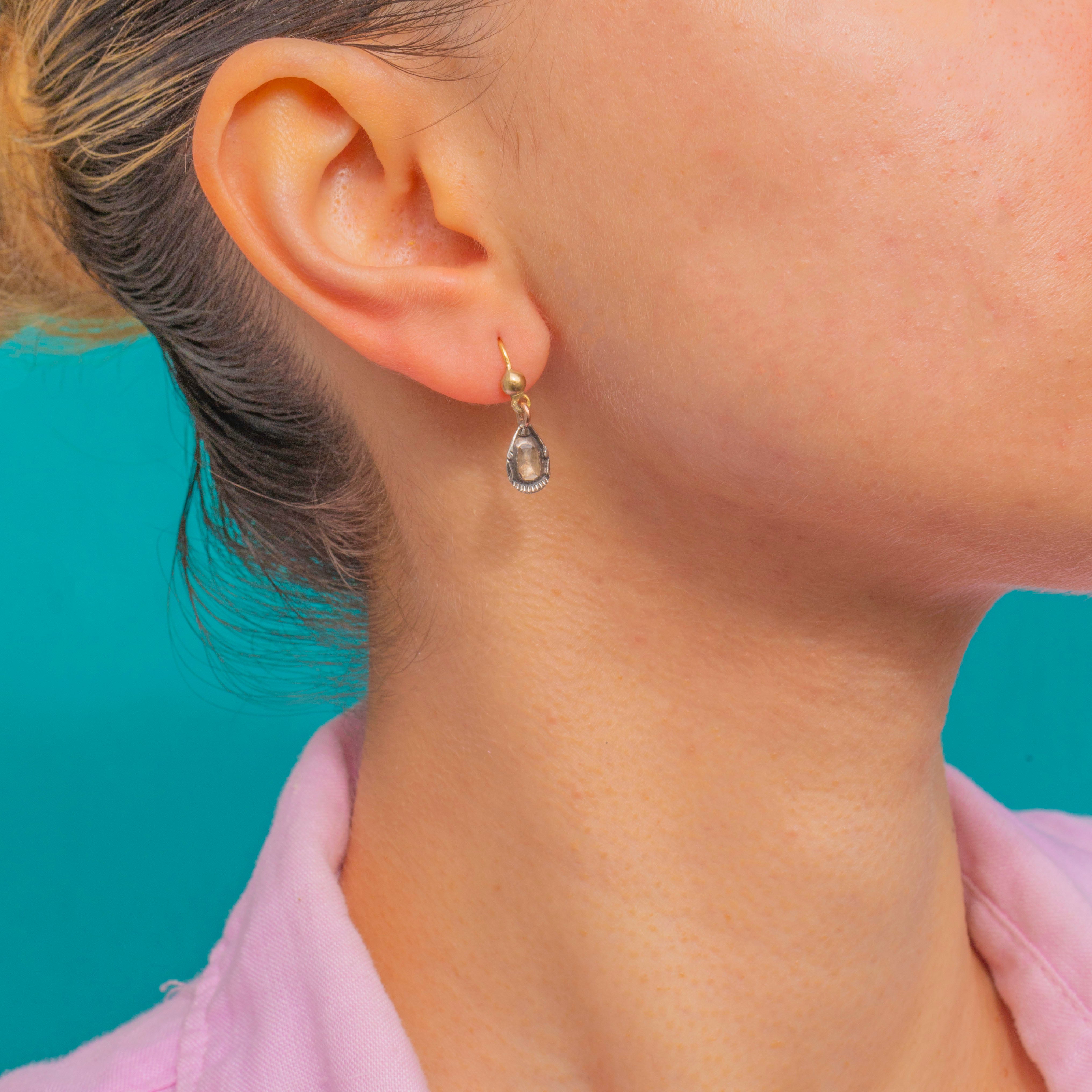 EXCELLENT: The rose-cut Diamonds are bright with crisp antique facets and only the lightest age-consistent wear under magnification. Silver settings are well-preserved with a rich, even patina and minimal surface marks; the later 18ct Gold hooks are secure and neatly finished. Overall beautifully cared for, with no notable issues to report.