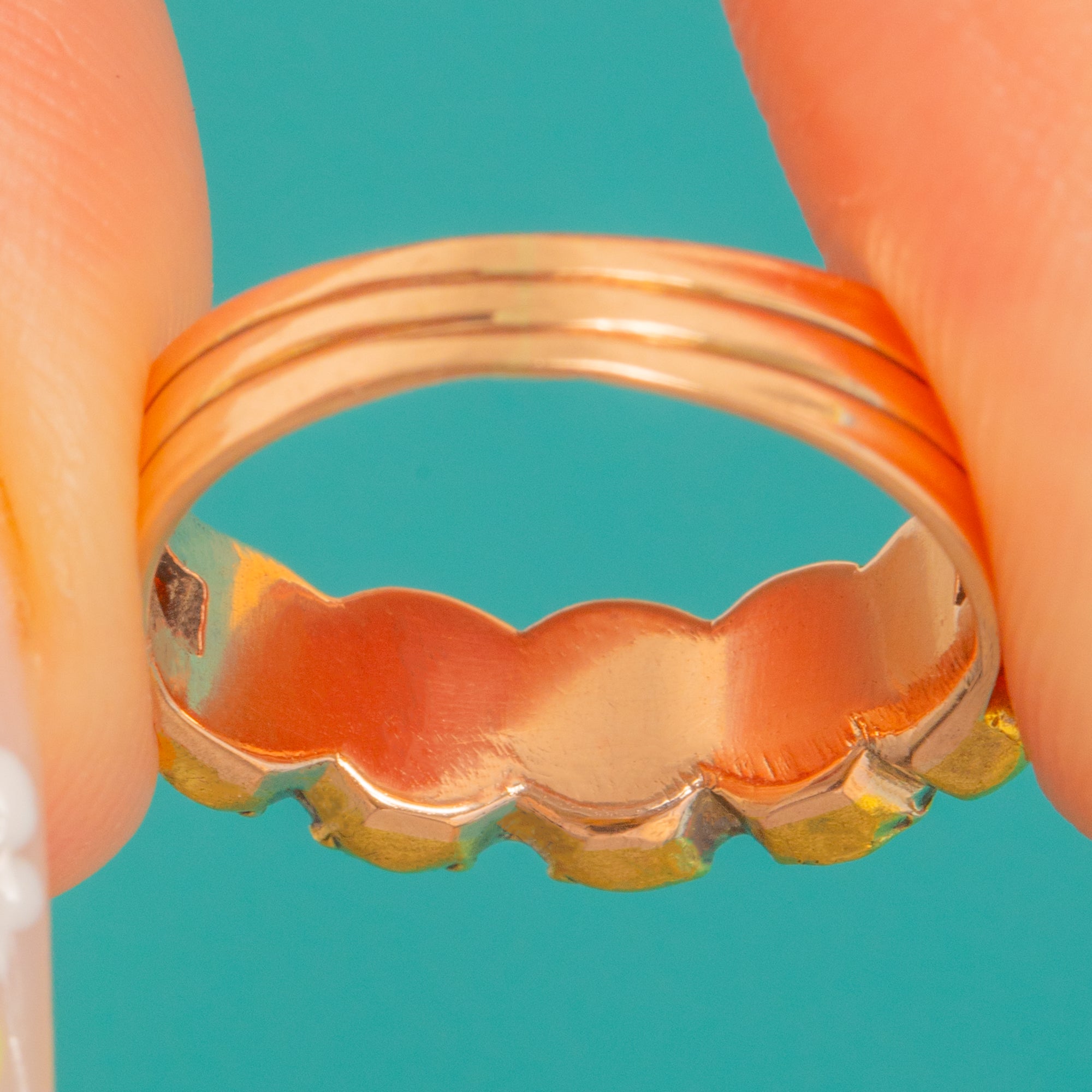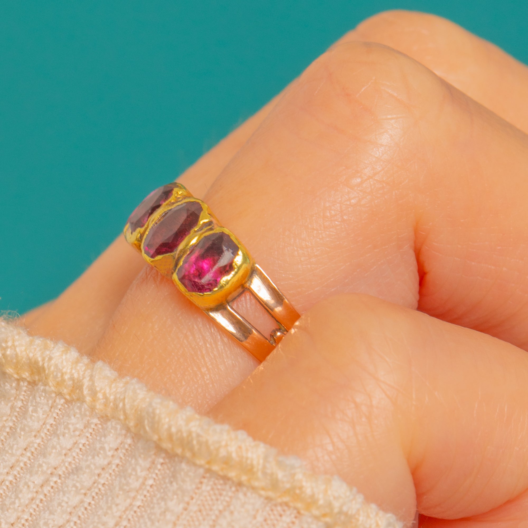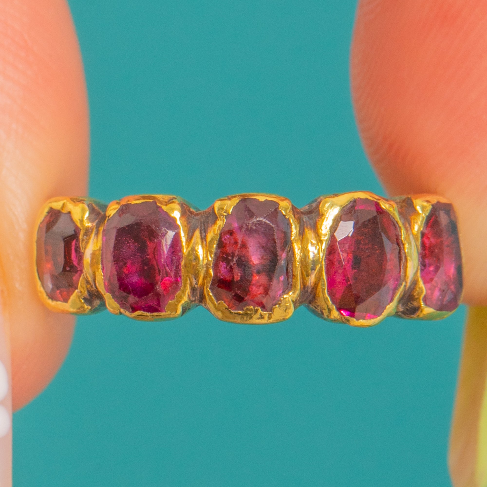 A jewel of Georgian elegance, this half-hoop ring showcases five flat-cut, foiled Garnets glowing with rich wine-red hues. Each stone sits in a scalloped 15ct Yellow Gold closed-back collet, their foil enhancing that romantic, candlelit depth so beloved of the era. The low profile and hand-finished details give it a refined, softly antiqued charm.