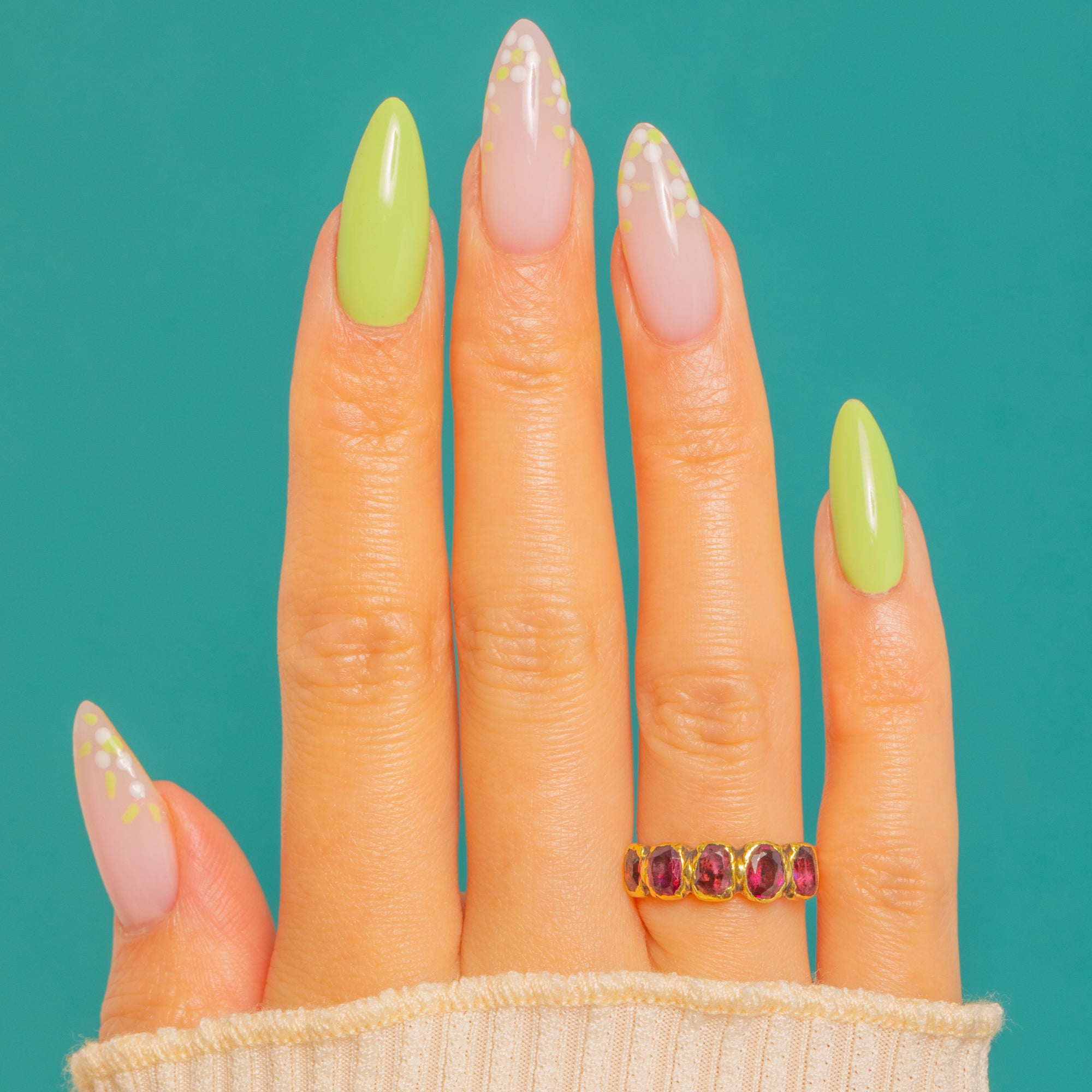 Beautifully two-tone, the rosy 9ct Gold band contrasts with the brighter 15ct settings for a subtle play of colour and texture. Delightful worn alone or stacked, it’s a quintessential Georgian treasure with approximately 1.50ct of Garnets shimmering across the finger.