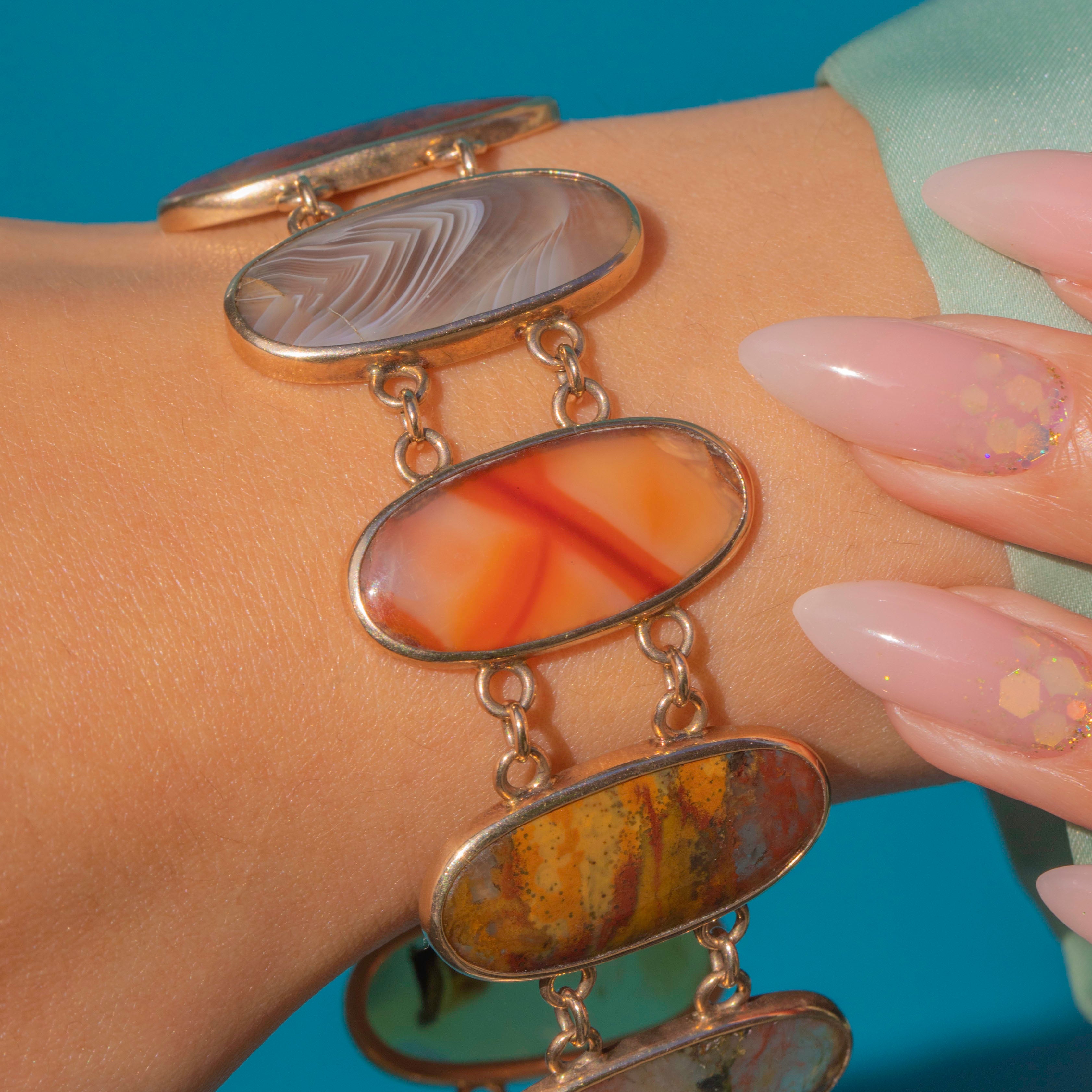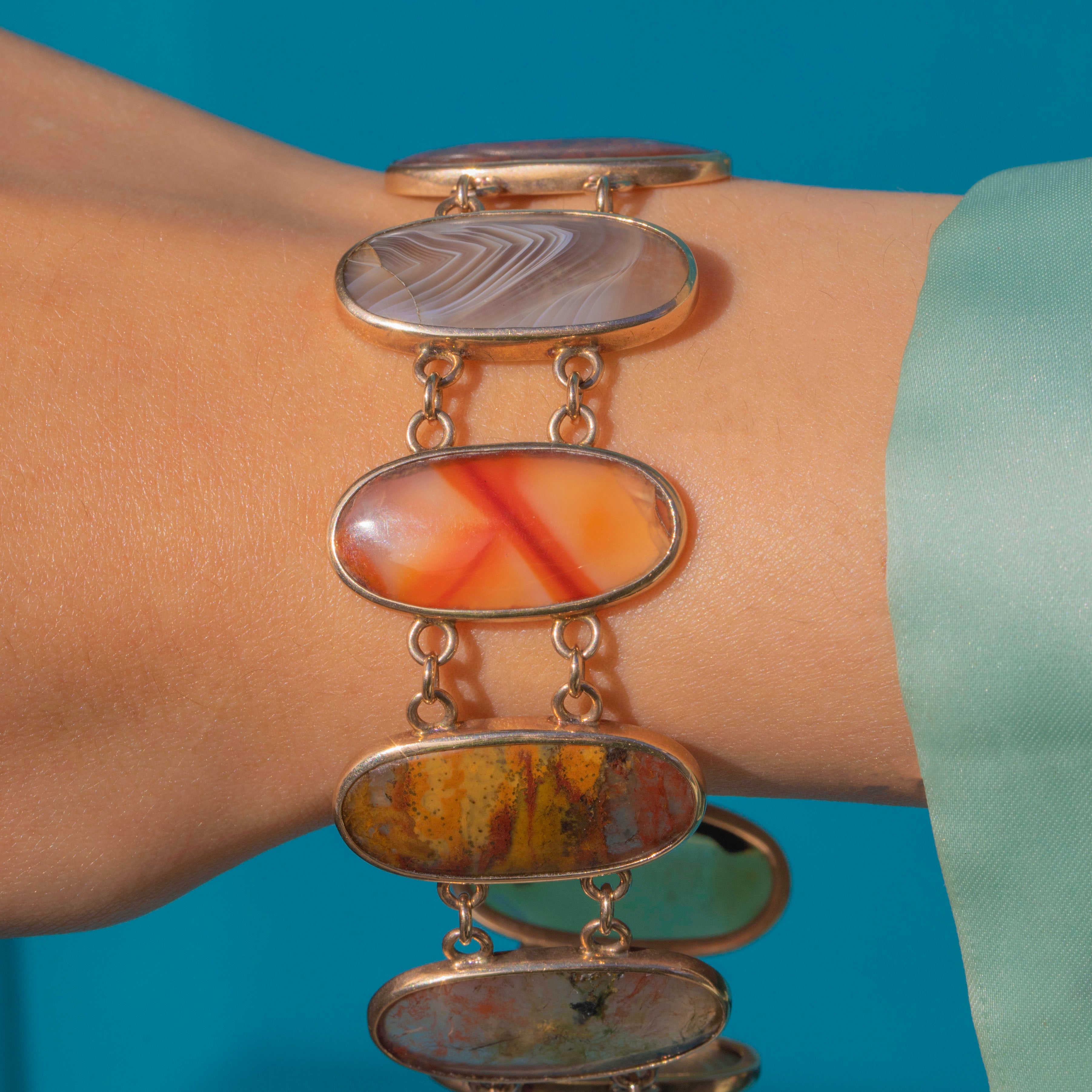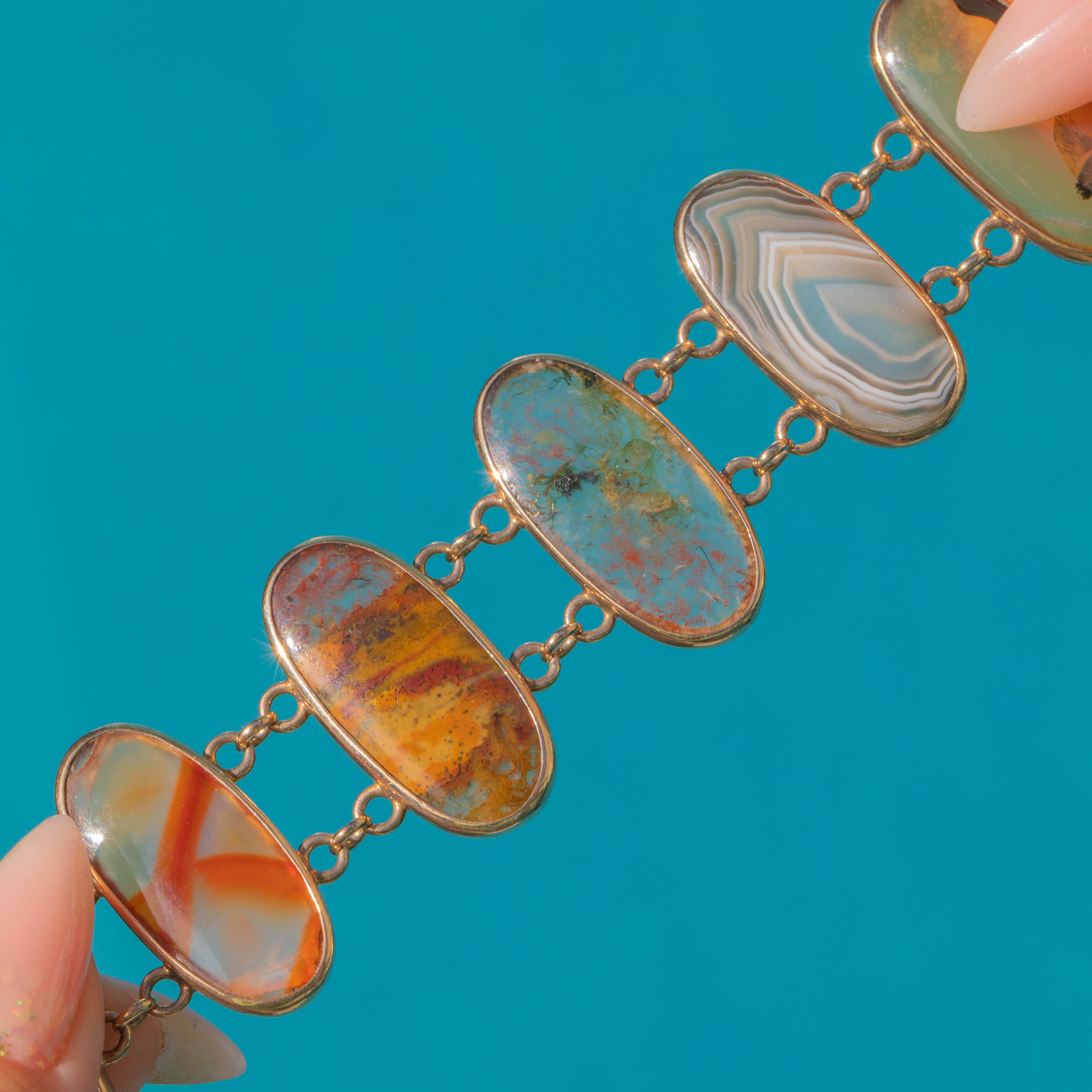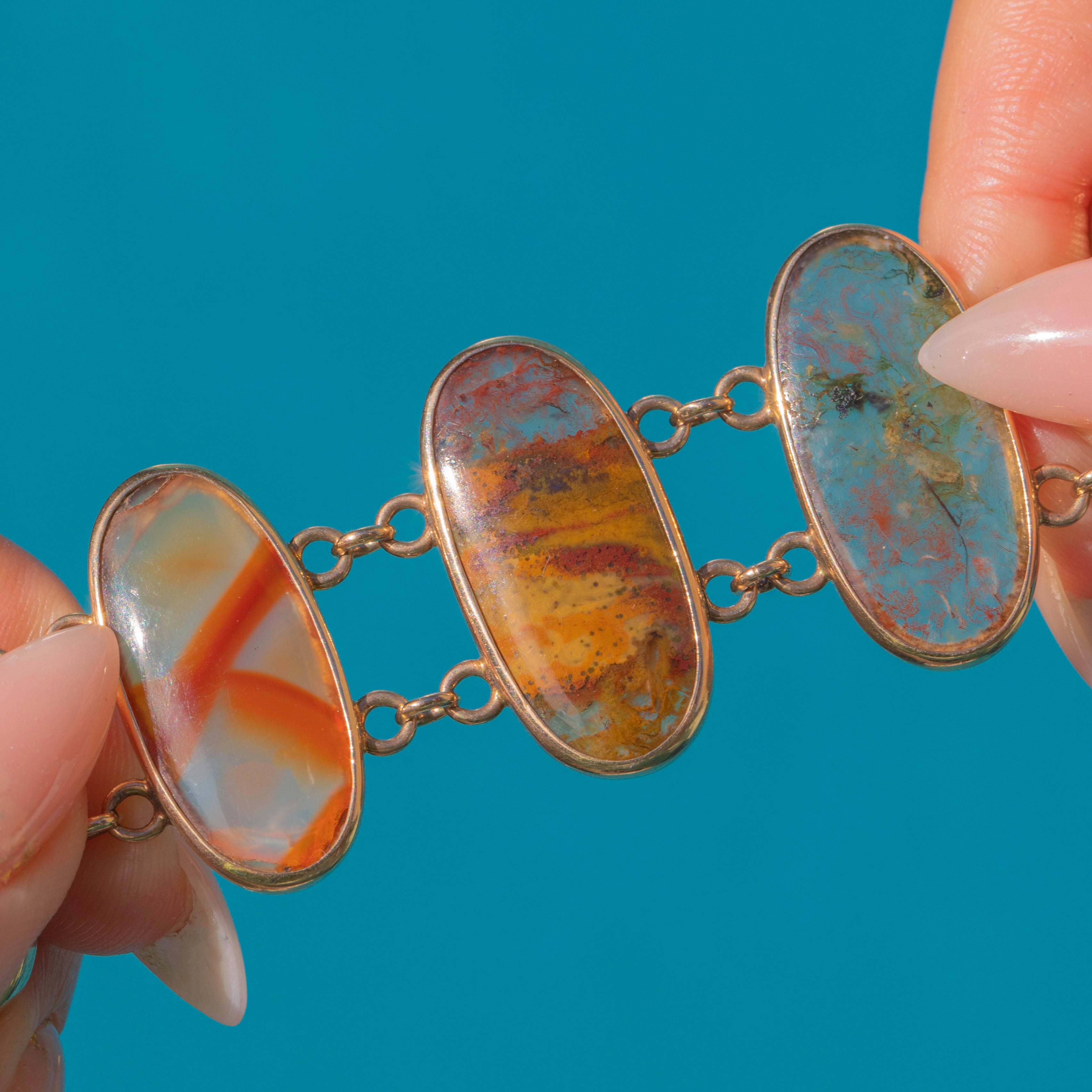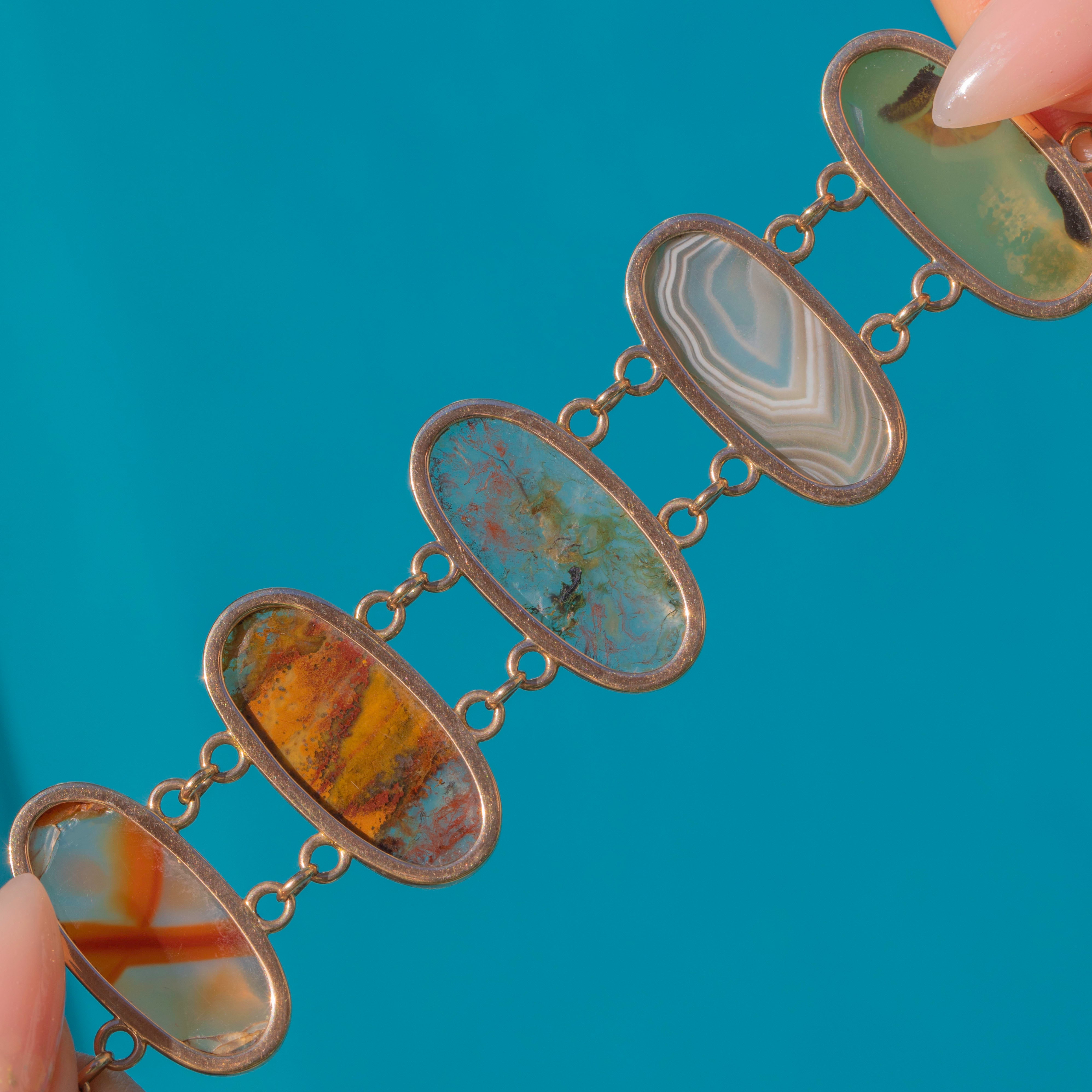 A striking Victorian Agate bracelet set with nine oval cabochons, each chosen for its unique patterning, think banded, mossy and scenic swirls in warm russets, honey and cool blue-greens. The stones are simply framed in 9ct Gold bezels and joined by petite trace links, giving lovely drape and movement on the wrist.
