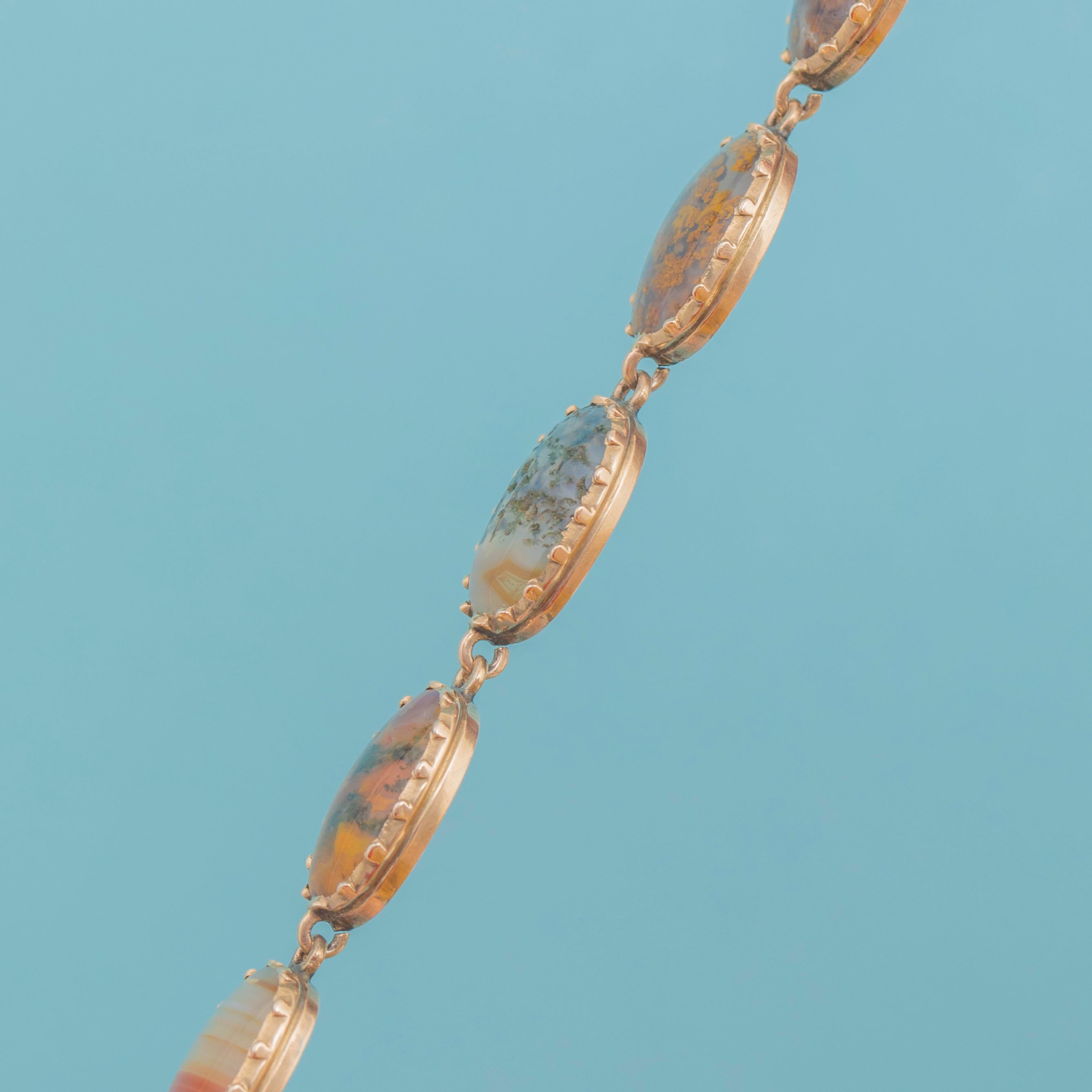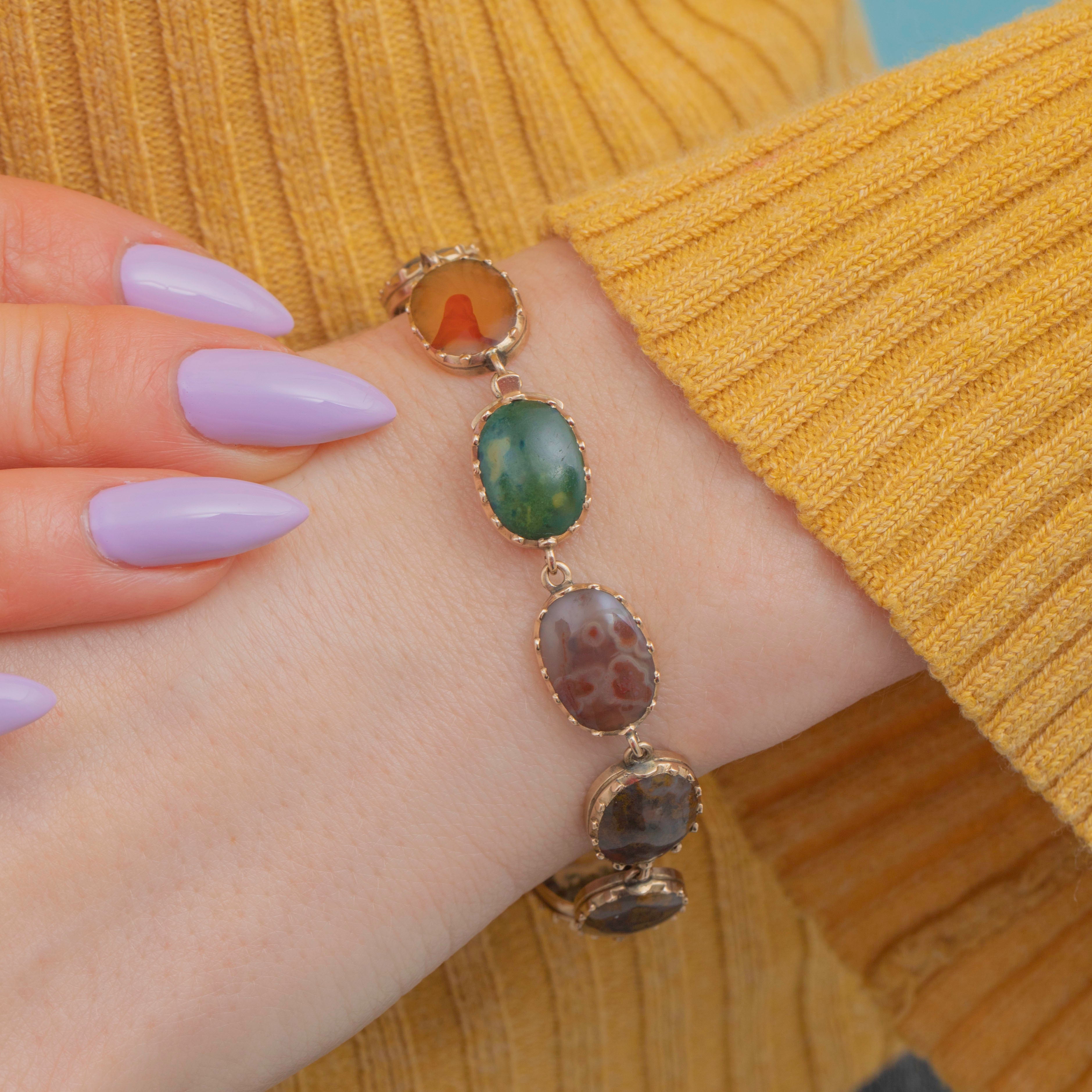 Crafted from buttery 9ct Gold, this antique bracelet features ten beautiful Agate stones, each distinct in its unique pattern and colour palette. From deep greens to brown speckles and red bands, each Agate rests comfortably within their piecrust settings, married by the warmth of the 9ct Gold.