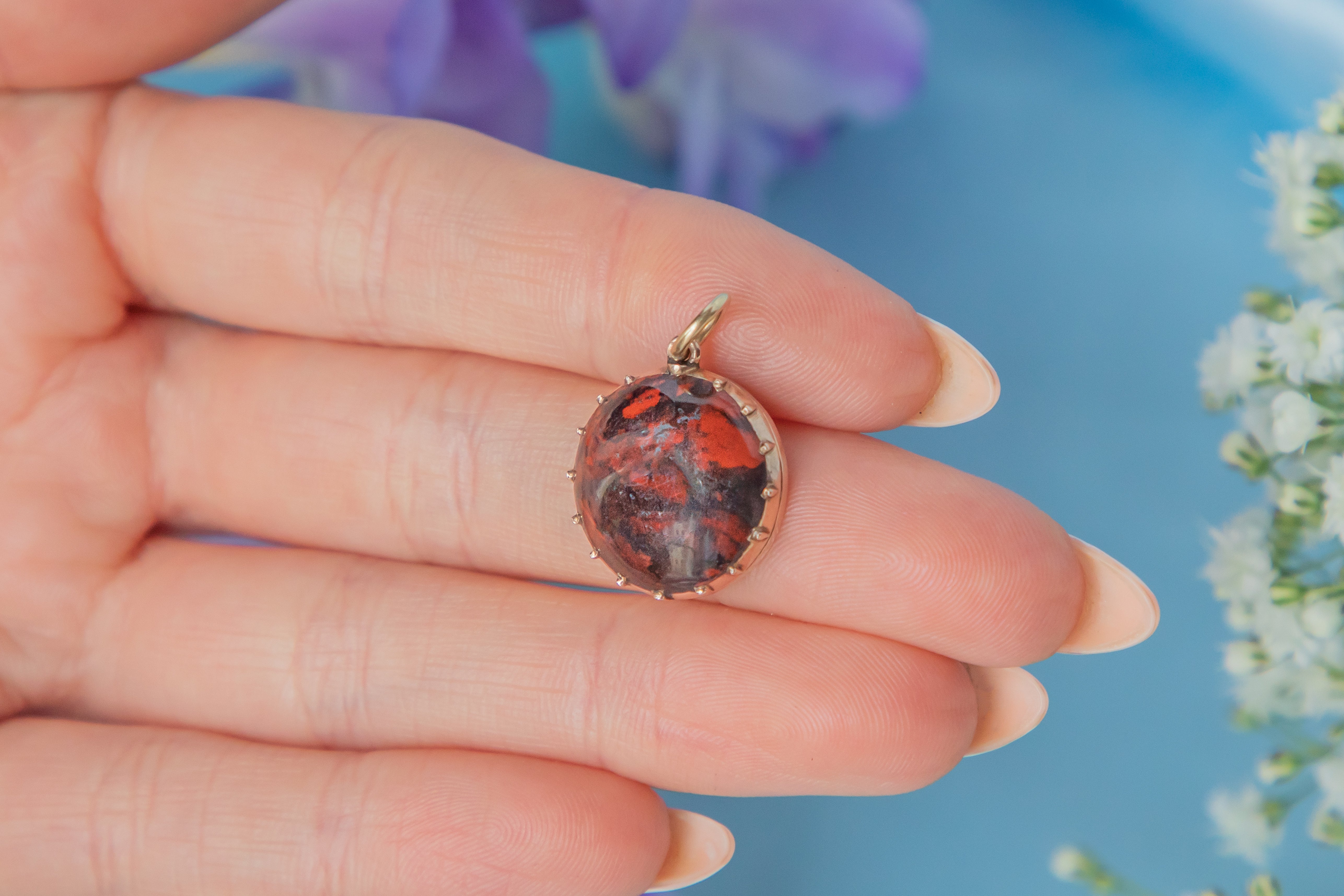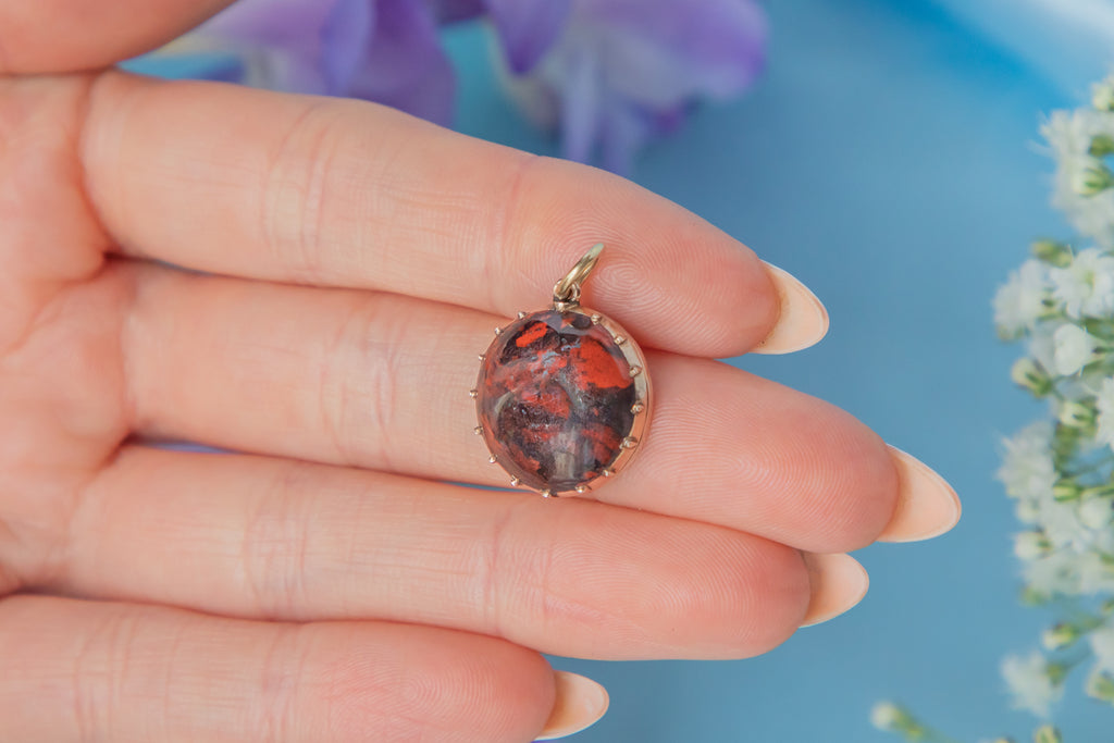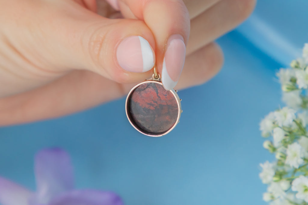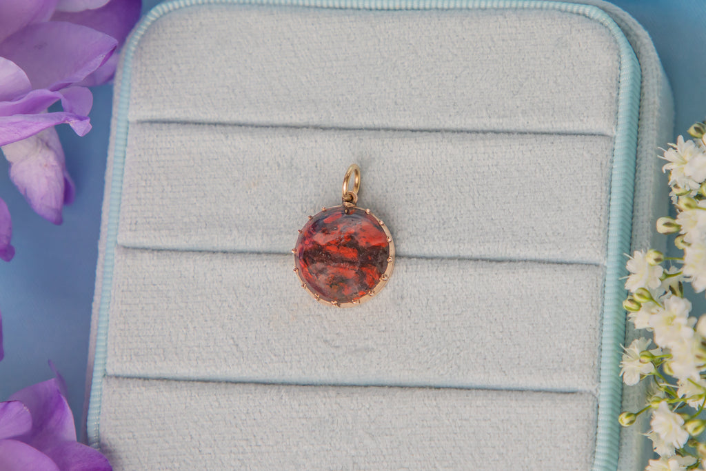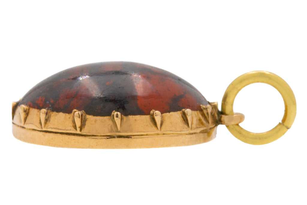 This Georgian 9ct Gold Agate pendant will seduce any onlooker who is lucky enough to lay eyes on her! A smooth Agate cabochon is poised at her centre, with deep sangria and black hues marbling across her surface. These irresistible tones are visible from both sides due to her open-back setting, a common characteristic within late Georgian jewellery.