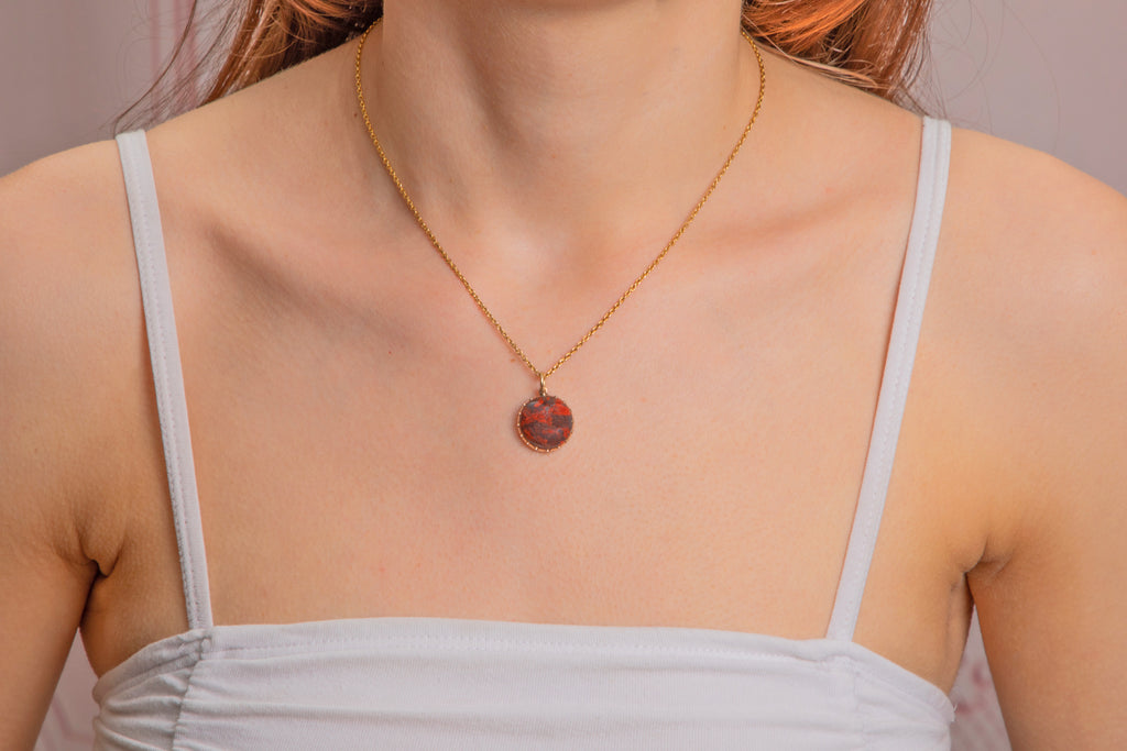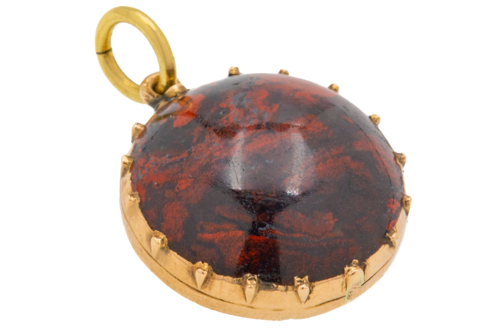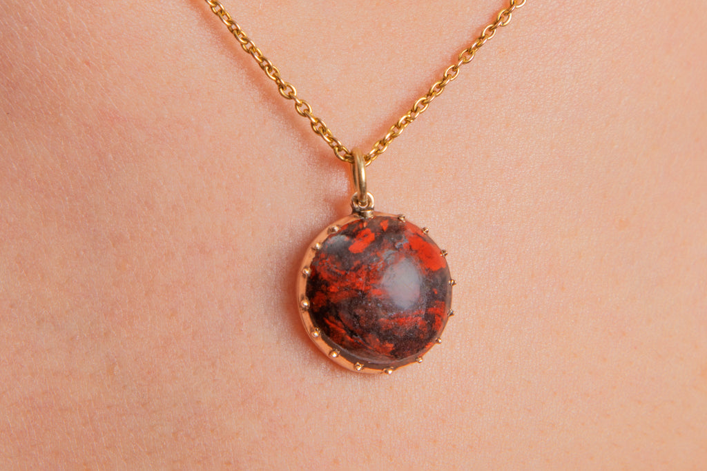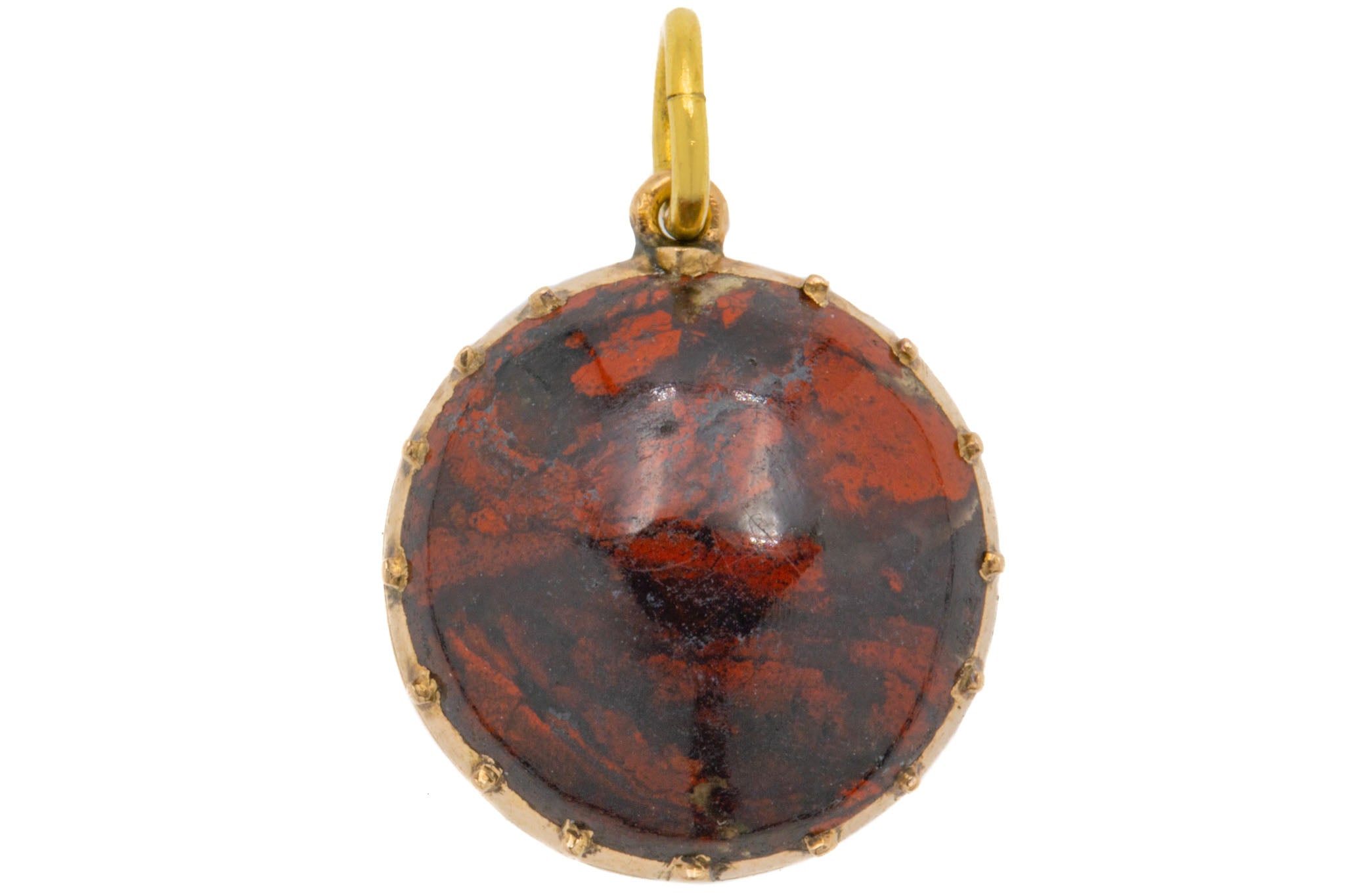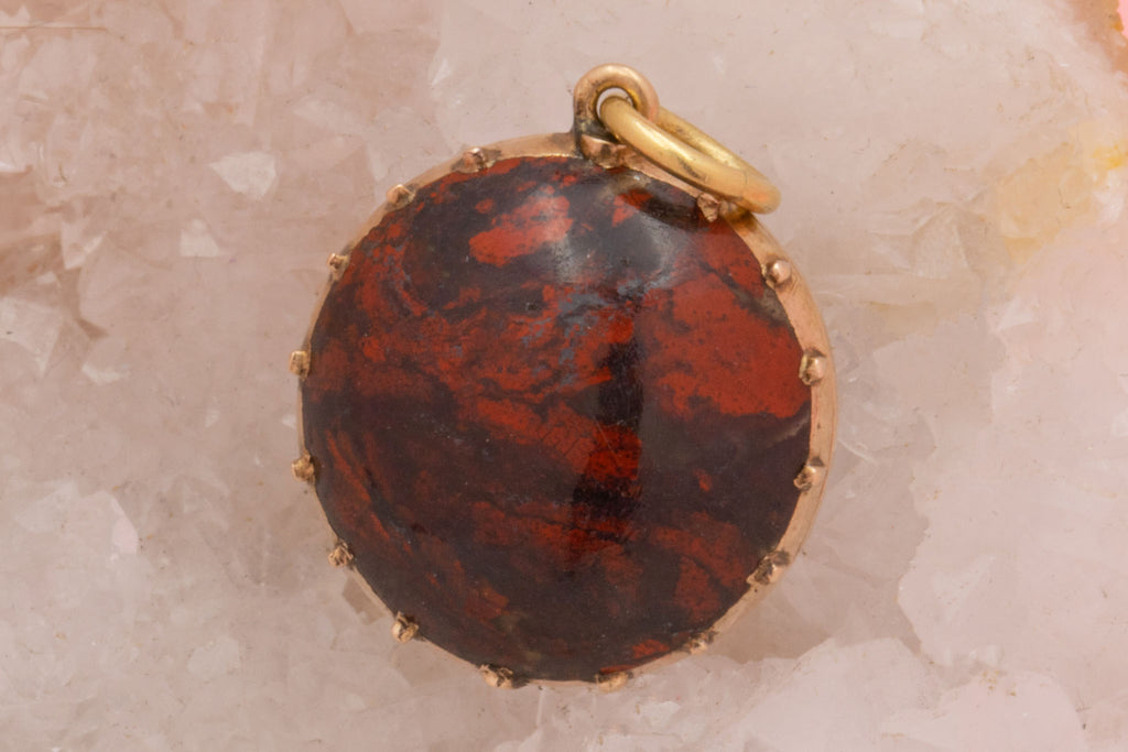 This Georgian 9ct Gold Agate pendant will seduce any onlooker who is lucky enough to lay eyes on her! A smooth Agate cabochon is poised at her centre, with deep sangria and black hues marbling across her surface. These irresistible tones are visible from both sides due to her open-back setting, a common characteristic within late Georgian jewellery.