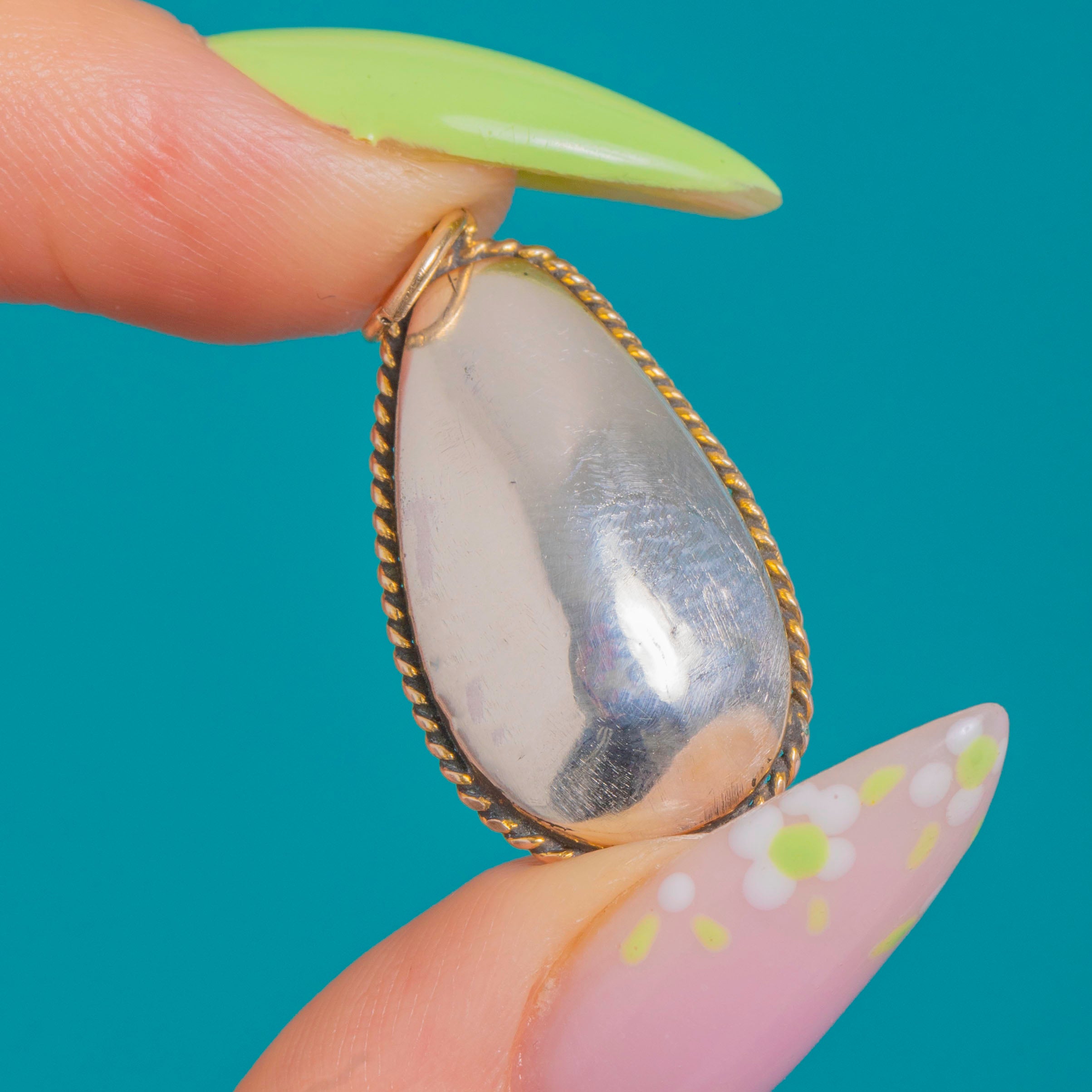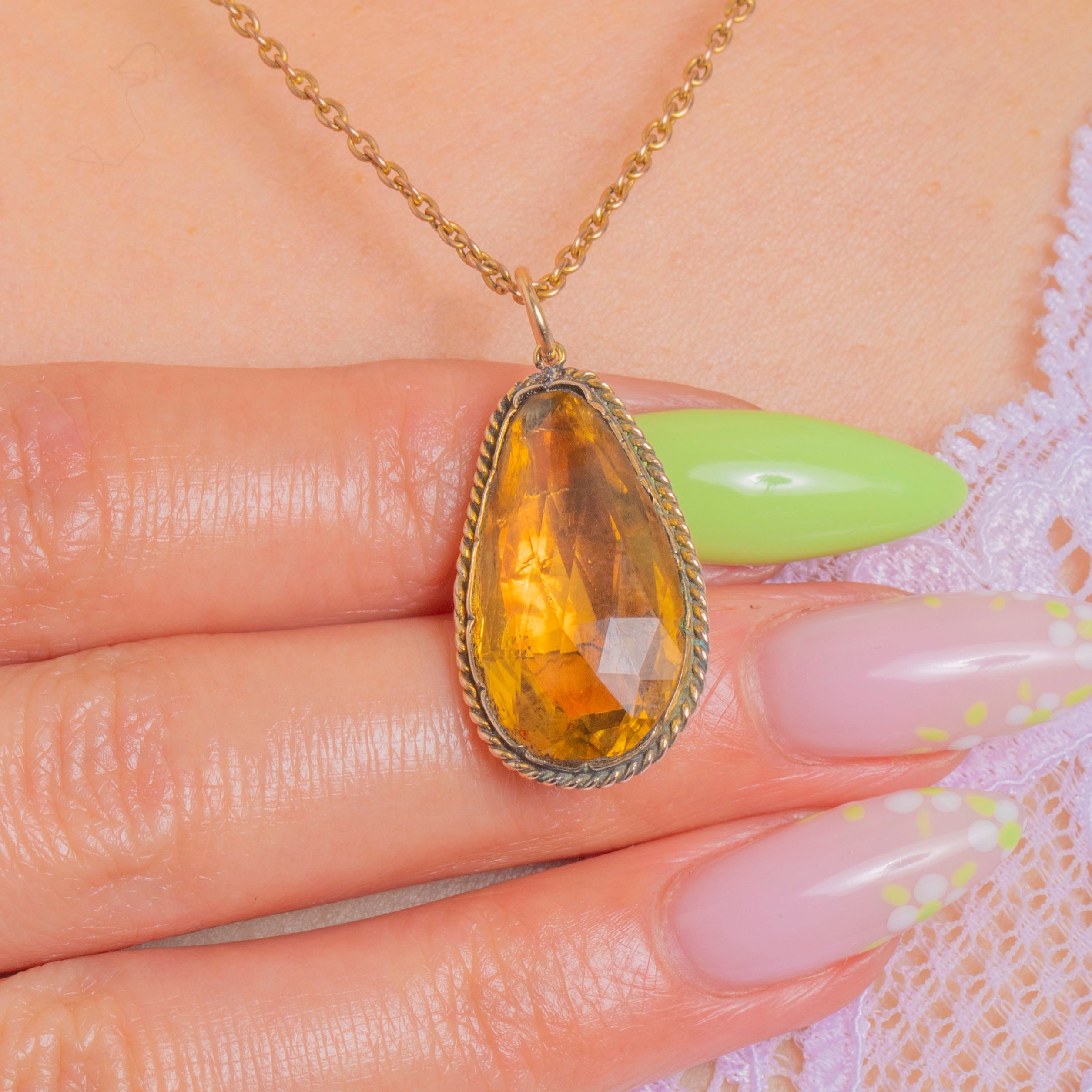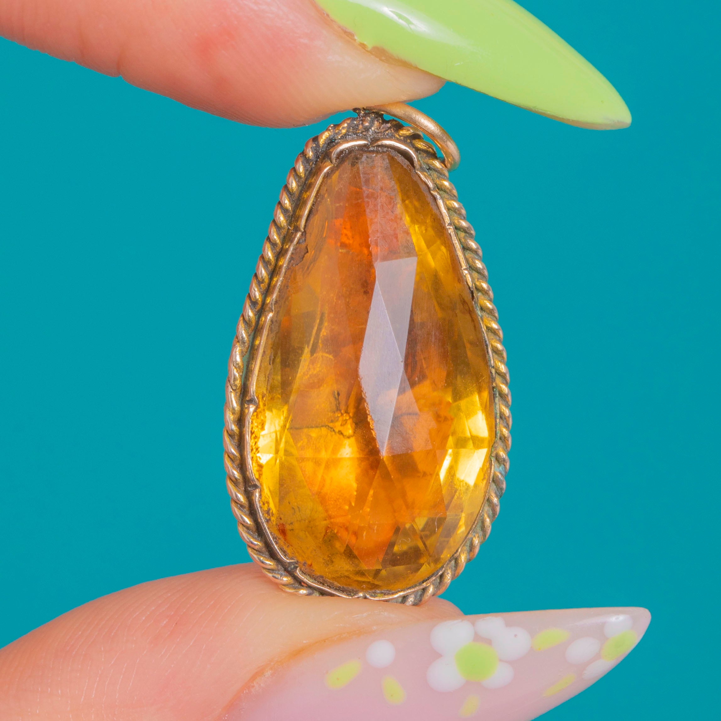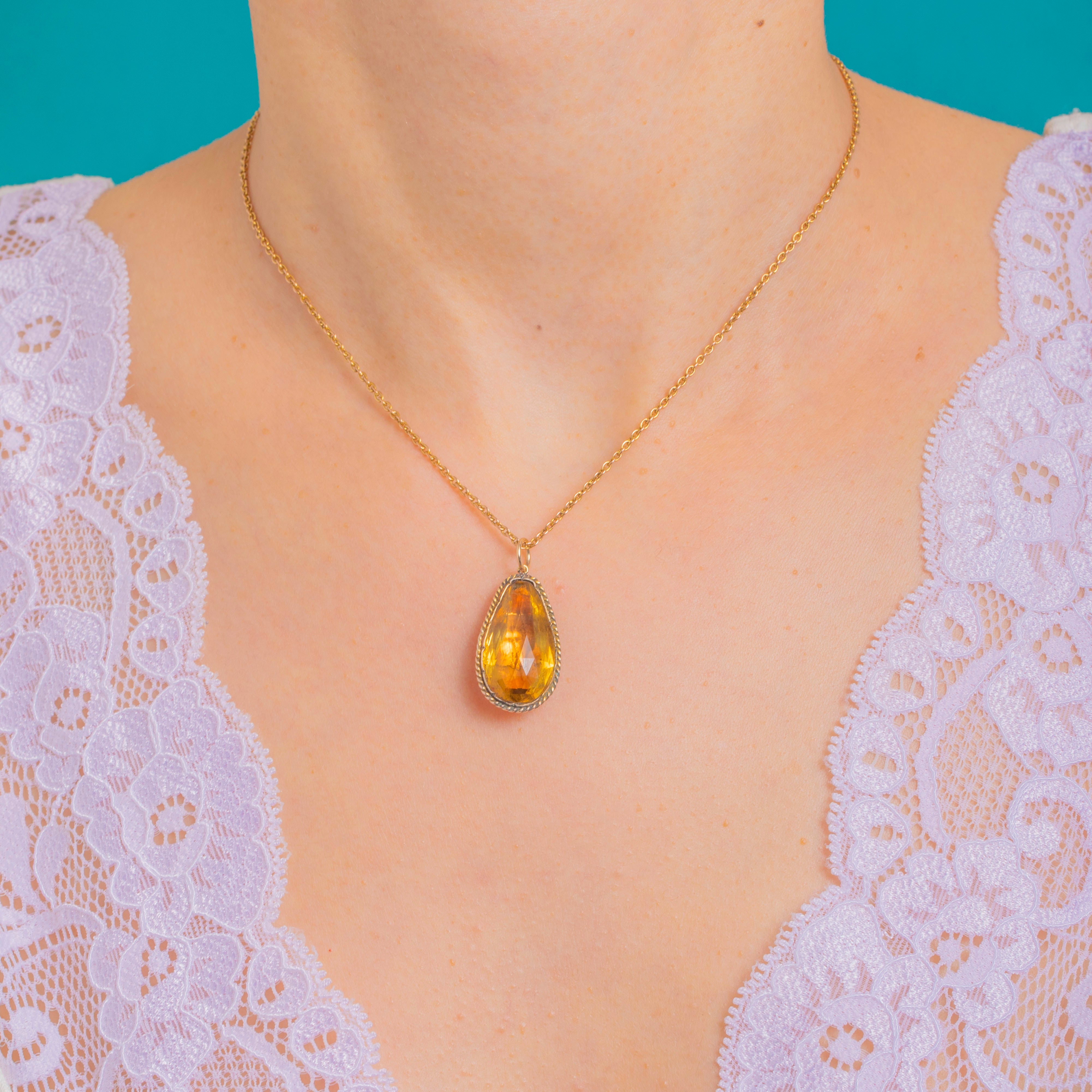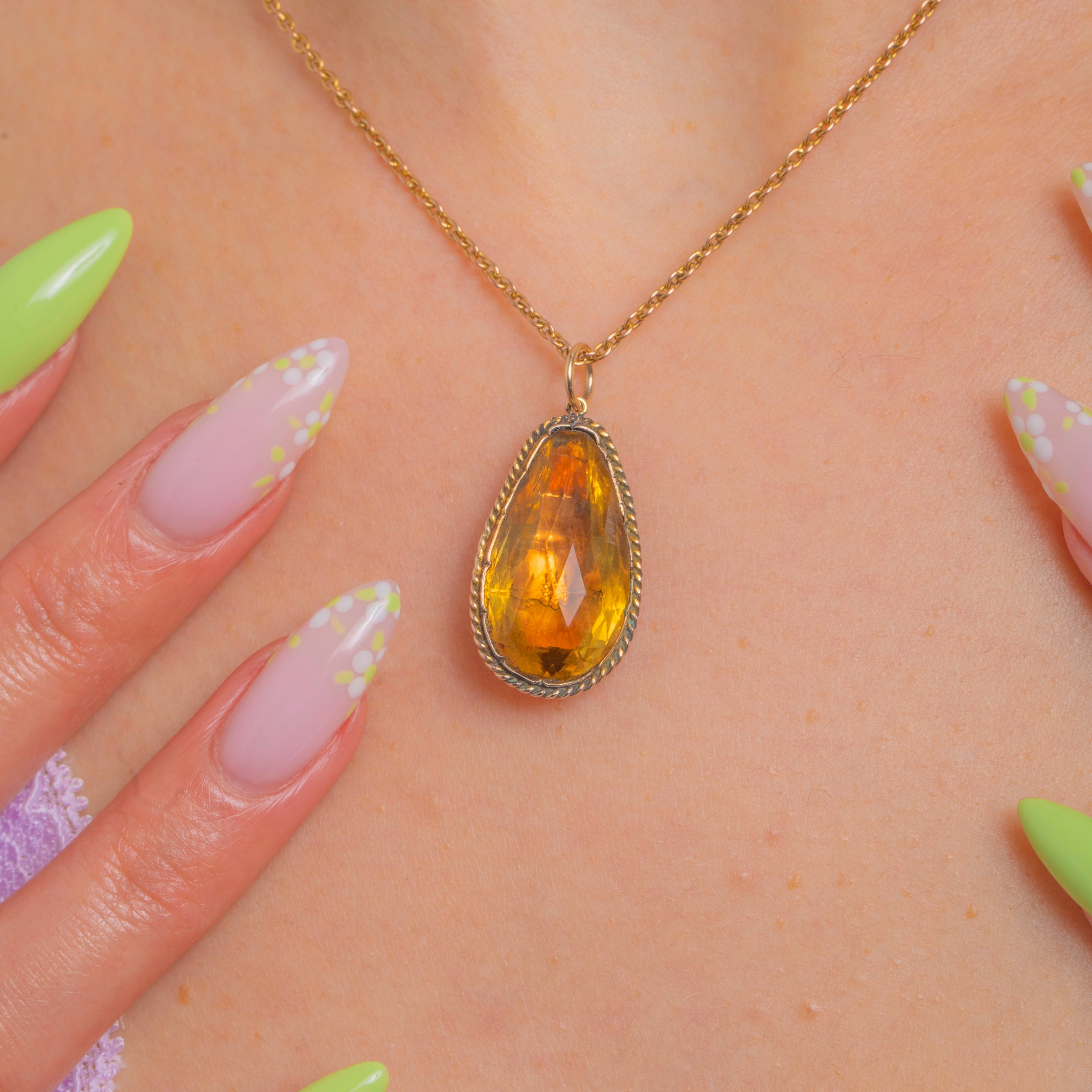 A luminous Georgian pear drop, this charming pendant glows with the warm, honeyed hue so loved in the period. The foiled, Silver-backed Topaz Paste is beautifully faceted to dance with the light, cradled in a closed-back 9ct Gold bezel and framed by a twisted rope border for tactile texture and timeless romance.