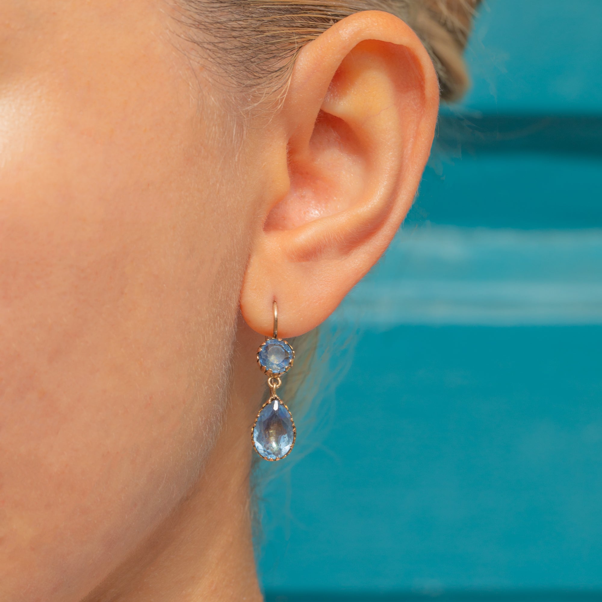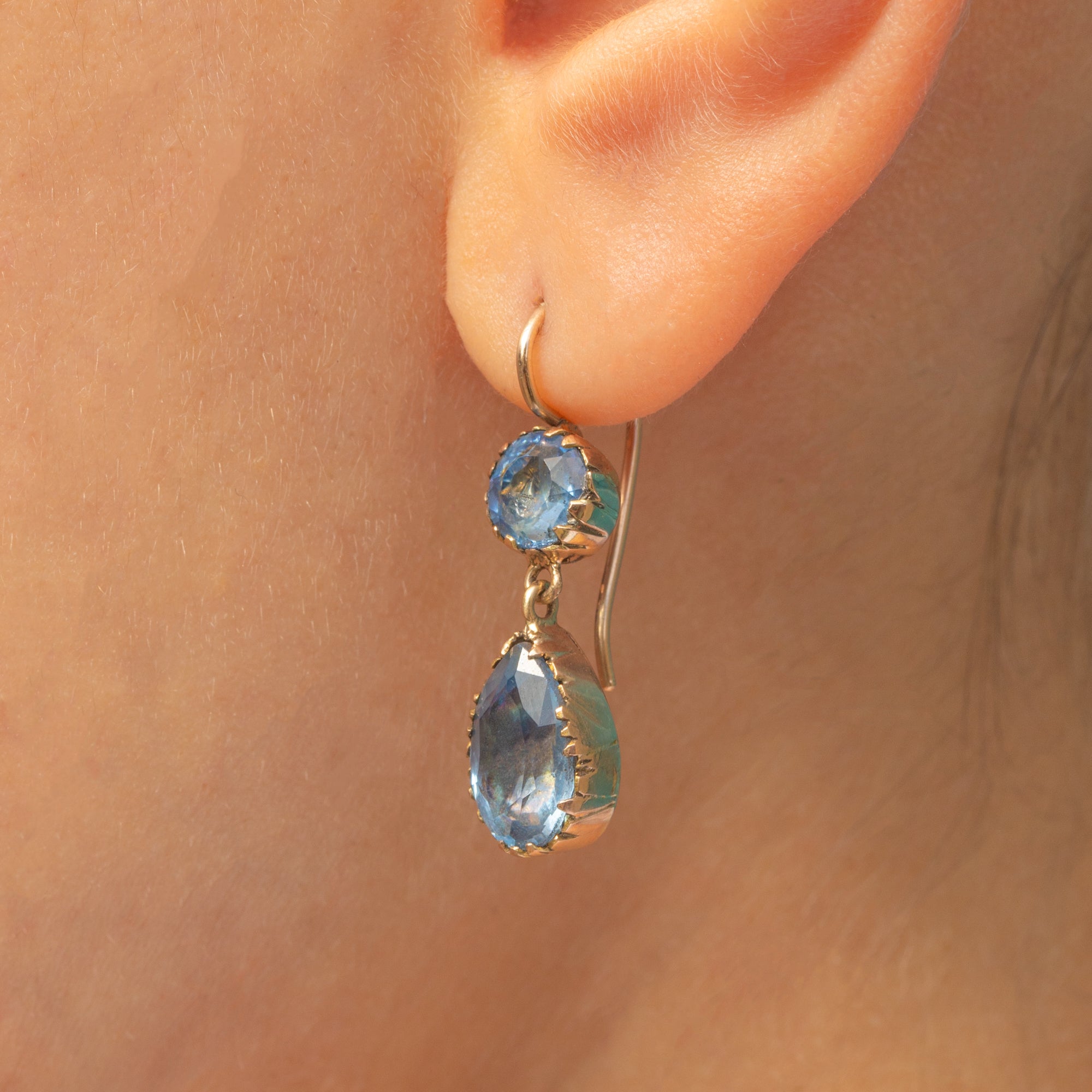 This gorgeous pair of antique earrings each suspends two vibrant blue faceted Paste stones, foiled for added vibrancy, and set in classically Georgian settings.